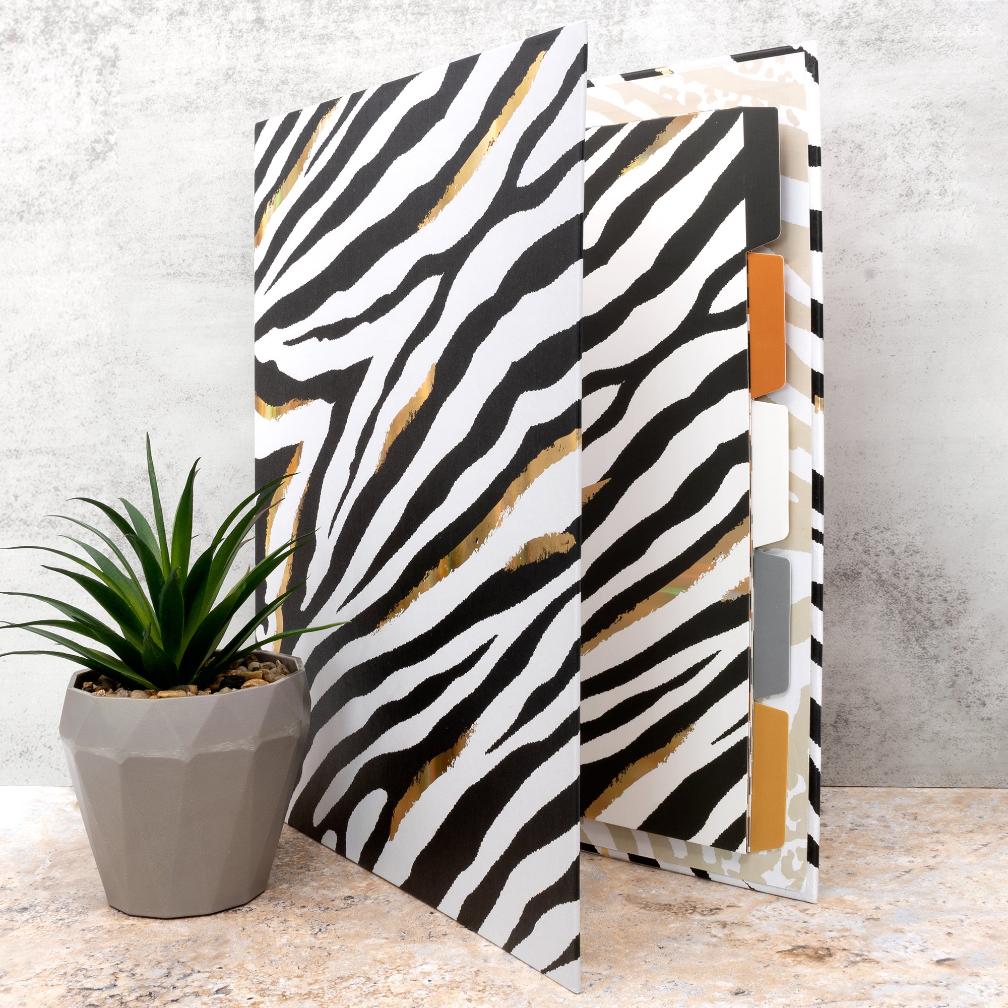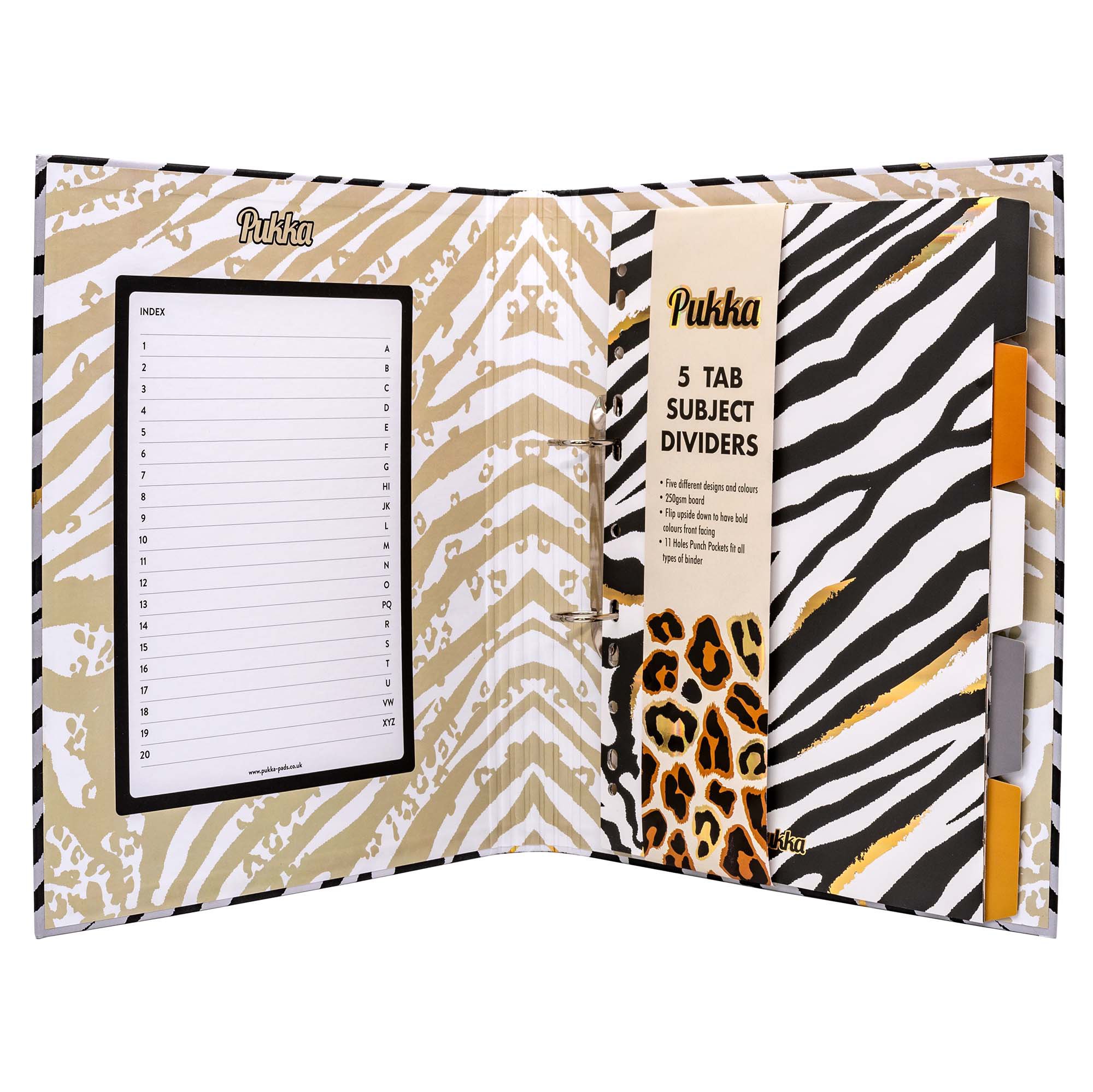 Release your inner wild side with our brand new range of fierce animal print stationery. Our Wild A4 rollbound file is ideal for filing and storing A4 documents and papers securely. The filing system ensures that your workspace is clutter-free and still looks great! The Wild rollbound ring binder is A4 in size, perfect for storing A4 documents like school revision notes or work files. It also features a standard D-ring mechanism and includes a pre-loaded 5 part Wild divider set. The pre-loaded 5 assorted subject dividers are excellent for organising your paperwork and projects. They are made from 250GSM board and are 11 hole punched and are already loaded into the Wild zebra print ring binder.