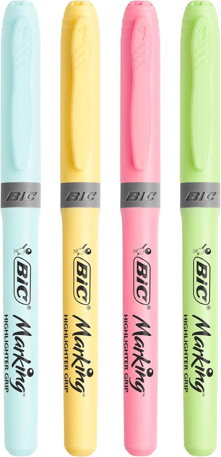 The BIC Marking Highlighter Flat contains 4 pastels highlighter pens that are reliable and versatile and consist of quick-drying water-based ink that won't bleed through paper. This pack They have an adjustable chiselled nib: just angle it for thick 4.6 mm highlighting and twist it for superfine 1.2 mm underlining. <br>The BIC Marking Flat Highlighter brightens up your notes and neatly colour-codes them with a palette of 4 eye-popping pastel colours, yellow, green, pink, and blue.