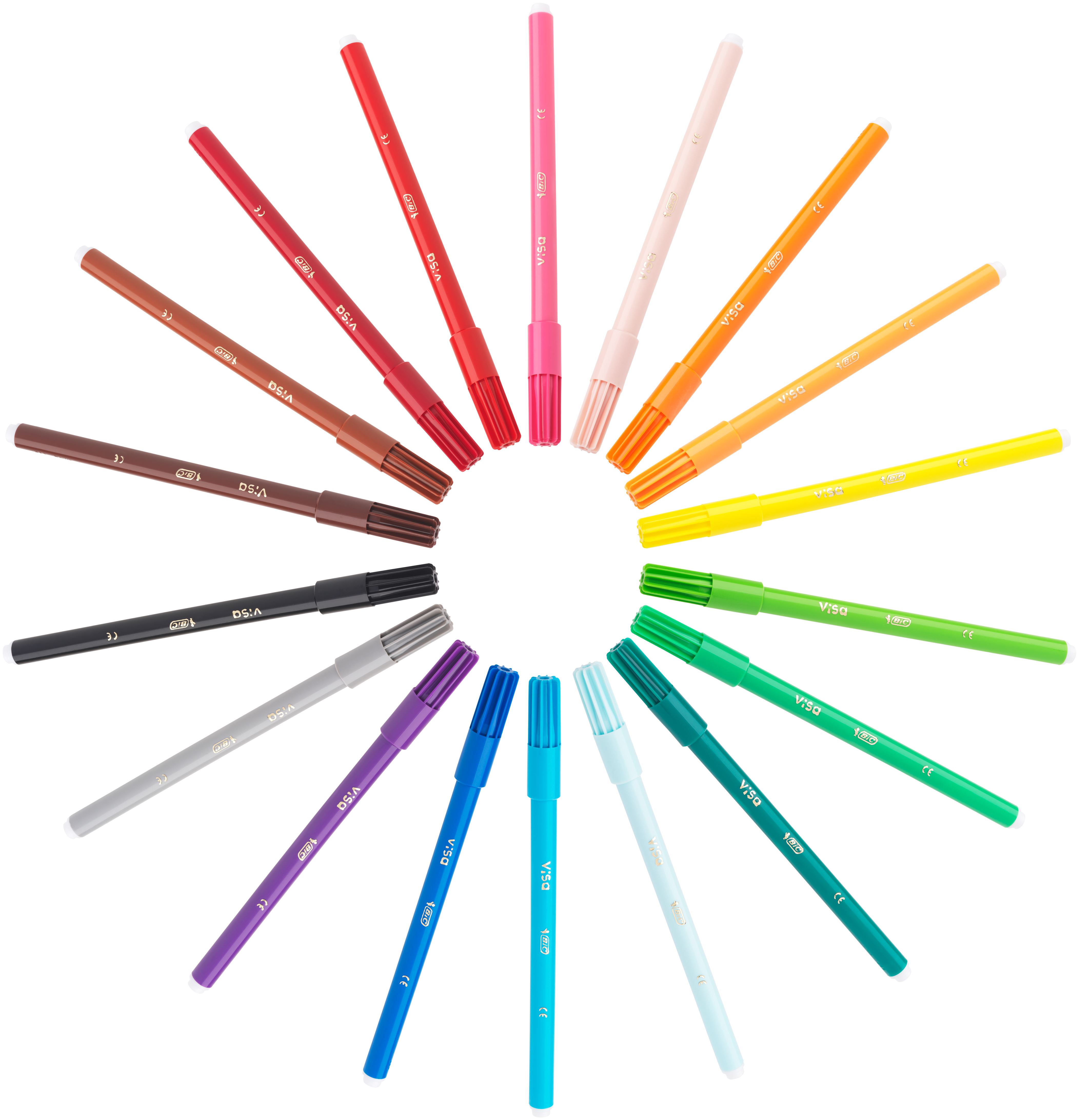 BIC KIDS Visa colouring felt pens are a fantastic way to get young children to fine-tune their art work, with the fine tip giving them greater accuracy. Available in 12 bright colours, the pens use water-based ink that will wash out of most clothes. The fine tips will not dry out, even if your kids leave the caps off for 3 months*. <br>(*Except black ink)