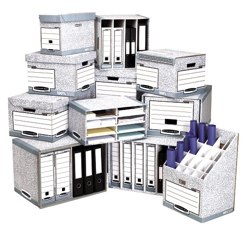 Bankers Box by Fellowes System A4 Transfer Files are ideal for the storage of A4 documents and come with FastFold automatic set up and locking tab lid for additional security. FastFold enables quick and easy assembly so your file is ready in seconds. These corrugated cardboard transfer files are ideal for information that you frequently refer to eg sales reports and documents and can be used with Fellowes System storage units or filed in System storage boxes for your documents that require infrequent access and archiving. They are made from FSC certified 100% recycled board and are 100% recyclable and are suitable for use in your home office, at work, or on the move between home and work for transferring files and paperwork. The System range offers a simple and effective total document management system. Whether it is for use in the office or your home office the System range provides an integrated storage solution for all your business filing and storage needs. This modular system consists of space optimising products for all stages of the document lifecycle, from establishing a filing system to long-term document archiving and storage.