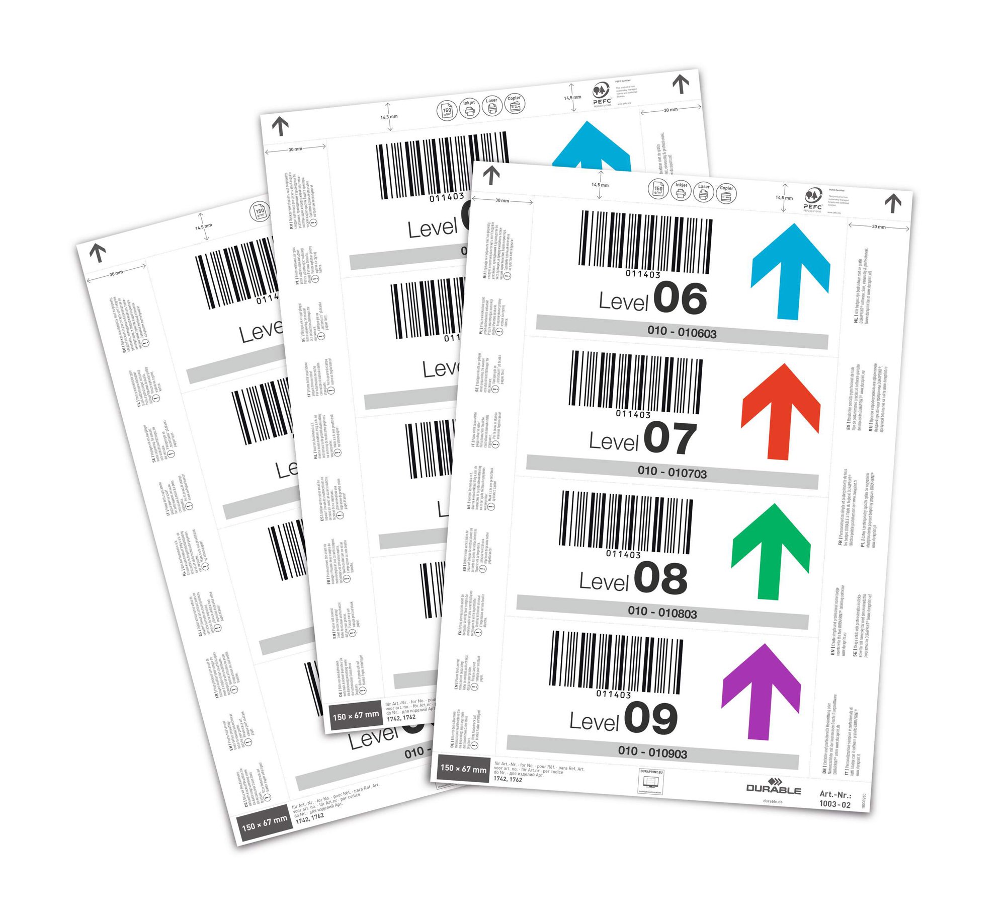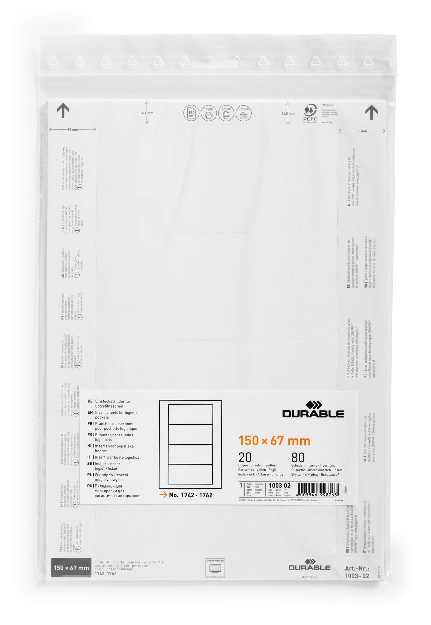 Insert Sheets for Ticket Holders for quick and easy professional labelling in minutes. Creating small labels for warehouses and retail stores shouldn't be time consuming. This is why we have created a range of printable, micro-perforated insert labels which are quick and easy to use.<br><br>Durable insert sheets are high quality 150 gsm PEFC-certified card stock. They come from sustainably managed forests and are environmentally friendly in accordance with ISO 14021: 100% recyclable.<br><br>The sheets are A4 and Compatible with laser and inkjet printers.<br><br>Perfect for DURABLE products # 176207, 174207 & 174204<br><br>Page size: A4<br>Ticket dimensions: 150 x 67 mm<br>Pack size: 20 sheets<br>Total labels: 80<br><br>Made in Germany