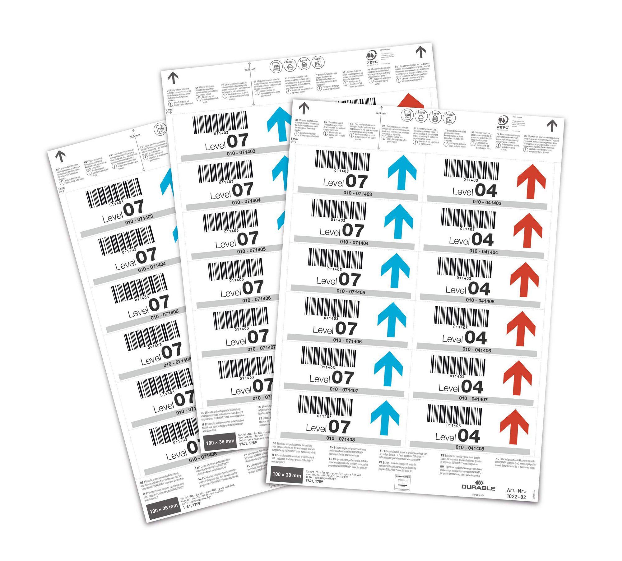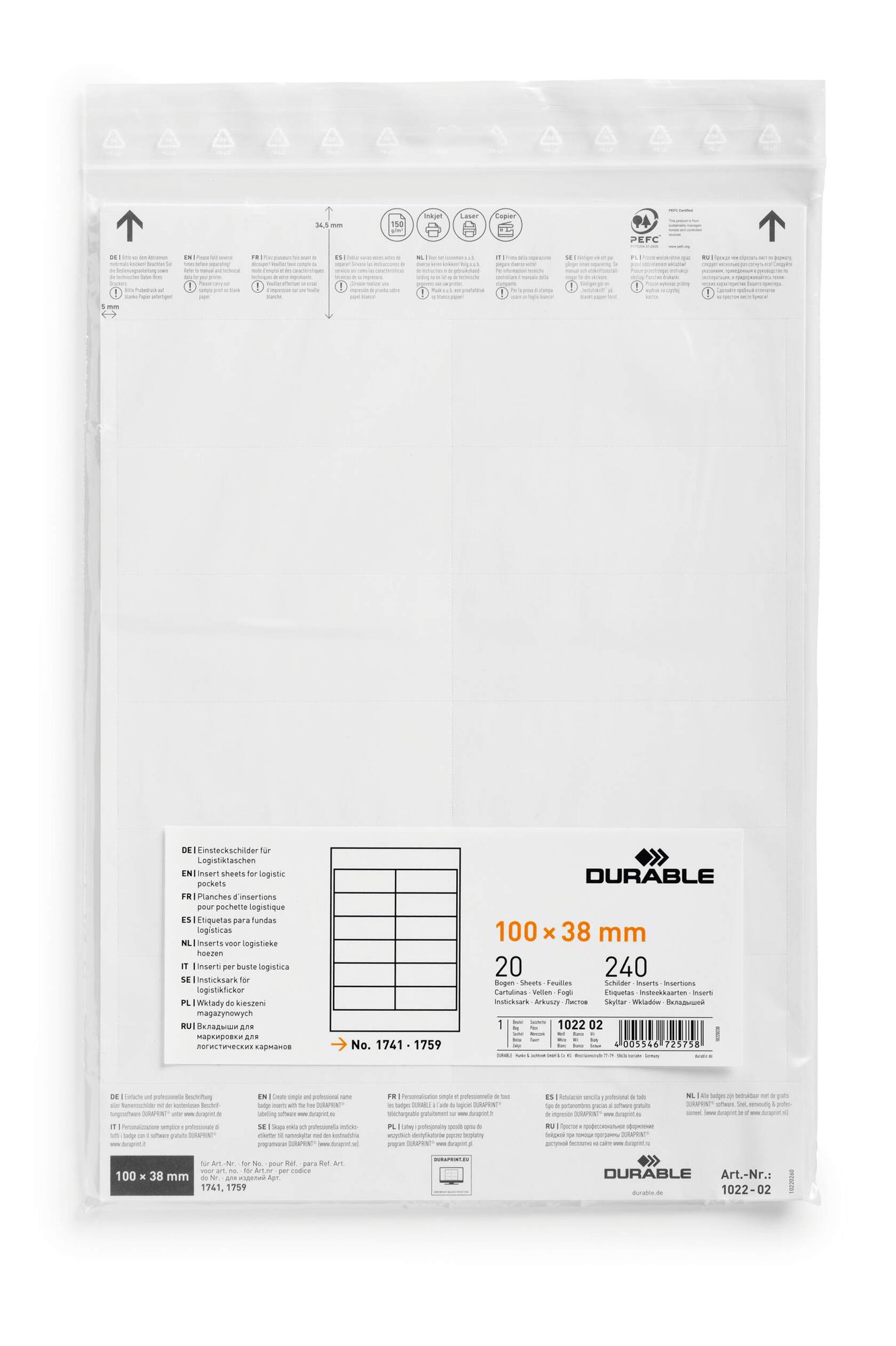 Insert Sheets for Ticket Holders for quick and easy professional labelling in minutes. Creating small labels for warehouses and retail stores shouldn't be time consuming. This is why we have created a range of printable, micro-perforated insert labels which are quick and easy to use.<br><br>Durable insert sheets are high quality 150 gsm PEFC-certified card stock. They come from sustainably managed forests and are environmentally friendly in accordance with ISO 14021: 100% recyclable.<br><br>The sheets are A4 and Compatible with laser and inkjet printers.<br><br>Perfect for DURABLE products # 175907, 174107 & 174104<br><br>Page size: A4<br>Ticket dimensions: 100 x 38 mm<br>Pack size: 20 sheets<br>Total labels: 240<br><br>Made in Germany