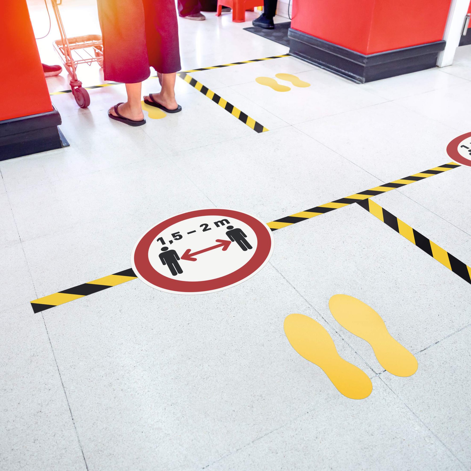 A range of removable adhesive indoor floor marking shapes perfect for social distancing rules, walkways and wayfinding.<br><br>They are abrasion resistant, hard-wearing and feature R9 slip resistance.<br><br>Self-adhesive type: Removable <br>Colour: RAL 1003 signal yellow<br>Technical standards: ASR A1.3 and DIN EN ISO 7010<br>Slip resistance: R9 (DIN 51130 standard)<br>Width: 90 mm<br>Length: 240 mm<br>Quantity: 5 Pairs (10)<br><br>Made in Germany