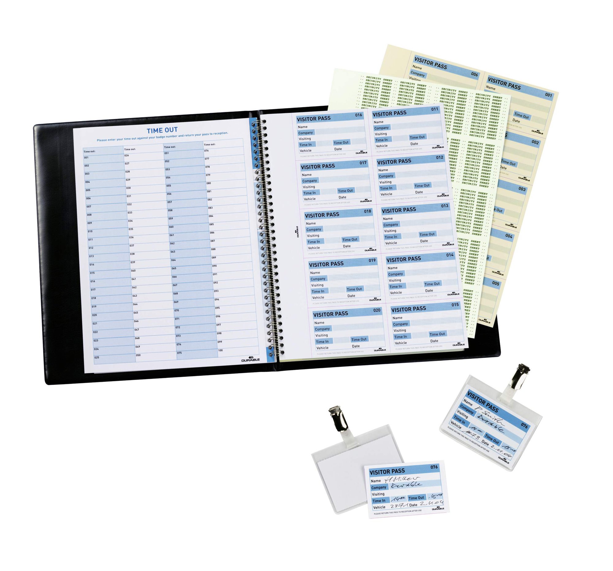 This practical visitors book features a professional PU leather cover and comes with 100 easy to Compatiblelete badge inserts. Once Compatibleleted the micro-perforated badge inserts are easy to remove and insert into your choice of name badge.<br><br>All key details such as name, Compatibleany, reg, and duration of the visit are duplicated to provide permanent visitor records. A security sheet ensures Compatiblelete visitor confidentiality and helps support GDPR.<br><br>A simple time out sheet is also provided so that each visitor can check out when leaving the building.<br><br>(Refills available from Durable # 146465)<br><br>Badge inserts: 100 x 60 x 90mm<br>Book dimensions: 317 x 251 mm