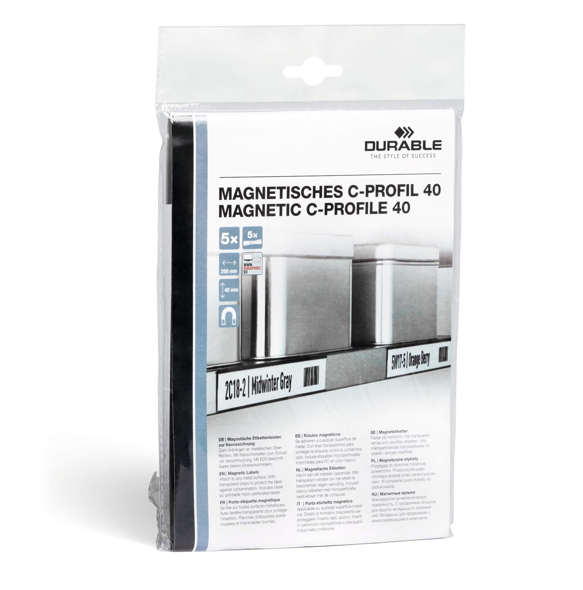 Magnetic c-profile ticket holder that is perfect for quickly and clearly labelling metal surfaces such as racking, shelving, and drawers, etc.<br><br>The ticket holders include insert labels and a clear anti-glare cover to protect tickets against dust and dirt. The practical c-profile makes exchanging inserts easy and provides a secure hold.<br><br>Includes 2 printable A5 labelling sheets with 6 pre-perforated inserts.<br><br>Compatible with Durable inserts (product # 809902)<br><br>Colour: Charcoal<br>Can be cut to size: Yes<br>Dimensions: 40 x 200 mm<br>Insert dimensions: 37 x 200 mm<br>Quantity: 5<br><br>Designed in Germany and built to last