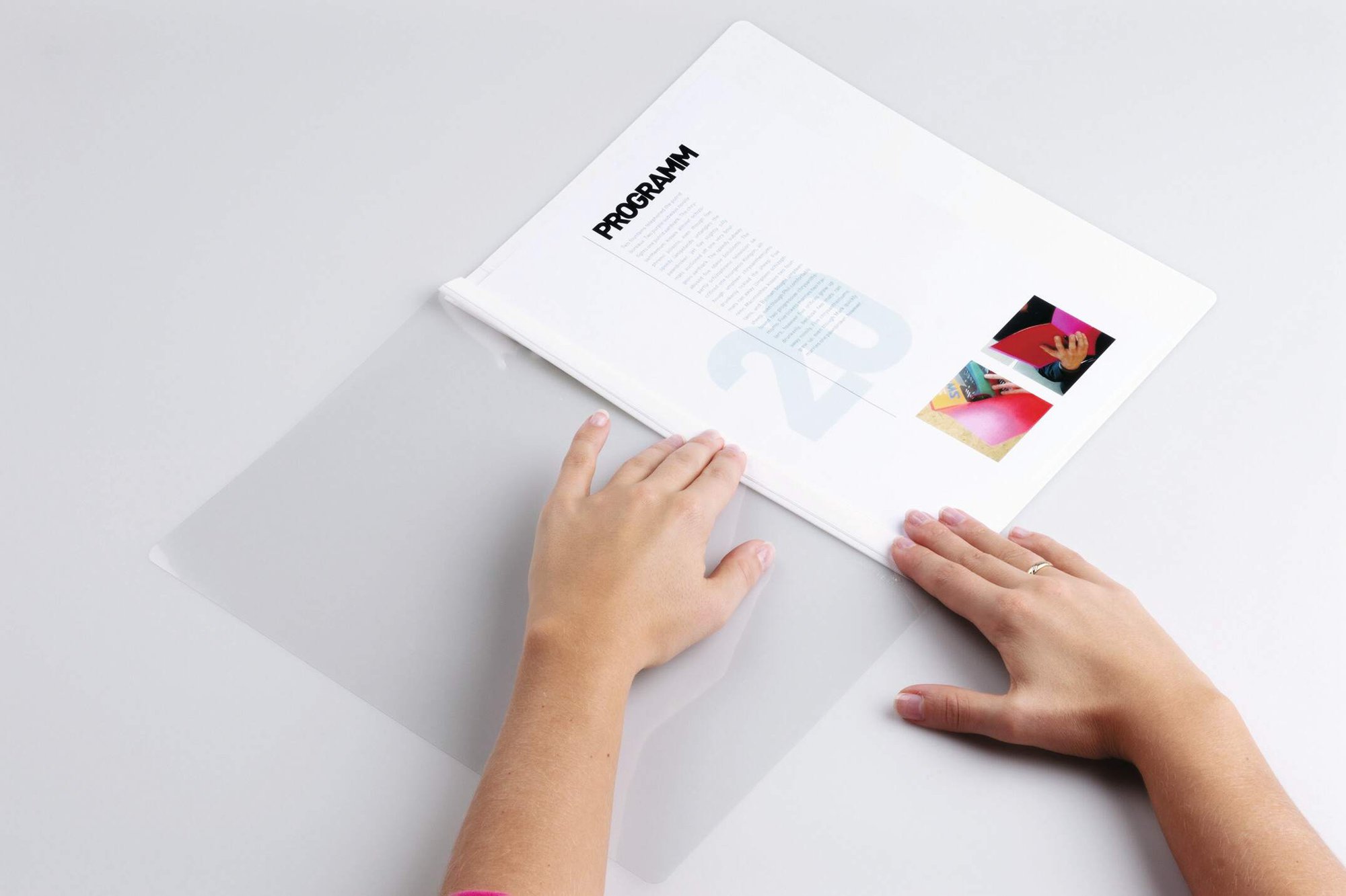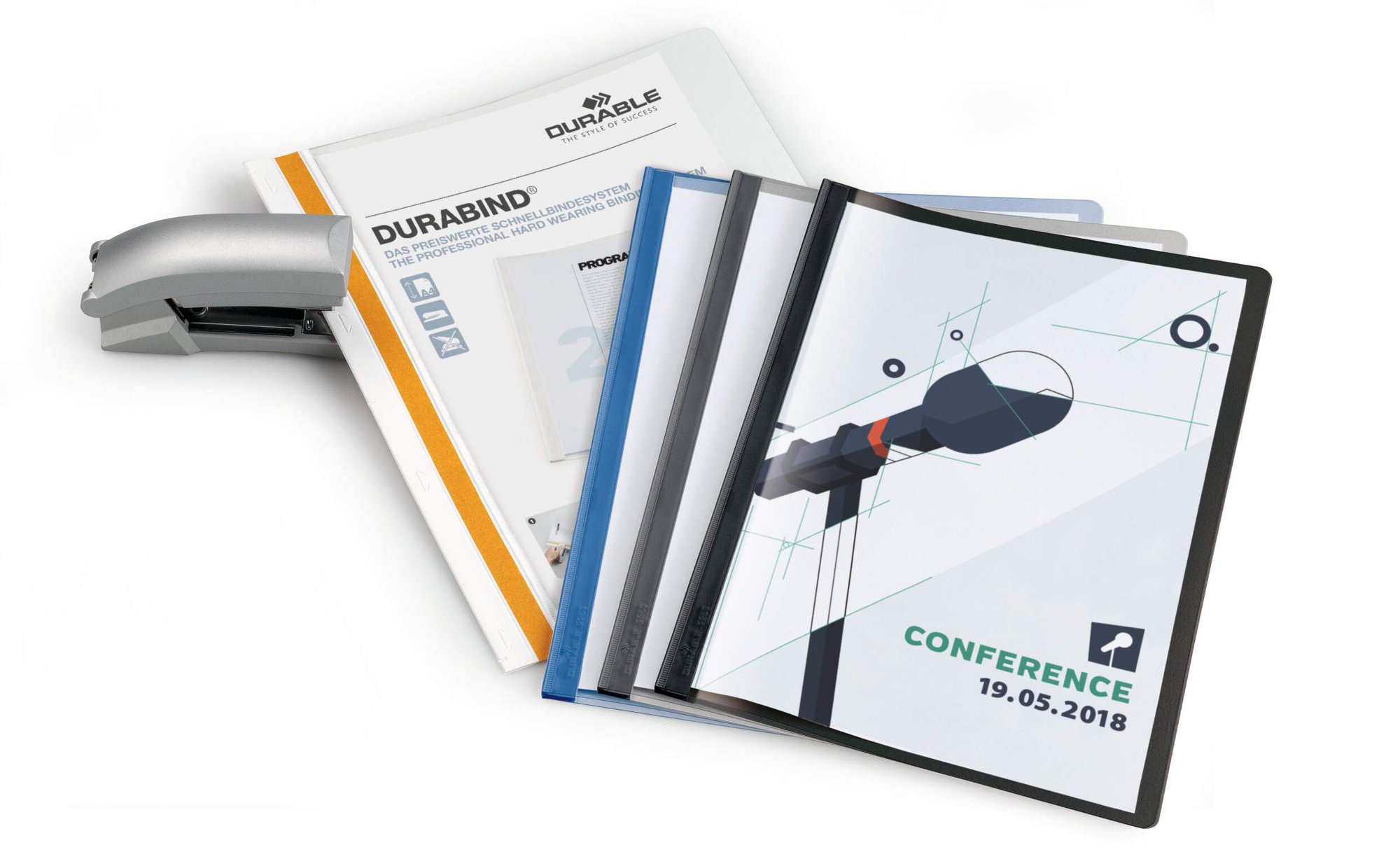 The simple permanent binding system from DURABLE - effortless, quick and professional. Clear front cover, coloured PVC back cover with fold-out filing strip for storing DURABIND in files and ring binders.<br><br>How DURABIND works in 3 easy steps: <br><br>1. Insert the document and staple at the four marked points.<br><br>2. Remove the protective backing from the self-adhesive strip and fold the front cover over to the left so that the adhesive strip covers the stapled edge. Press firmly into place!<br><br>3. Fold the front cover back to the right along the scored line. Repeat steps 2 and 3 for the back cover.<br><br>No need for big and expensive laminating machines<br><br>Punching: 70/80 mm<br>Capacity: 1-30 A4 sheets <br><br>Made in Germany and built to last