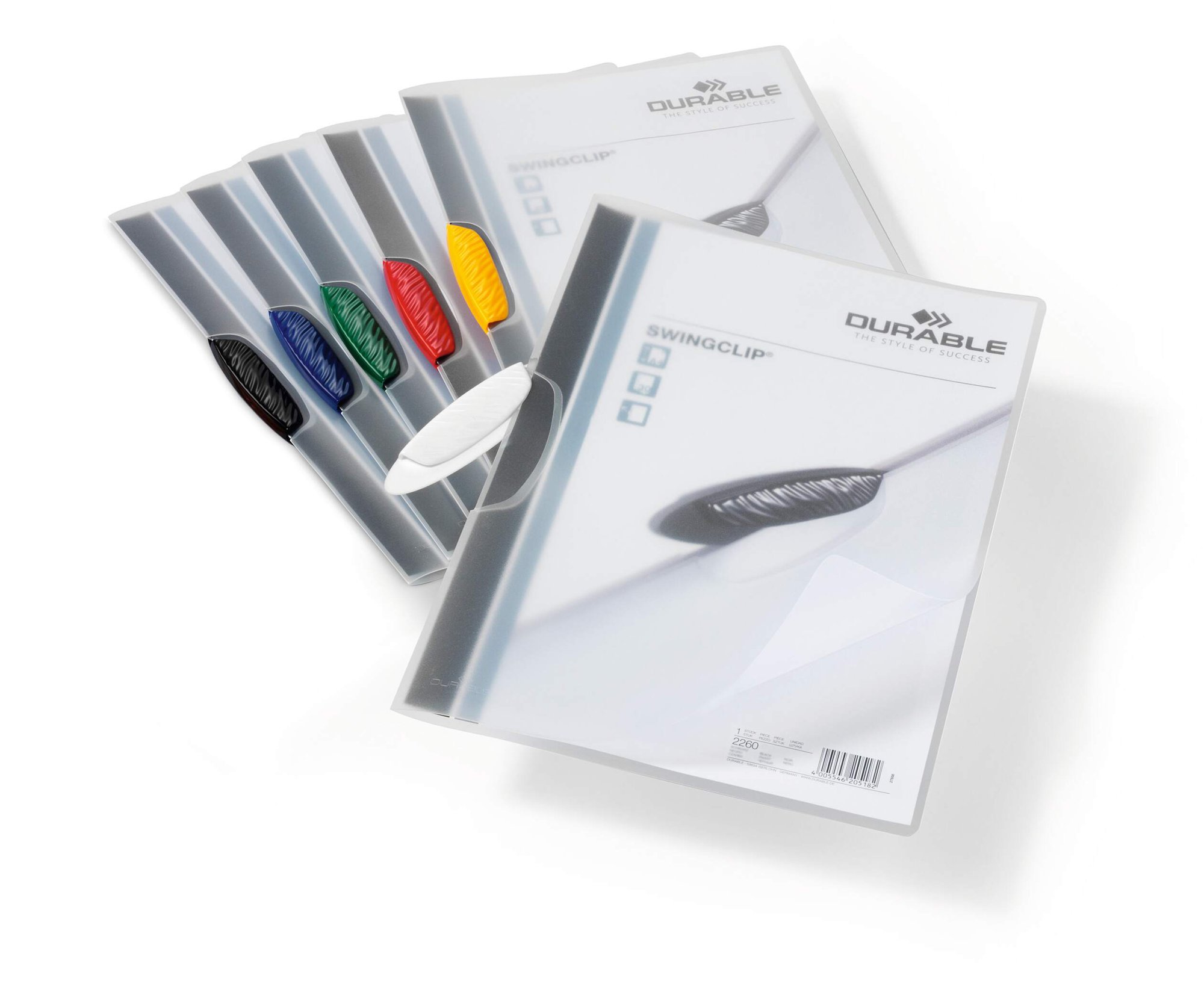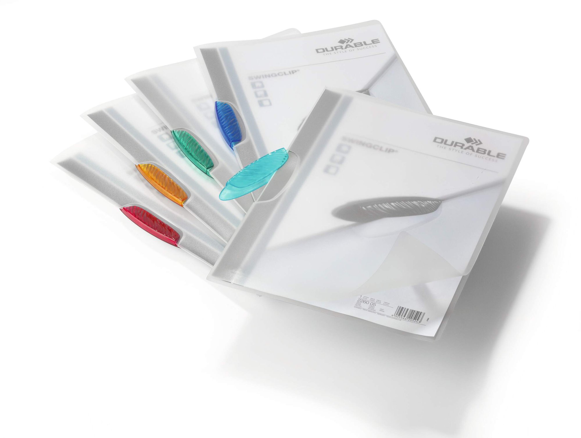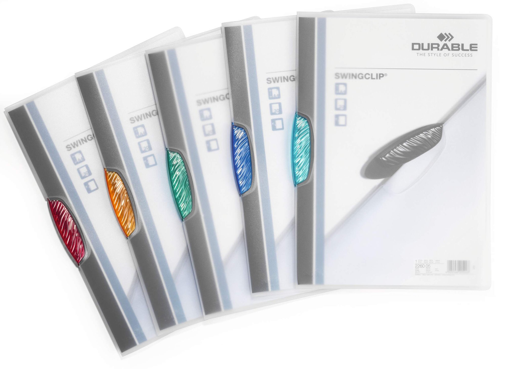 The Durable SWINGCLIP is made of translucent anti-glare, anti-tear polypropylene, one file is capable of securely holding and protecting 1-30 sheets of A4 paper.<br><br>There's no need to punch holes or staple your documents, simply swing the clip out, insert your documents and close the clip.<br><br>Environmentally friendly in accordance with ISO 14021: 100% recyclable<br><br>Includes:<br><br>5x Black<br>5x Red<br>5x Yellow<br>5x Green<br>5x Dark Blue