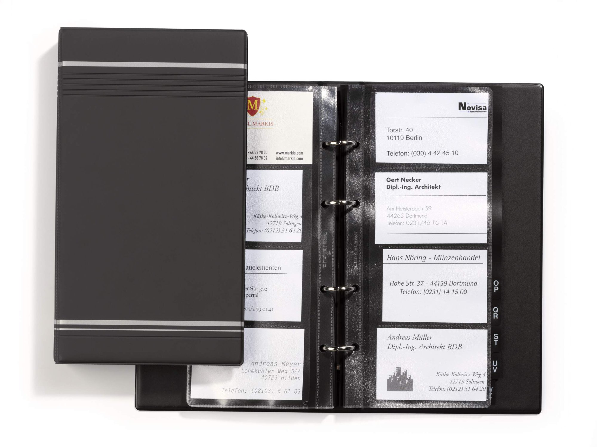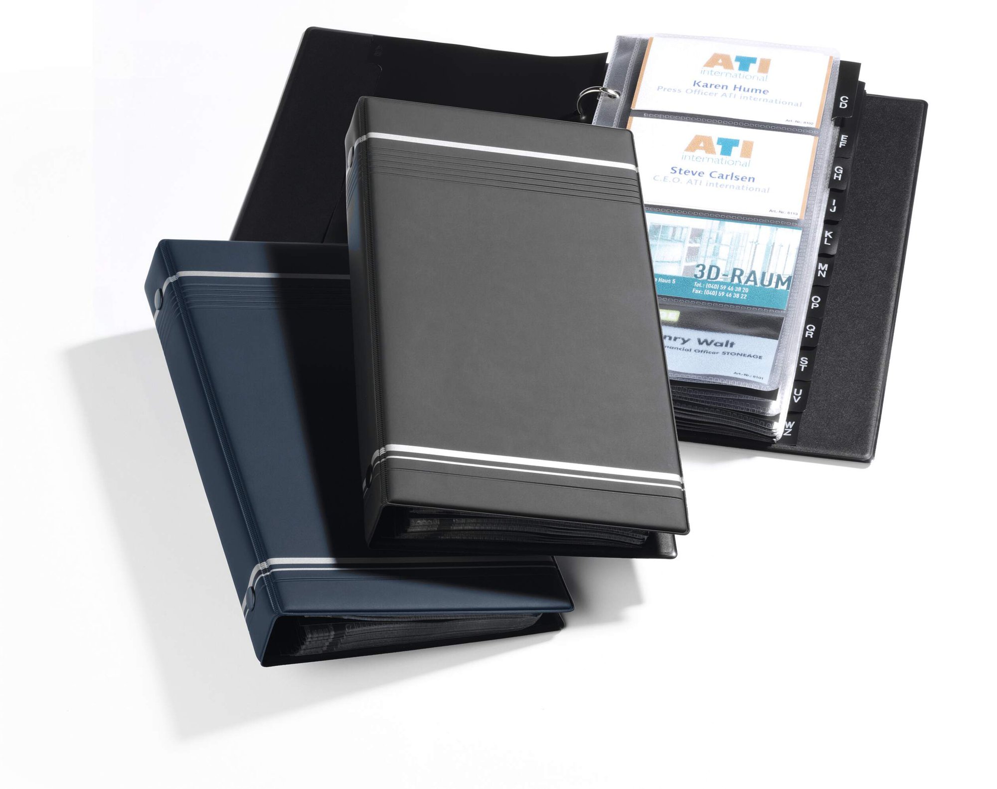 VISIFIX is a modern German designed business card album with a professional smooth finish cover and signature silver stripes. It includes a 12 part A-Z index and 25 crystal clear anti-tear reinforced pockets for improved legibility and durability.<br><br>Store business cards in a simple, efficient way with this stylish ring binder. Eco friendly in accordance with ISO 14021: 30% recycled and 100% recyclable.<br><br>(Extendable by 80 cards with pockets #238719)<br><br>Capacity: 25 sleeves for 200 business cards<br>Card dimensions: 90 x 57 mm<br>Book dimensions: 255 x 315 mm
