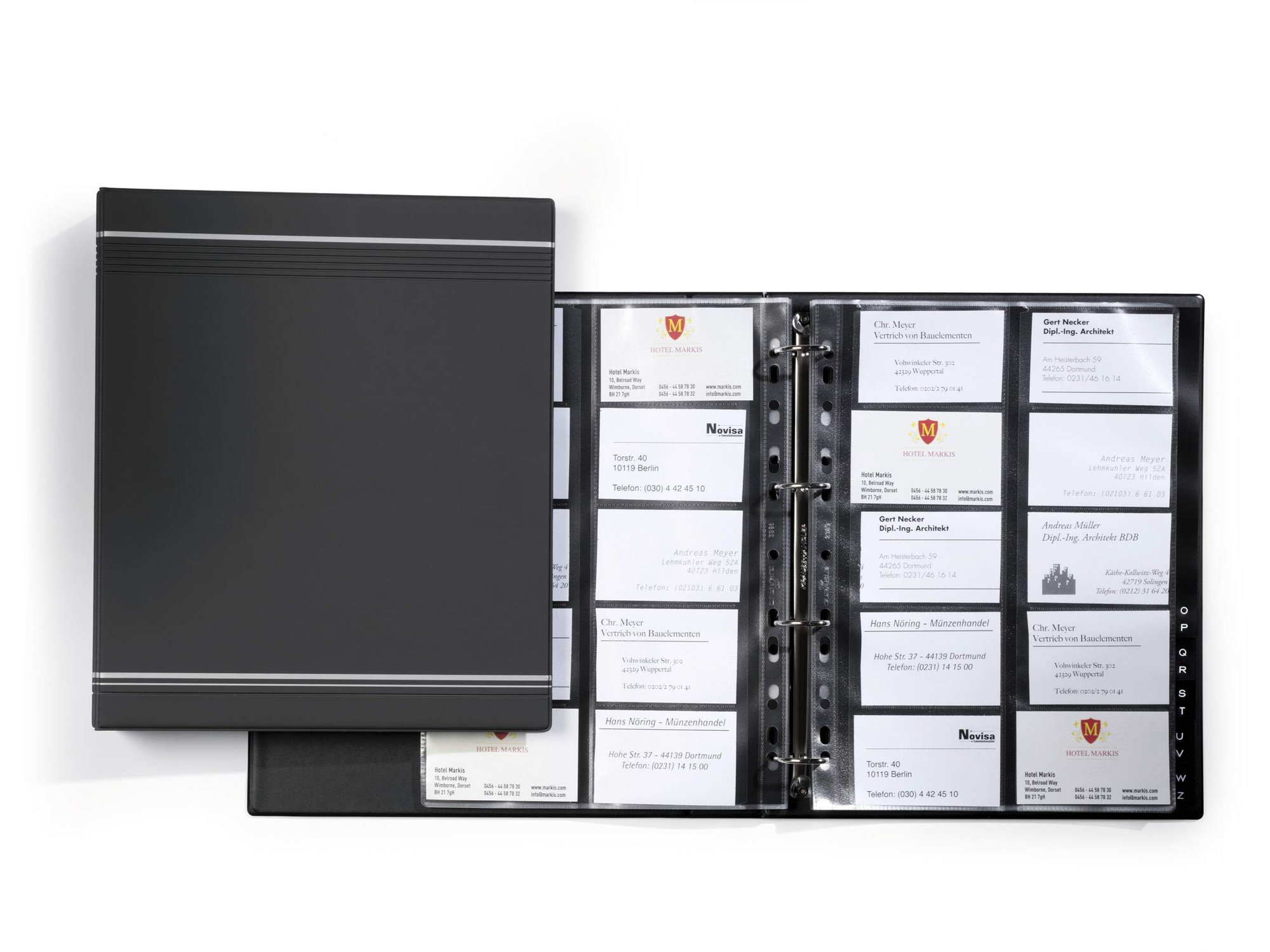 VISIFIX is a modern German designed business card album with a professional smooth finish cover and signature silver stripes. It includes a 12 part A-Z index and 20 crystal clear anti-tear reinforced pockets for improved legibility and durability.<br><br>Store business cards in a simple, efficient way with this stylish ring binder. Eco friendly in accordance with ISO 14021: 30% recycled and 100% recyclable.<br><br>(Extendable by 200 cards with pockets # 2389)<br><br>Capacity: 20 sleeves for 400 business cards<br>Card dimensions: 90 x 57 mm<br>Book dimensions: 255 x 315 mm