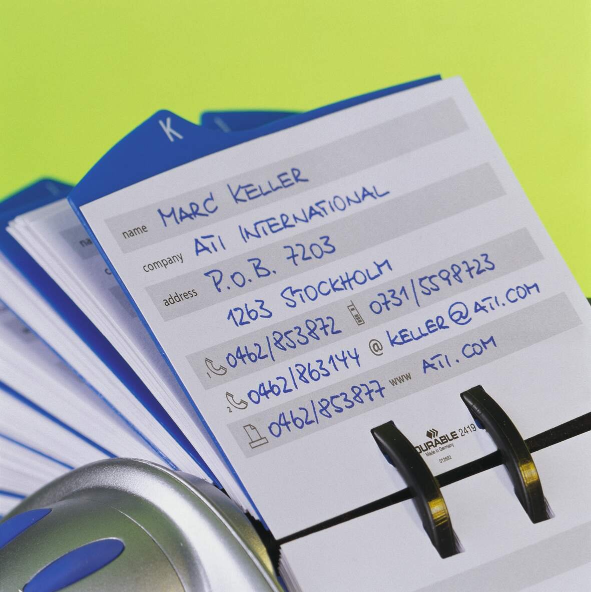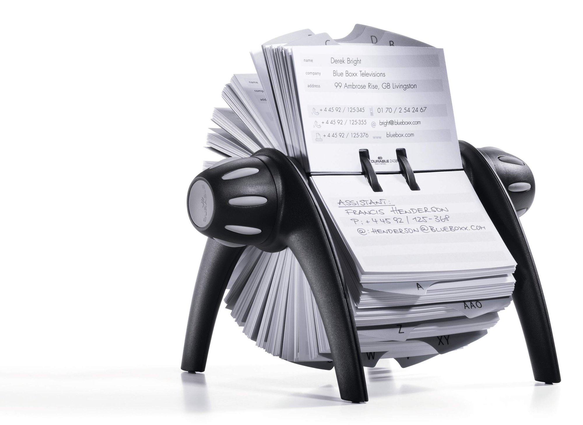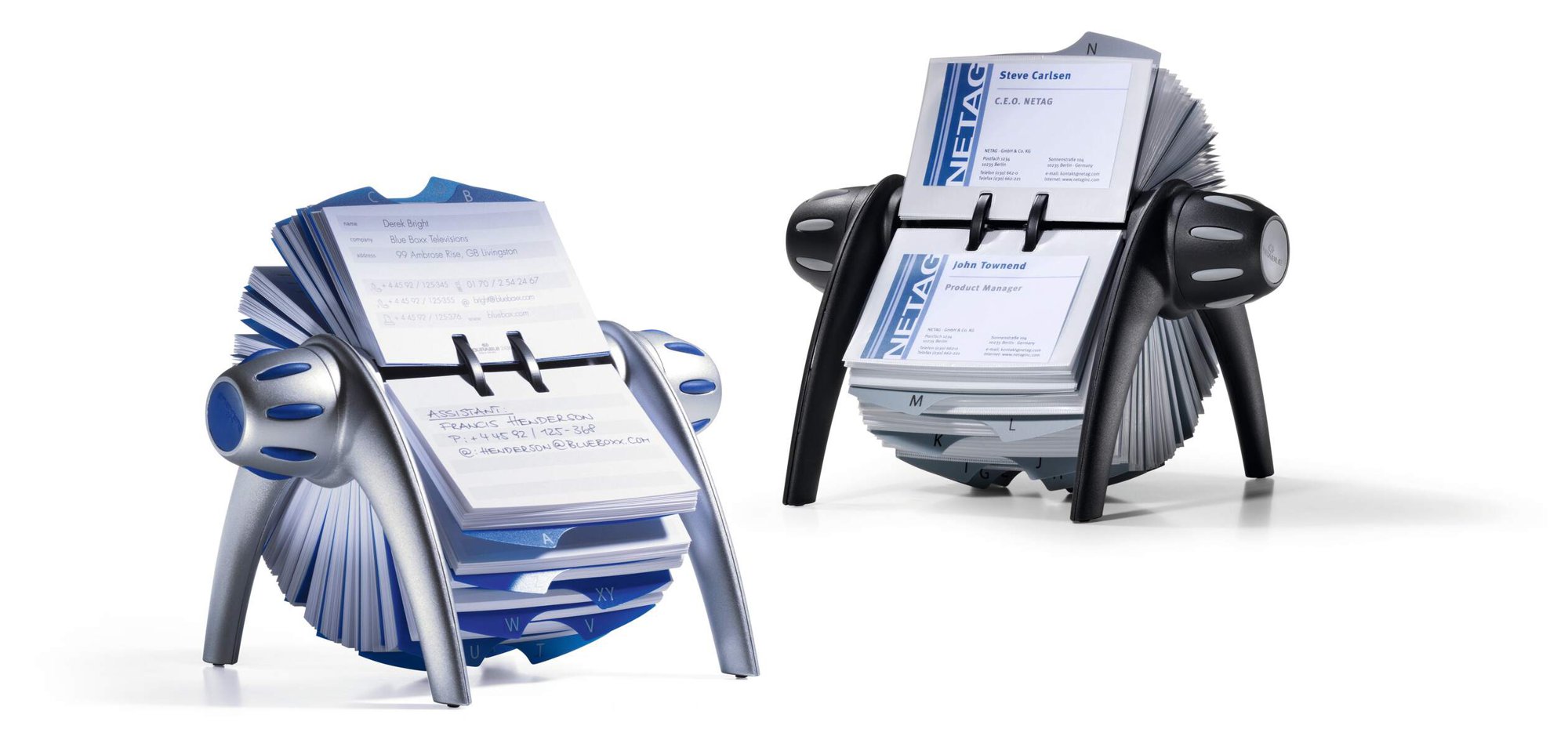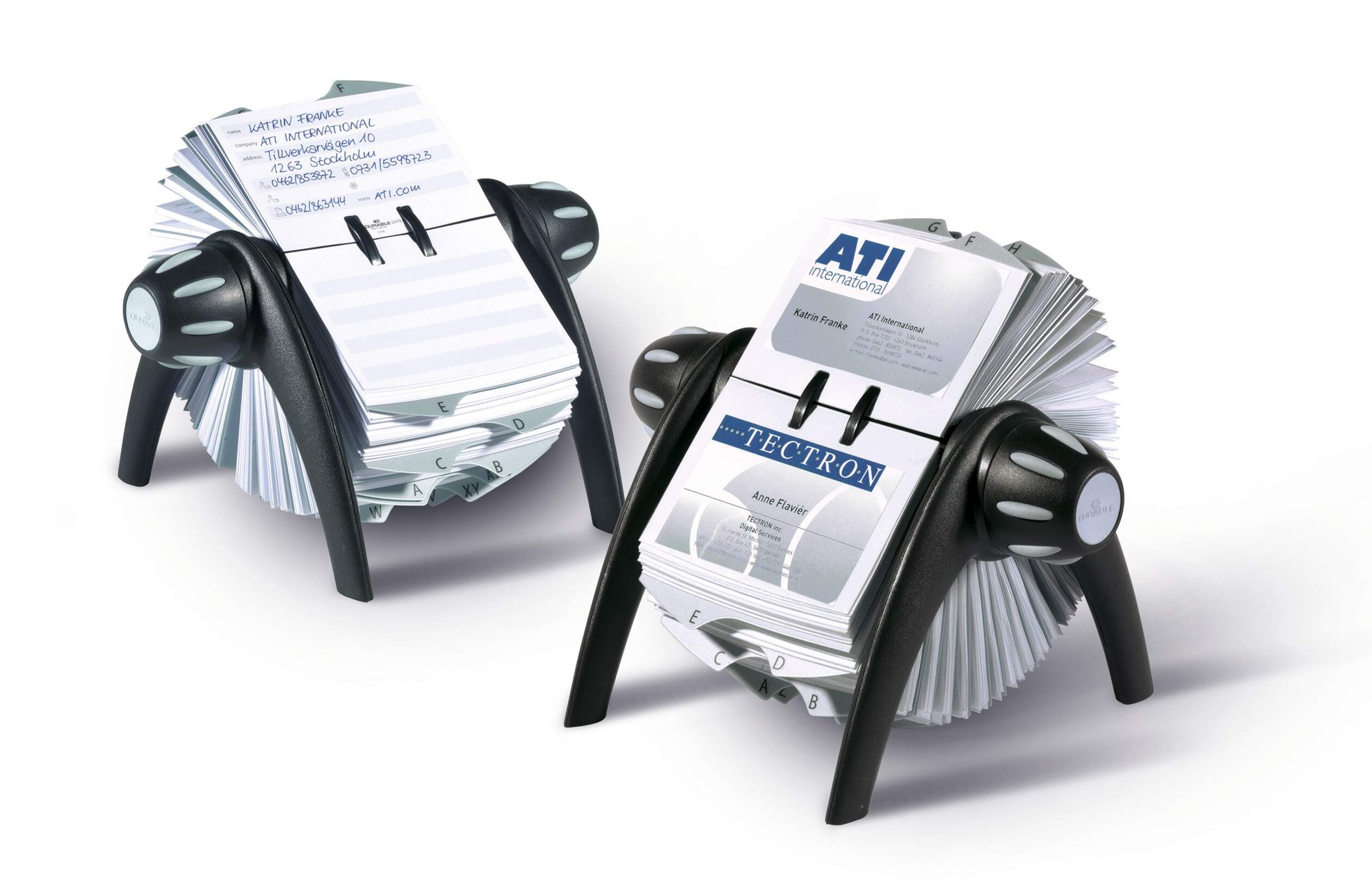 TELINDEX is widely regarded as one of the best systems for address card filing. The special rotation mechanism provides quick and easy access to cards and the unique rail system makes them easy to insert and remove.<br><br>Includes 500 double sided slotted address cards with alternating grey and white entry fields. 25 pre-loaded A-Z index dividers are also included for quick and easy organisation.<br><br>The stylish high quality design features rubber padded feet to prevent slipping and scratching.<br><br>Cards: 104 x 72 mm<br>Dimensions: 215 x 120 x 185 mm (W x H x D)