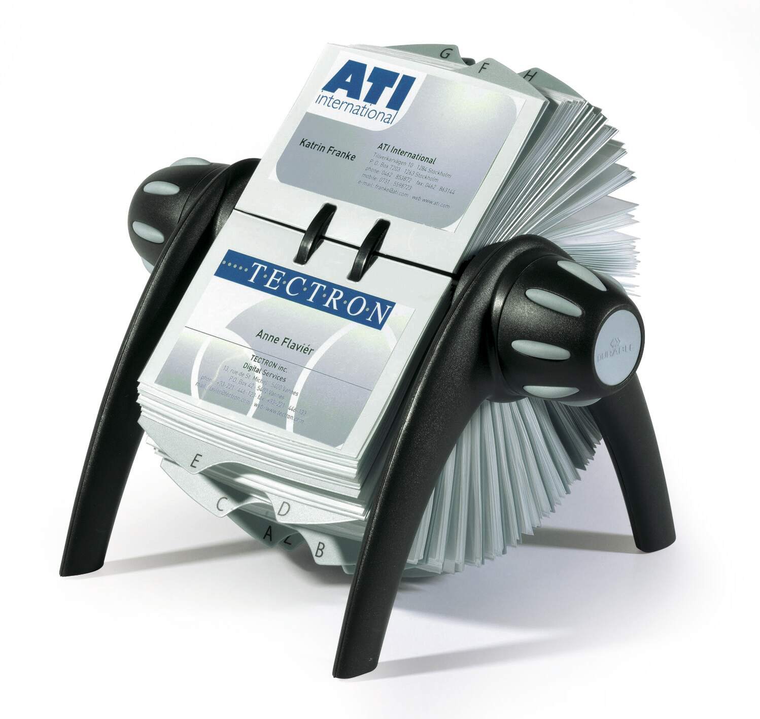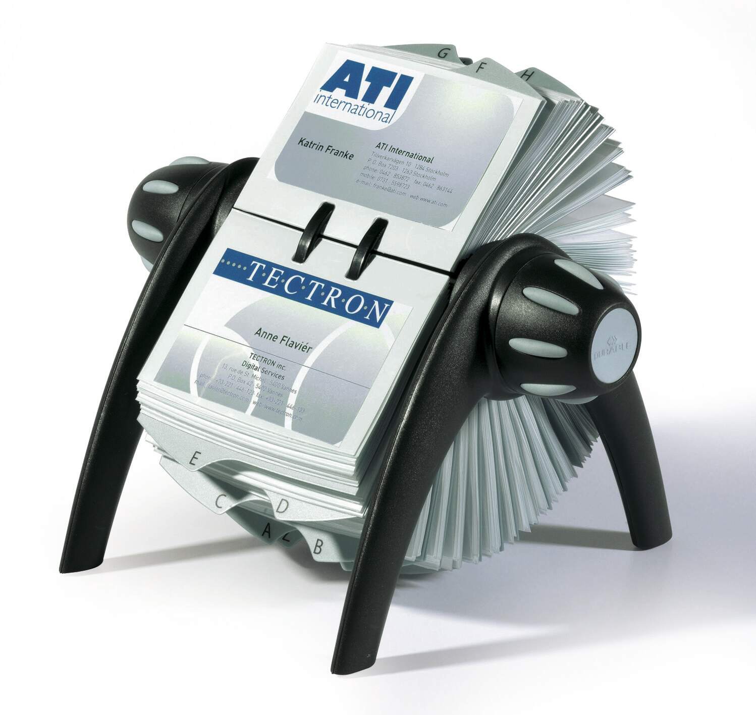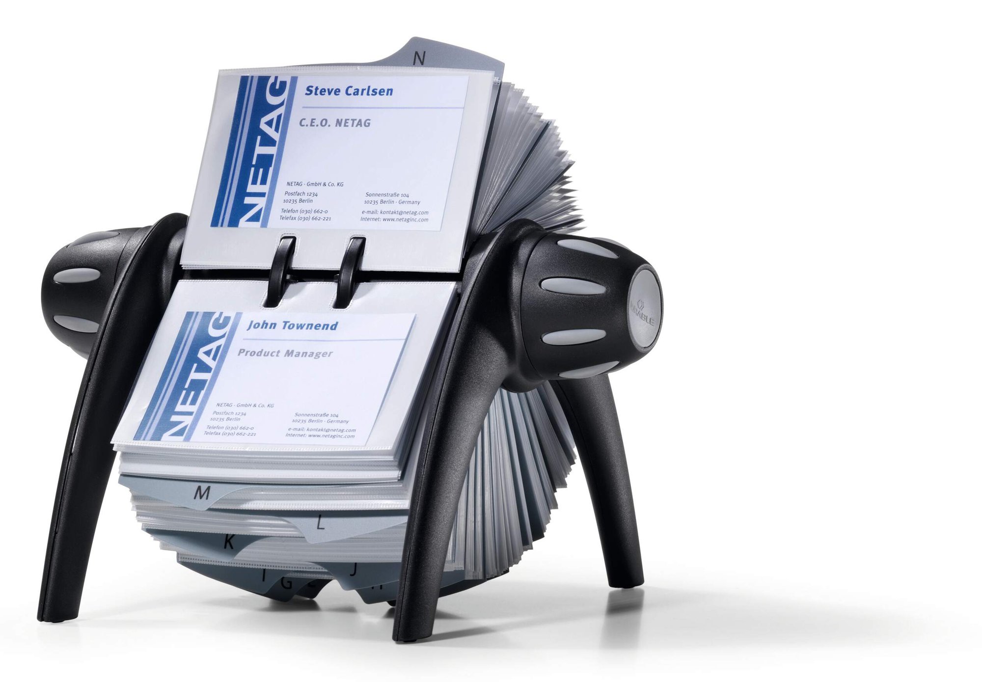 The VISIFIX system is widely regarded as one of the best business card filing systems. The special rotation mechanism provides quick and easy access to cards and the unique rail system makes them easy to insert and remove.<br><br>Includes 200 clear anti-tear business card pockets with 25 pre-loaded A-Z index dividers for quick and easy organisation.<br><br>The modern German design features rubber padded feet to prevent slipping and scratching.<br><br>Card capacity: 200 single sided 400 double sided<br>Cards: 104 x 72 mm<br>Dimensions: 215 x 120 x 185 mm (W x H x D)