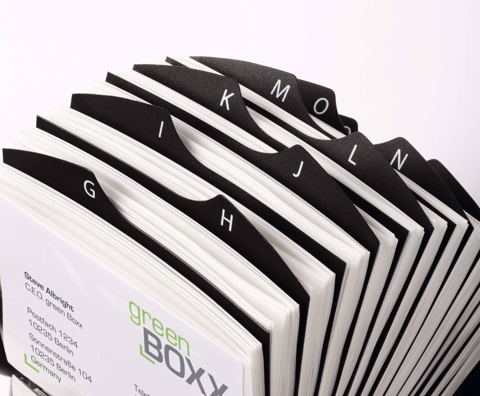 The VISIFIX system is widely regarded as one of the best business card filing systems. The special rotation mechanism provides quick and easy access to cards and the unique rail system makes them easy to insert and remove.<br><br>Includes 200 clear anti-tear business card pockets with 25 pre-loaded A-Z index dividers for quick and easy organisation.<br><br>Designed in Germany and environmentally friendly in accordance with ISO 14021: contains over 30% recycled content and 100% recyclable.<br><br>Card capacity: 200 single sided 400 double sided<br>Cards: 104 x 72 mm<br>Dimensions: 195 x 135 x 170 mm (W x H x D)