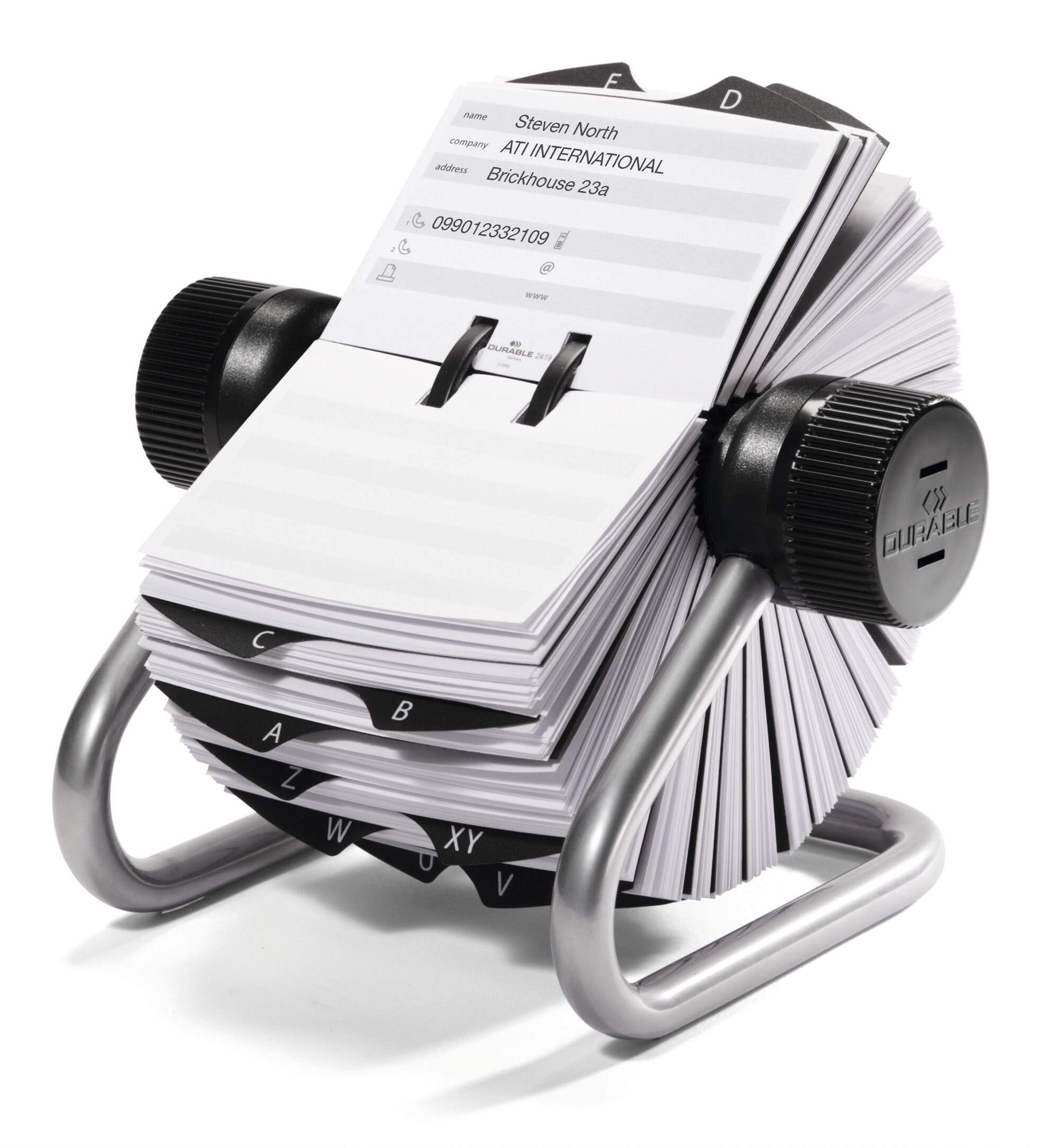 TELINDEX is widely regarded as one of the best systems for address card filing. The special rotation mechanism provides quick and easy access to cards and the unique rail system makes them easy to insert and remove.<br><br>Includes 500 double sided slotted address cards with alternating grey and white entry fields. 25 pre-loaded A-Z index dividers are also included for quick and easy organisation.<br><br>Cards: 104 x 72 mm<br>Dimensions: 195 x 135 x 170 mm (W x H x D)