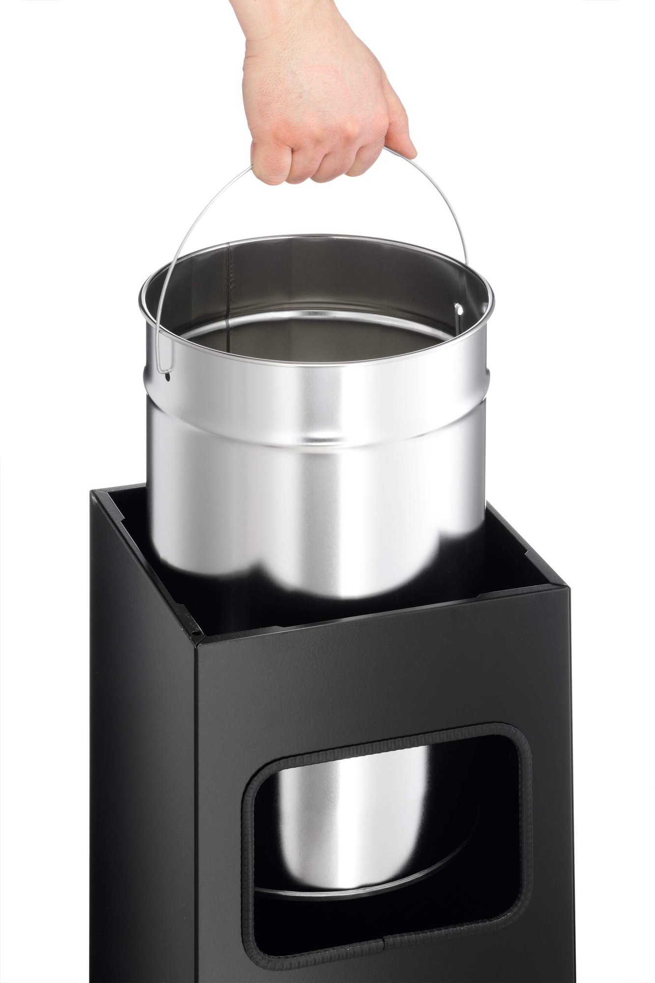 Introducing our 17L integrated ashtray bin, a smart solution for keeping covered outdoor spaces clean and accommodating smoking needs. With a removable aluminium insert, cleaning is a breeze. Durable and sleek, it fits seamlessly into any environment, ensuring a tidy and organised space. Say goodbye to scattered cigarette butts with this convenient and stylish solution.<br><br>Includes<br>1 x Safe ashtray bin<br>1 x Removable inner bin<br>1 x Removable ashtray insert<br>1 x Bag of silver ashtray sand (1.5kg)<br><br>Specifications<br>Applications: Indoors and covered outdoor areas<br>Dimensions removable ashtray (H x Ø): 50 x 240 mm<br>Dimensions inner container (H x Ø): 380 x 220 mm<br>Product dimensions (H x Ø): 620 x 250 mm<br><br>Made in Europe designed to last