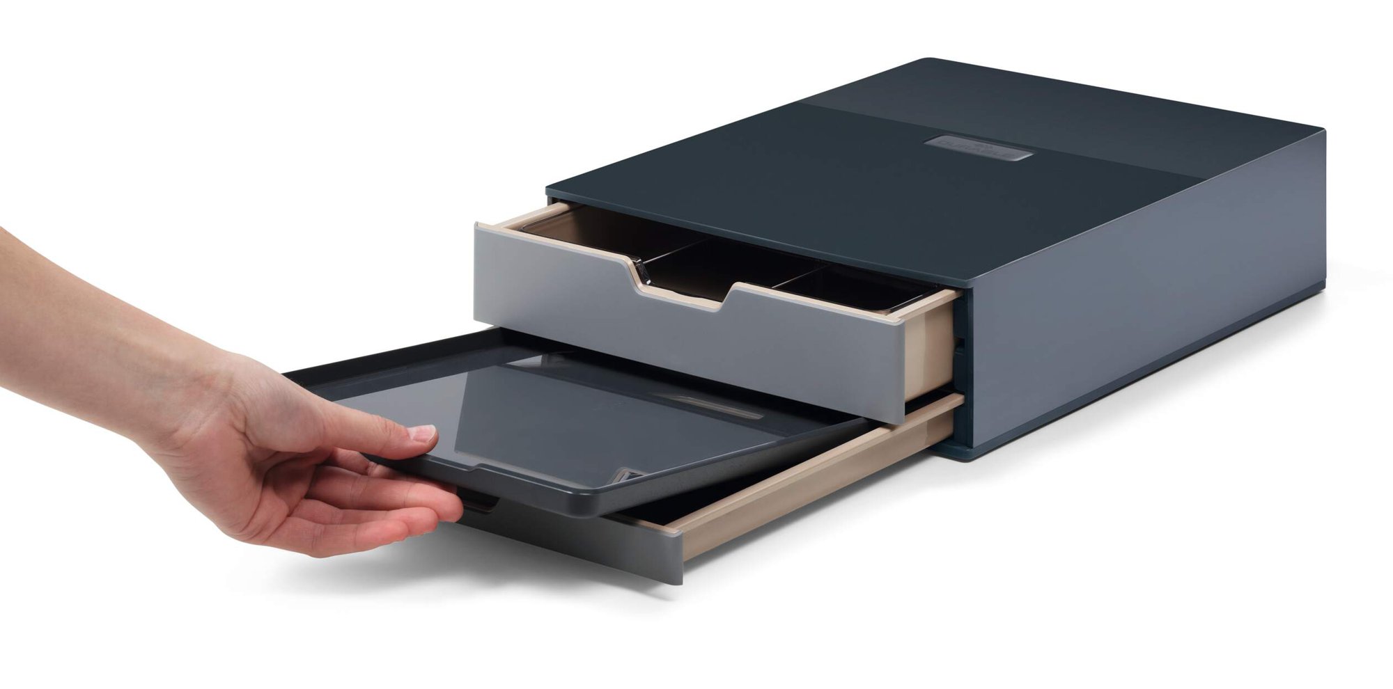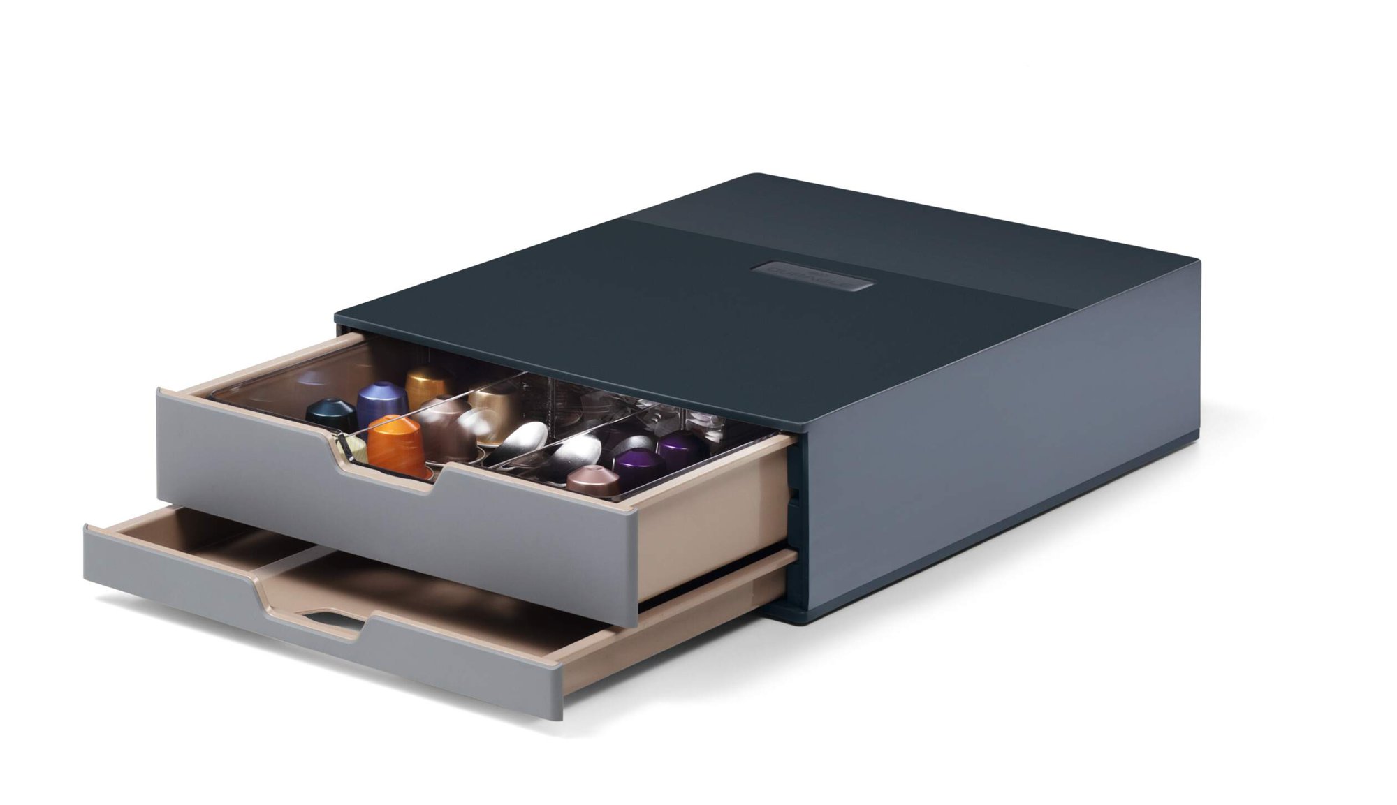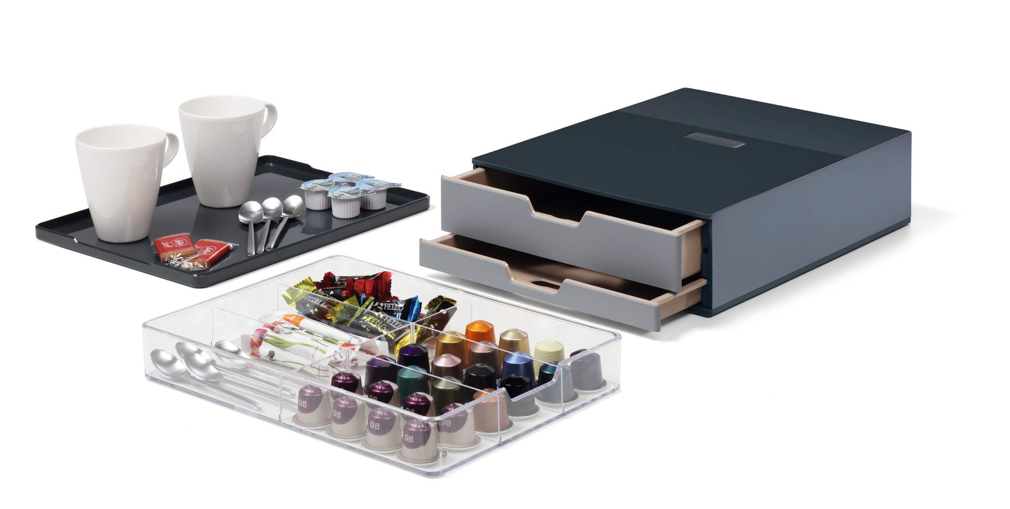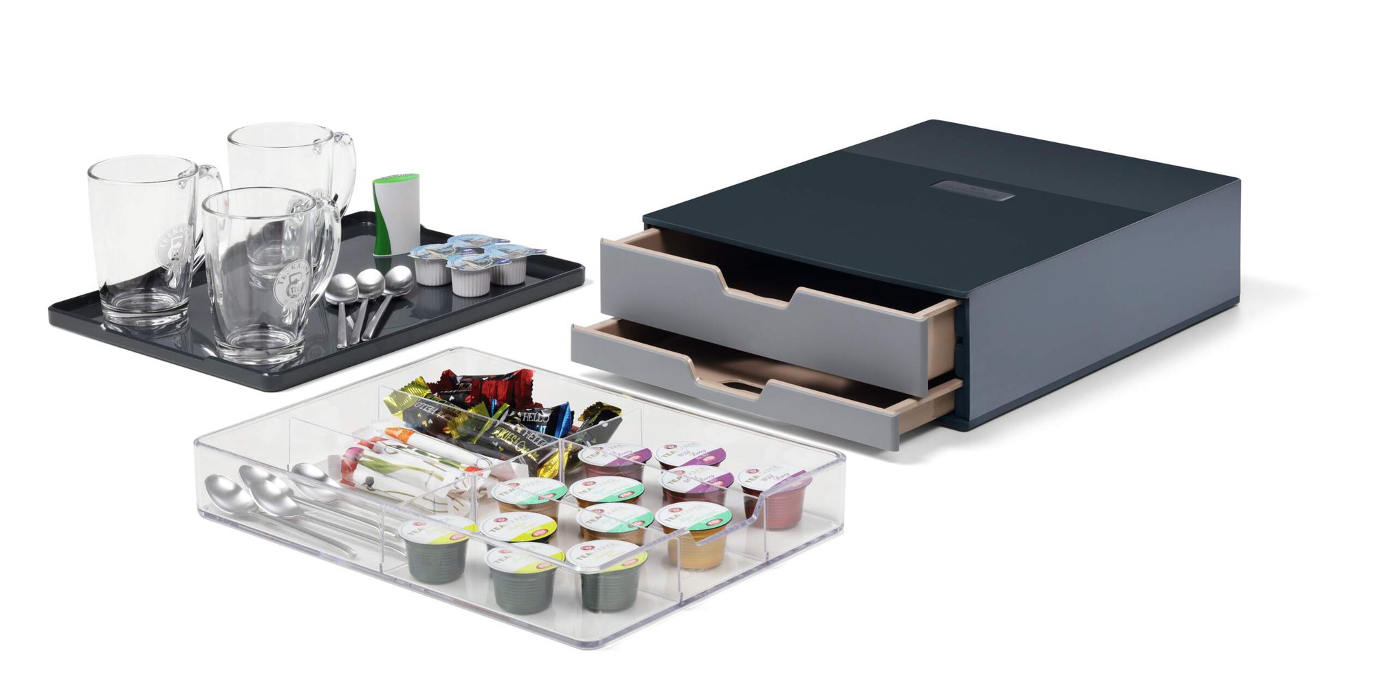 Durable COFFEE POINT boxes offer spacious, flexible and user-friendly storage and organisation. Perfect for common catering and office supplies such as coffee pods, tea bags, sugar sachets and stationery. Ideal for use in meeting rooms, reception and break-out areas with a secure GDPR-Compatibleliant cylinder lock on the top draw.<br><br>The drawer unit is made of premium quality plastic and includes rubber feet for stability and to protect the surface below.<br><br>Made with 100% recyclable materials and built in accordance with ISO 14021, a high standard for eco-friendly products.<br><br>Dimensions: 280 x 95 x 356 mm (W x H x L)<br>Made in Germany