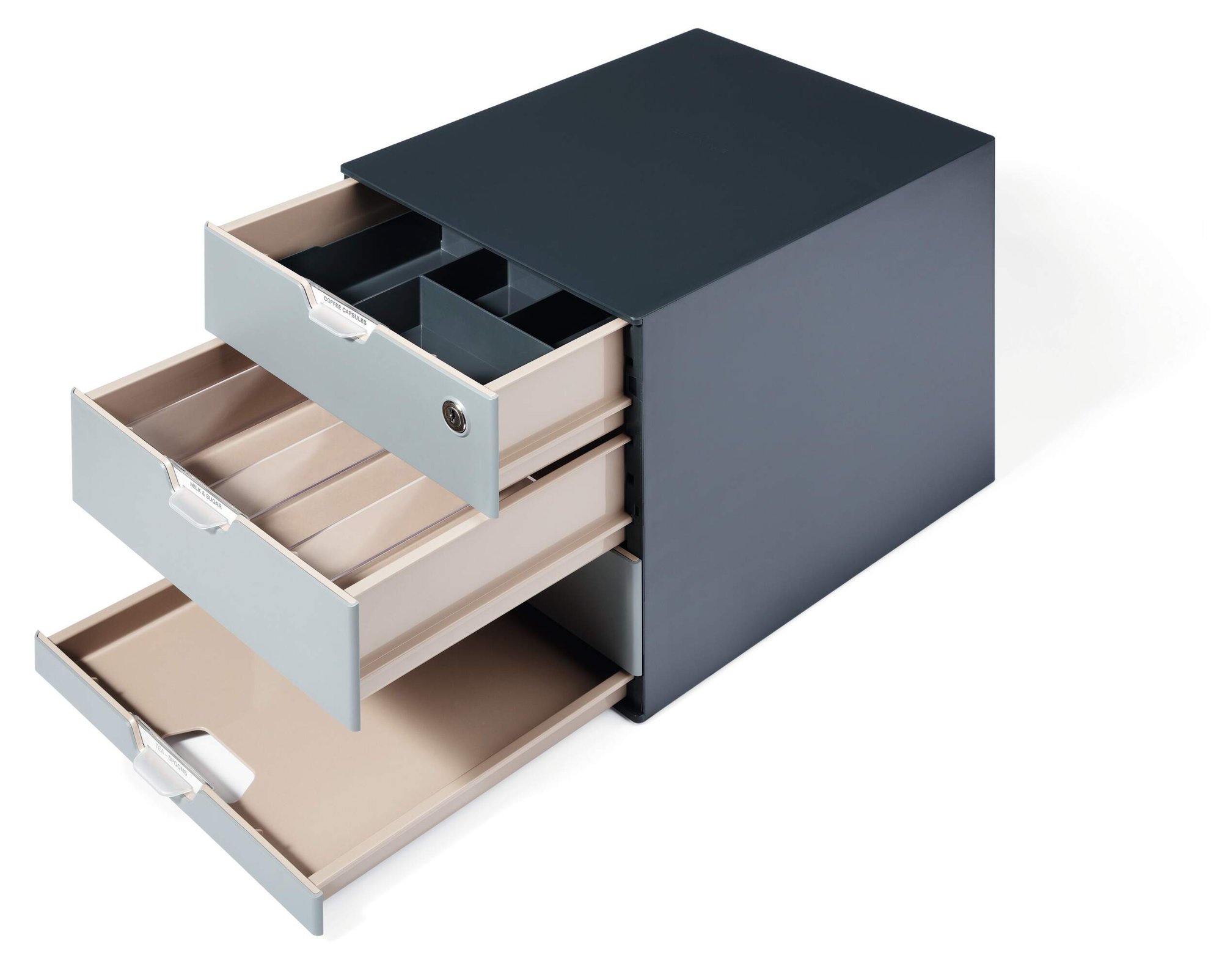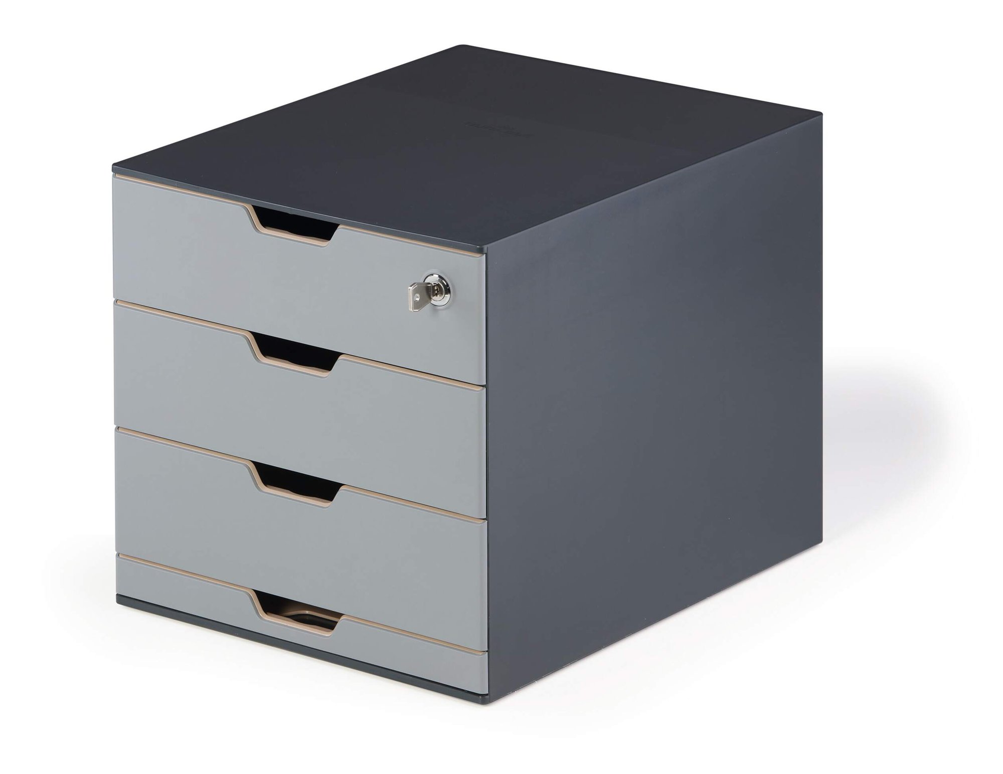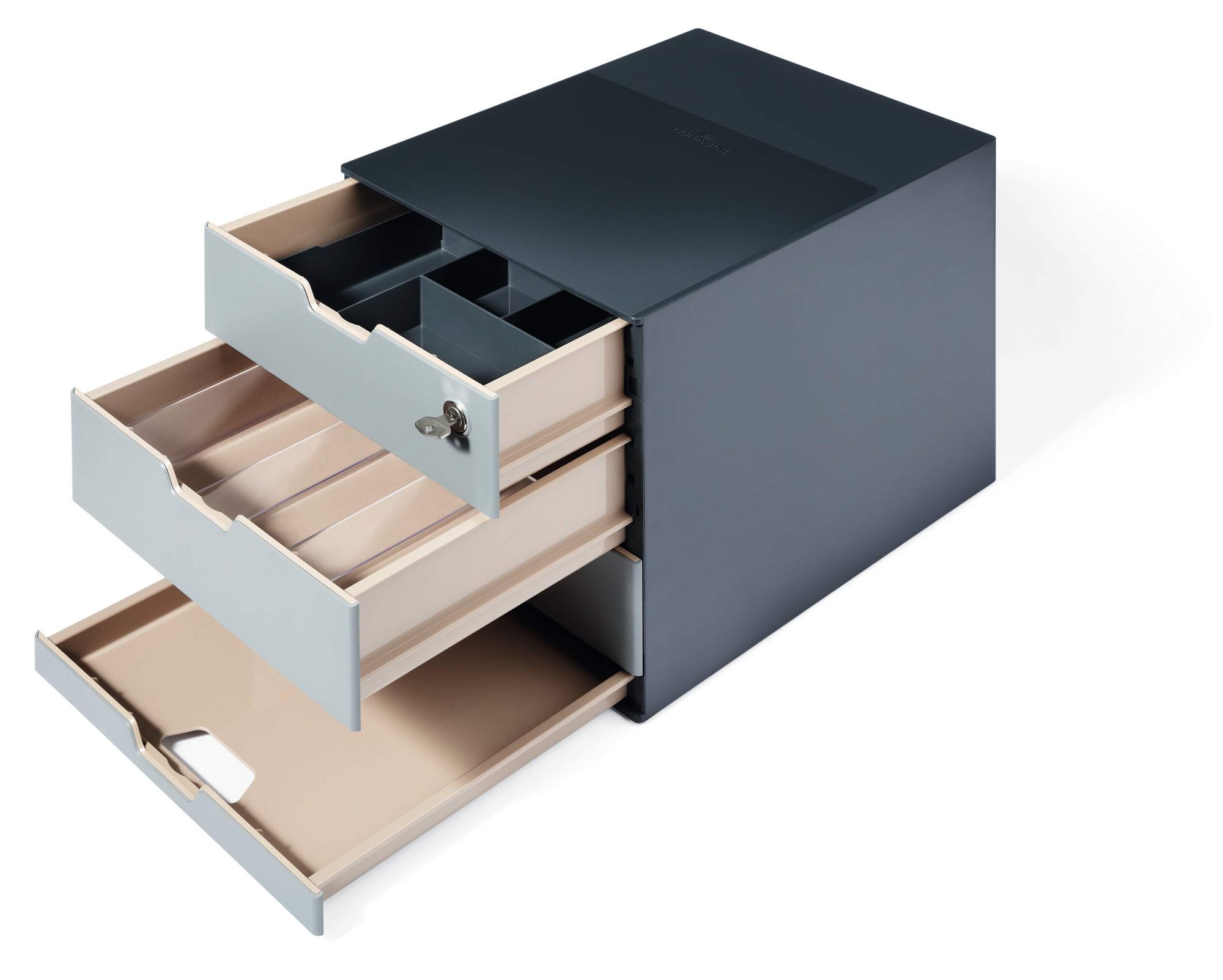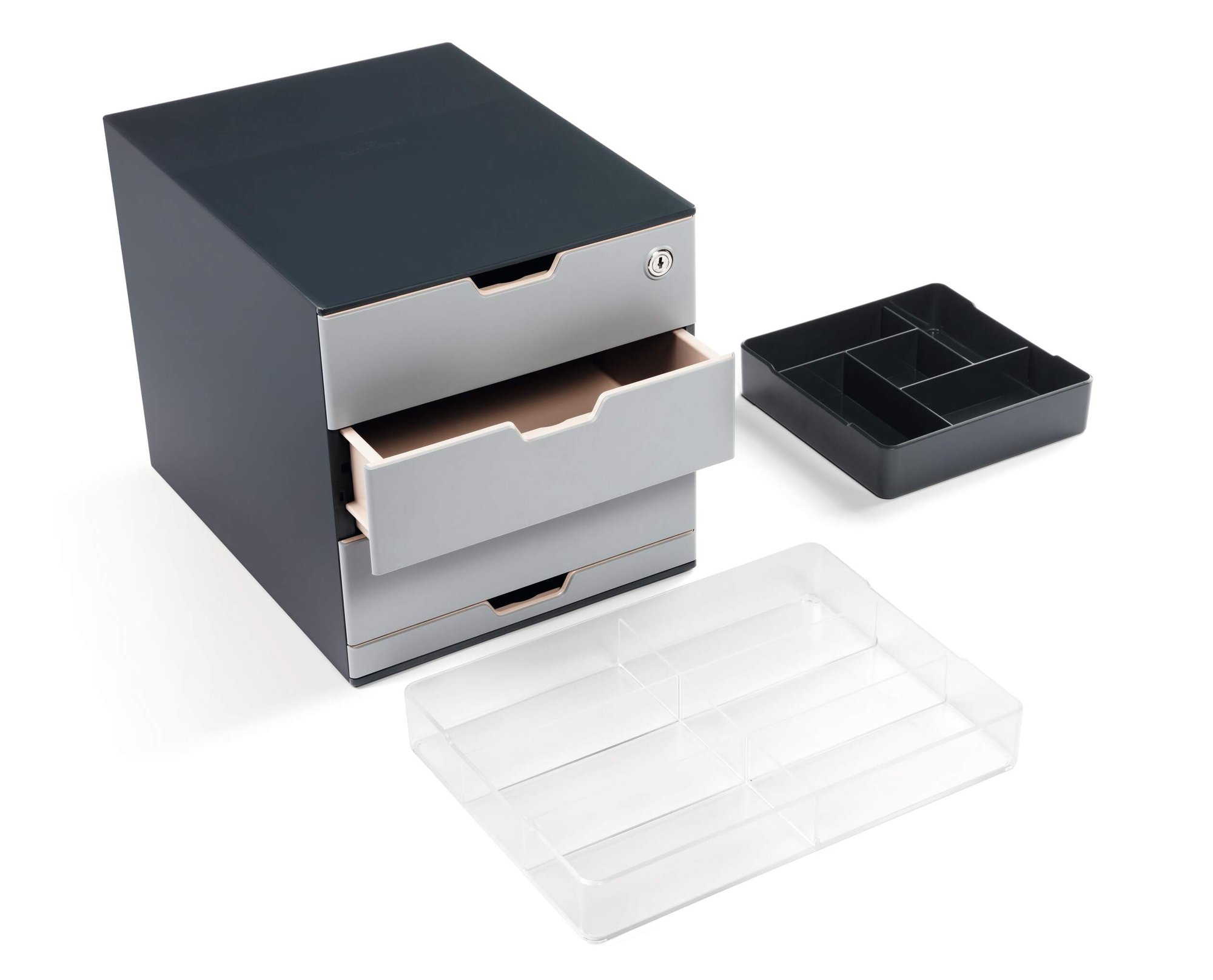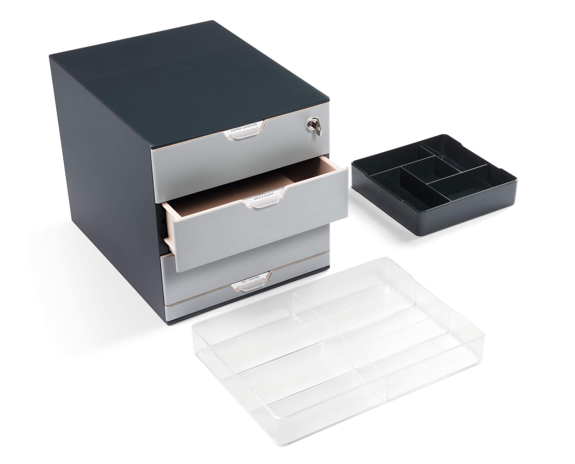 Durable COFFEE POINT boxes offer spacious, flexible and user-friendly storage and organisation. Perfect for common catering and office supplies such as coffee pods, tea bags, sugar sachets and stationary. Ideal for use in meeting rooms, reception and break-out areas with a secure GDPR Compatibleliant cylinder lock on the top draw.<br><br>The drawer unit is made of premium quality plastic and includes rubber feet for stability and to protect the surface below.<br><br>The modular set includes:<br>1 x COFFEE POINT Locking Draw Box<br>2 x Cylinder lock keys<br>1 x Square Food and Dishwasher Safe Draw Organiser<br>1 x Clear Food and Dishwasher Safe Draw Organiser<br><br>Each item fits perfectly within the extra deep drawer Compatibleartments.<br><br>Made with 100% recyclable materials and built in accordance with ISO 14021, a high standard for eco-friendly products.<br><br>Dimensions: 280 x 292 x 356 mm (W x H x L)<br>Made in Germany