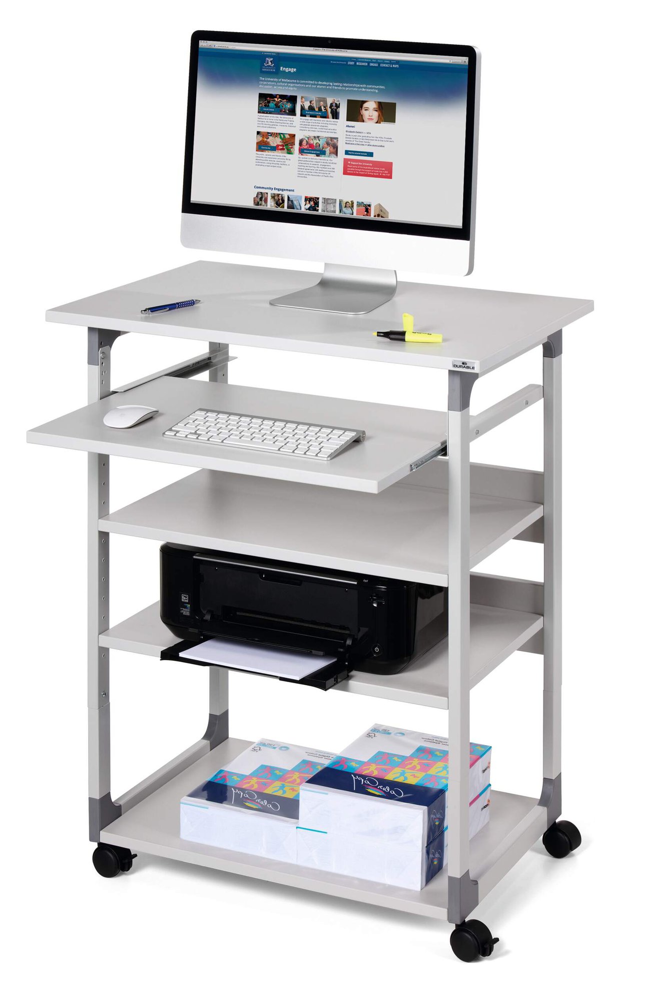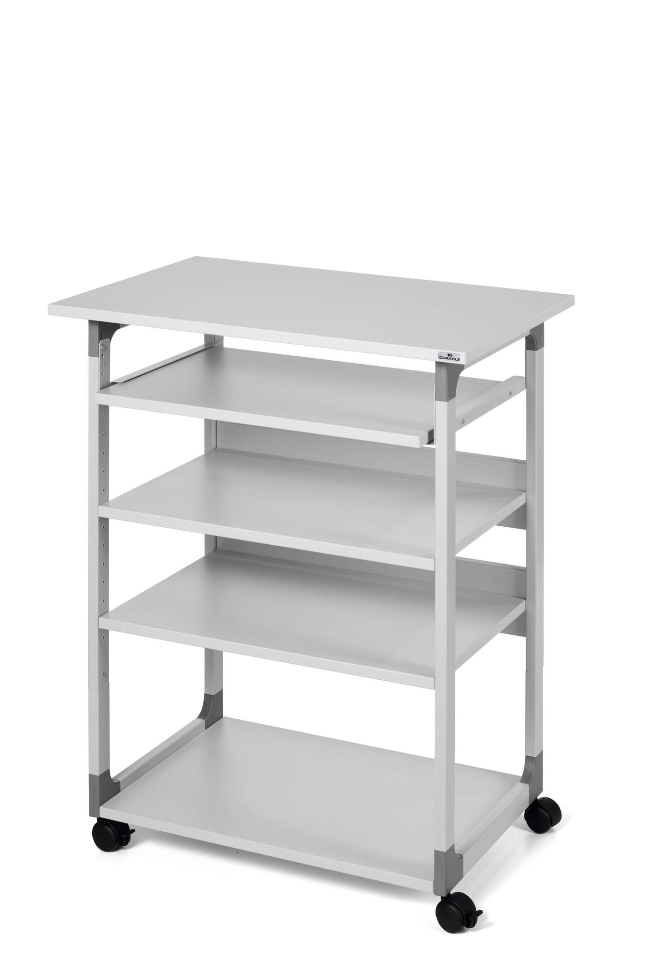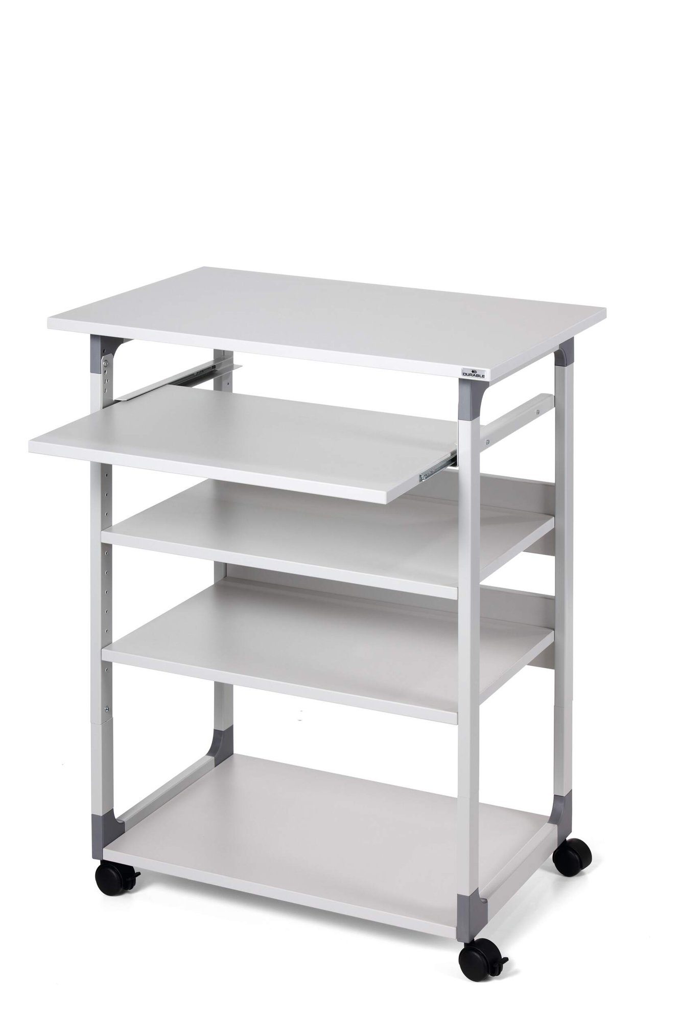 Introducing Durable€™s Mobile computer Table €“ the perfect solution for busy workspaces needing quick access to computer equipment. This versatile workstation features four durable shelves, two of which are height-adjustable, providing flexible storage options for various office essentials.<br><br>The height-adjustable monitor shelf and retractable keyboard tray allow for comfortable use whether seated or standing. With four castors, including two with brakes, the table is both mobile and secure, ensuring easy movement and stability.<br><br>Built with a sturdy, scratch-proof steel frame and reinforced plastic corners, this computer table is designed for durability and longevity. Raised, anti-tilt edges on the shelves ensure safe storage of folders and papers, making it an ideal choice for dynamic and efficient work environments.<br><br>Height adjustment from: 950 - 1220 mm<br>Dimensions: 1150 x 750 x 534 (H x W x L)<br><br>Designed in Germany made to last