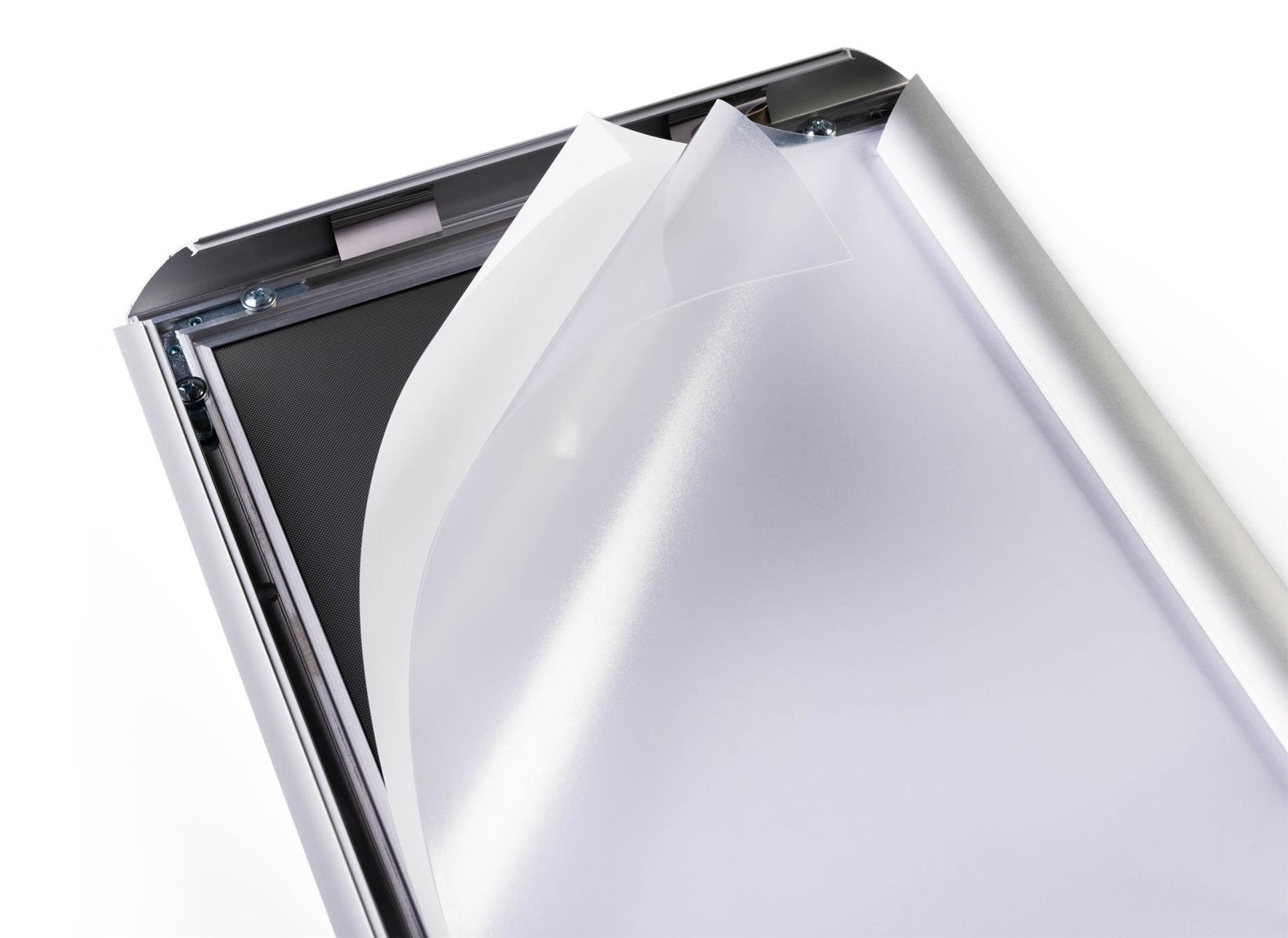Robust anodised aluminium snap frames provide a premium signage solution. The folding frame enables quick and easy exchange of documents for fast changing signage.<br><br>The frame features an anti-glare UV protected cover to increase legibility and prevent signage from fading. Provided with a variety of concealed mounting options for quick and sturdy installation on any surface.<br><br><br>Includes<br>1X Aluminium snap frame<br>4X Galvanised steel screws<br>4X Wall plugs<br>4X Strong adhesive strips<br>1X Mounting instructions<br><br>Designed in Germany and built to last