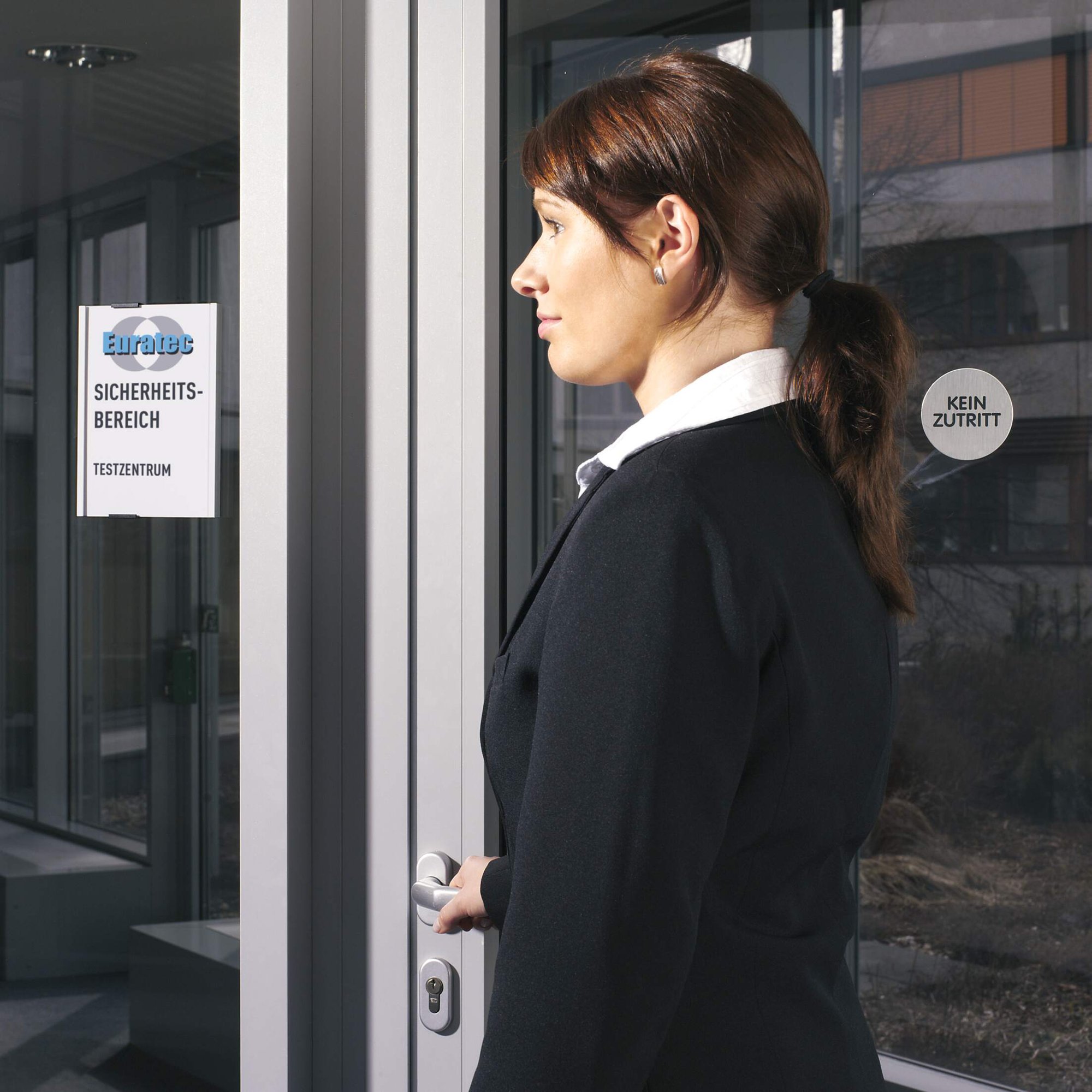 Modern German-designed door plates with ribbed aluminium backing, anti-glare acrylic window and stylish offset fixing caps.<br><br>Made with 80% recycled materials, 100% recyclable and built in accordance with ISO 14021, a high standard for eco-friendly products.<br><br>Includes:<br>1X Door plate info sign<br>2X Adhesive buttons<br>2X Screws<br>2X Wall plugs<br>1X Mounting instructions<br>1X Paper insert<br><br>Insert dimensions: A5 portrait (149 x 210.5 mm)<br>Quantity: 1<br><br>Made in Germany