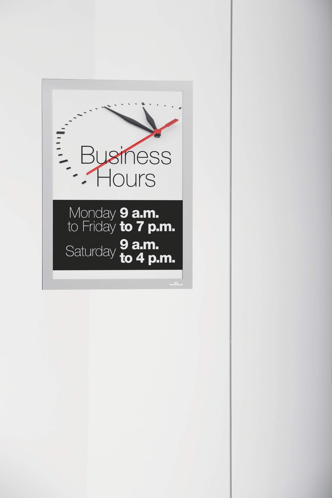 The original fold-back frame. DURAFRAME SUN is ideal for displaying information and advertising on glass surfaces exposed to sunlight such as retail shop windows. The inserts are protected from direct sunlight thanks to the frame being heat resistant up to 70°C, anti-glare and UV resistant.<br><br>The inserts can be quickly exchanged thanks to the magnetic fold-back frame. The frame can also be repositioned time and time again thanks to its static cling attachment. No need for tools or expensive installation fees.
