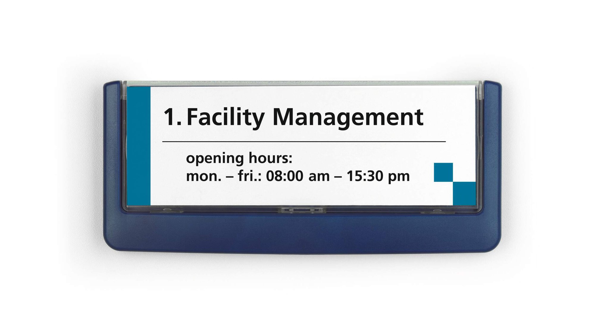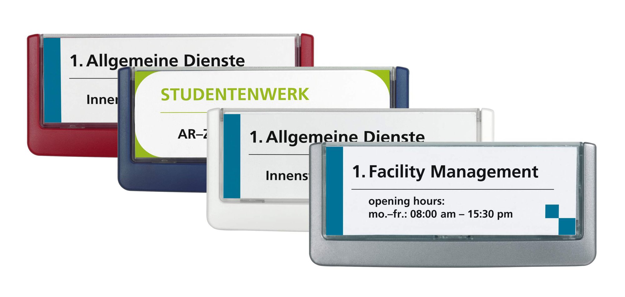 CLICK SIGN is a high quality ABS door sign range, with a pull-out viewing window to easily replace inserts. They feature an anti-scratch window and a variety of mounting options for different surfaces. They are a durable and versatile signage solution.<br><br>Compatible with printable inserts (product # 485002)<br><br>Includes:<br>1X Doorplate CLICK SIGN<br>1X 160gsm blank insert cards<br>2X Nylon wall plugs<br>2X Galvanised screws<br>2X Adhesive buttons<br>1X Instructions<br><br>Insert dimensions: 149 x 52.5 mm<br>Made in Germany