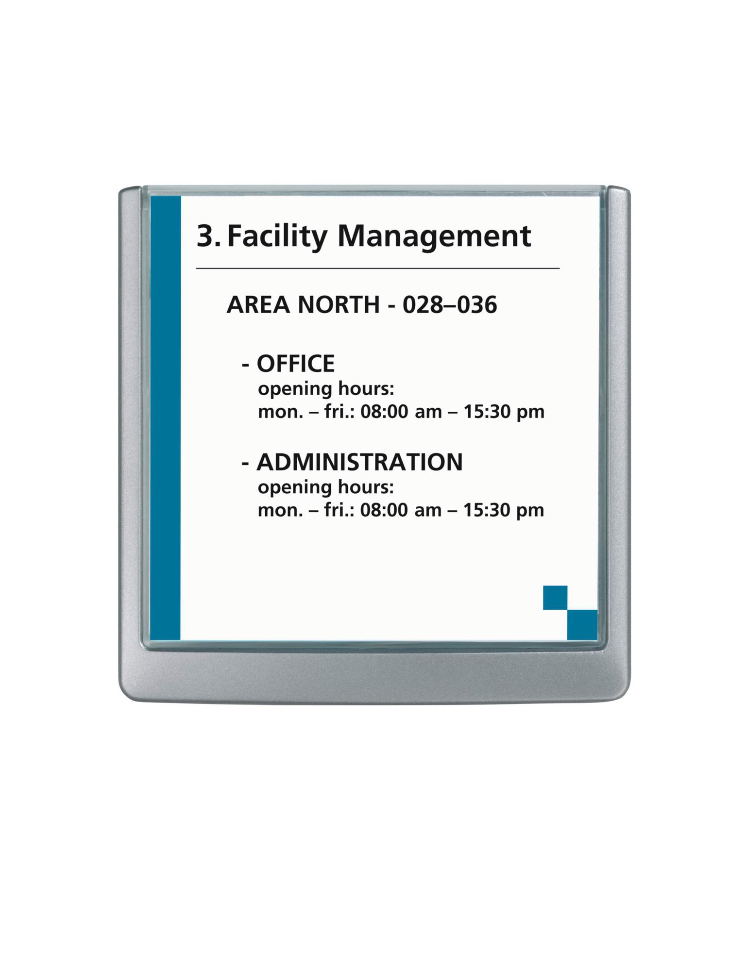 CLICK SIGN is a high quality ABS door sign range, with a pull-out viewing window to easily replace inserts. They feature an anti-scratch window and a variety of mounting options for different surfaces. They are a durable and versatile signage solution.<br><br>Compatible with printable inserts (product # 485202)<br><br>Includes:<br>1X Doorplate CLICK SIGN<br>1X 160gsm blank insert cards<br>2X Nylon wall plugs<br>2X Galvanised screws<br>2X Adhesive buttons<br>1X Instructions<br><br>Insert dimensions: 149 x 148.5 mm<br>Made in Germany