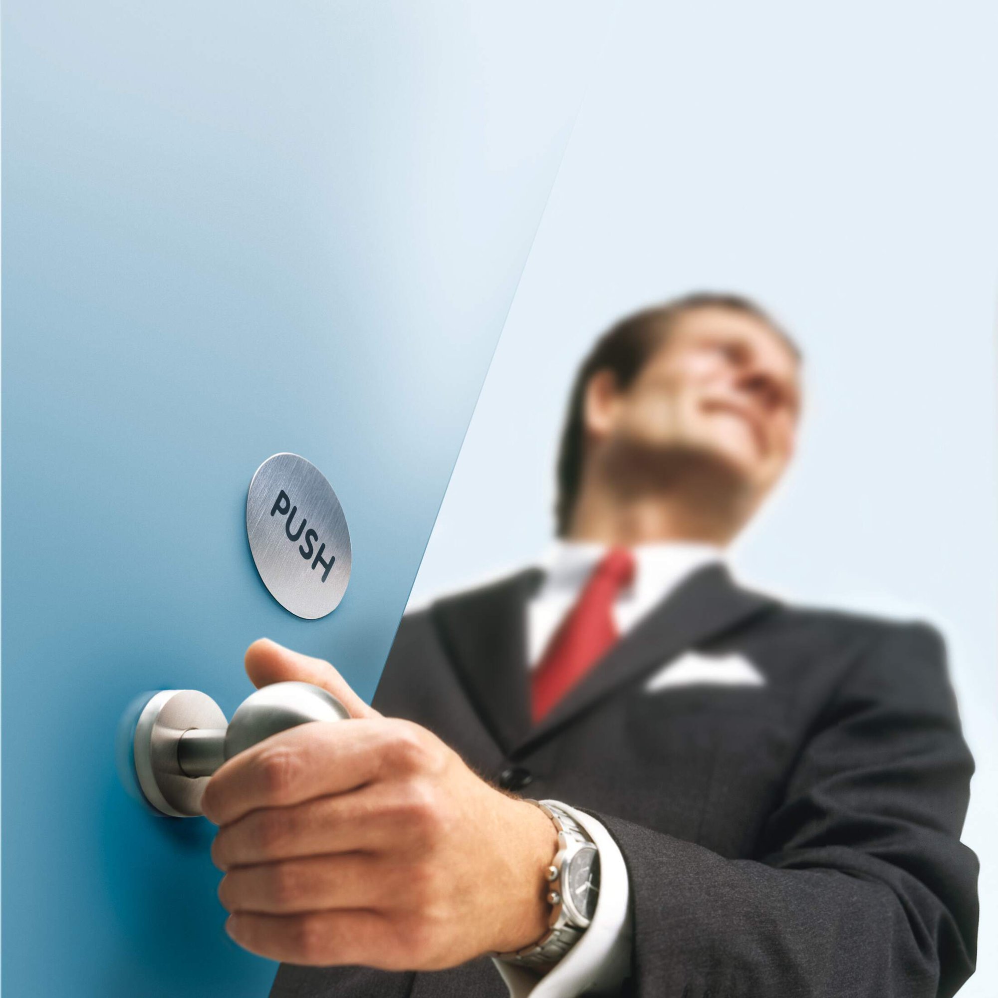 Brushed stainless steel pictogram with a strong adhesive pad for easily attaching to a variety of surfaces. All our door symbols are non-corrosive scratch-proof and highly durable.<br><br>The text is clear and easy to read at a distance making it perfect for wayfinding in hotels, offices, restaurants, etc.<br><br>Made with 50% recycled materials, 100% recyclable and built in accordance with ISO 14021, a high standard for eco-friendly products.<br><br>Diameter: 65 mm<br>Self-adhesive type: Permanent