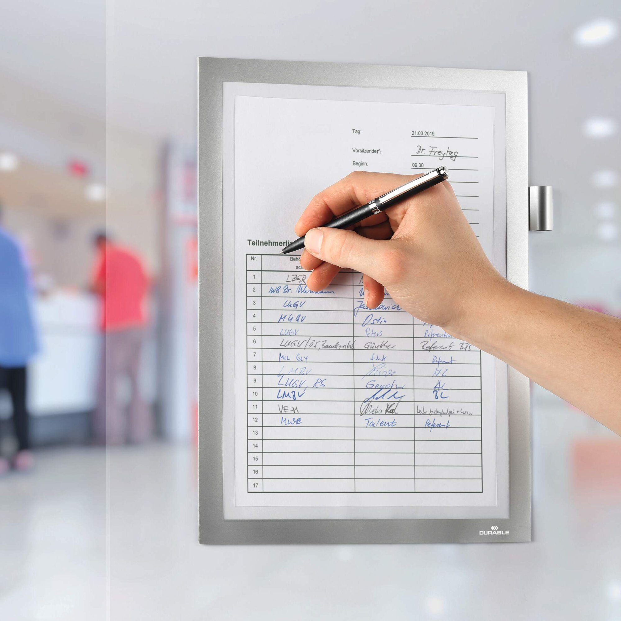 The original fold-back frame. DURAFRAME NOTE with pen holder is the ideal solution for writing directly on documents and notices. The inserts can be quickly exchanged thanks to the unique magnetic fold-back design.<br><br>The inserts can be directly written onto making it perfect for cleaning rotas, event sign-up sheets, or for safety and maintenance checklists.<br><br>The frames can be removed without causing any damage or leaving any residue.