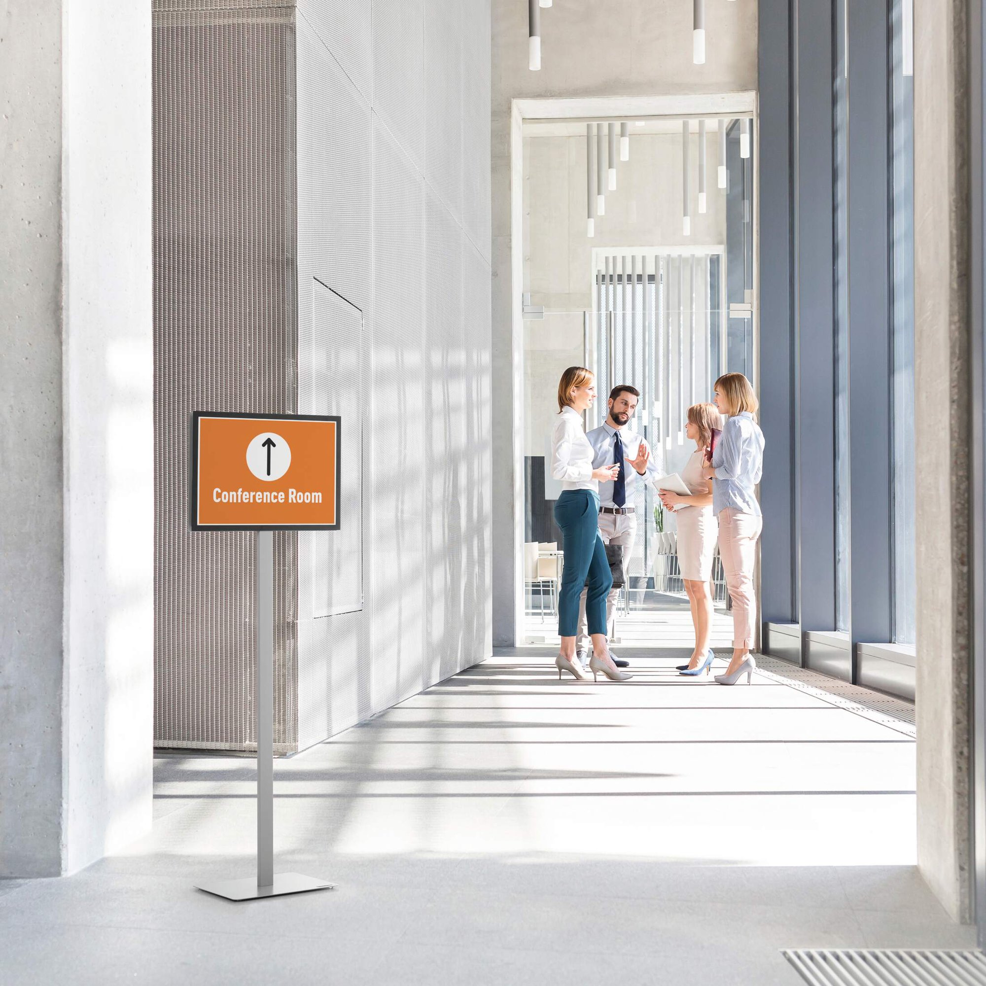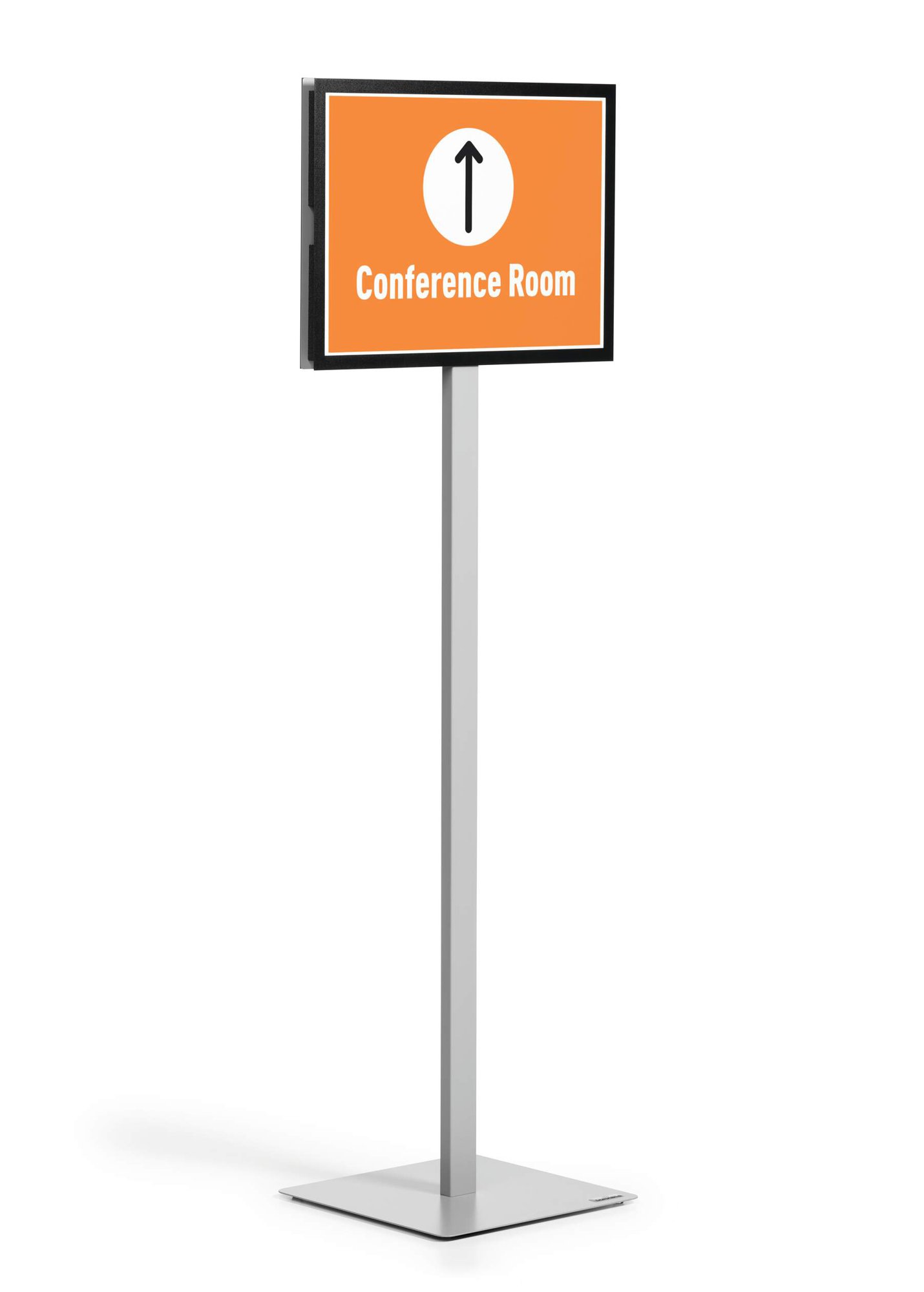 The INFO STAND BASIC floor stand is the simple way to present information in a wide range of application areas and can be used as a wayfinding system due to its double-sided readability. Information is quick and easy to exchange, thanks to the use of our DURAFRAME magnetic signage frames.<br><br>The stand is extremely stable thanks to the high-quality frame and weighted base with non-slip rubber feet. The innovative lock-in mechanism enables you to quickly change from portrait to landscape orientations without tools. The floor stands are perfect for reception areas, exhibitions, lobbies and waiting rooms, etc.<br><br>All our display stands are built and designed in-house in Germany. They are made to a high standard from premium quality materials and undergo strict quality control. This ensures an excellent finish and extended product lifecycle.<br><br>Includes mounting set and instructions.<br><br>Dimensions in portrait format: 1402x323x305 mm (H x W x D)<br>Dimensions in landscape format: 1301x446x305 mm (H x W x D)