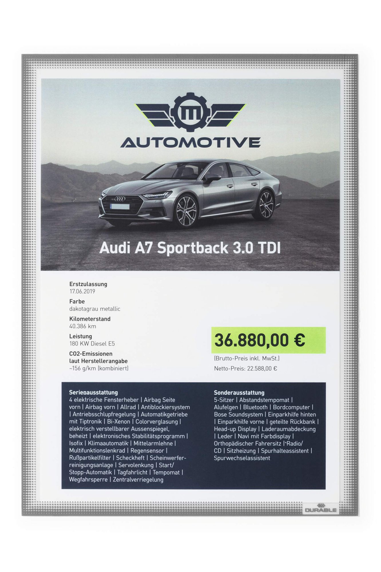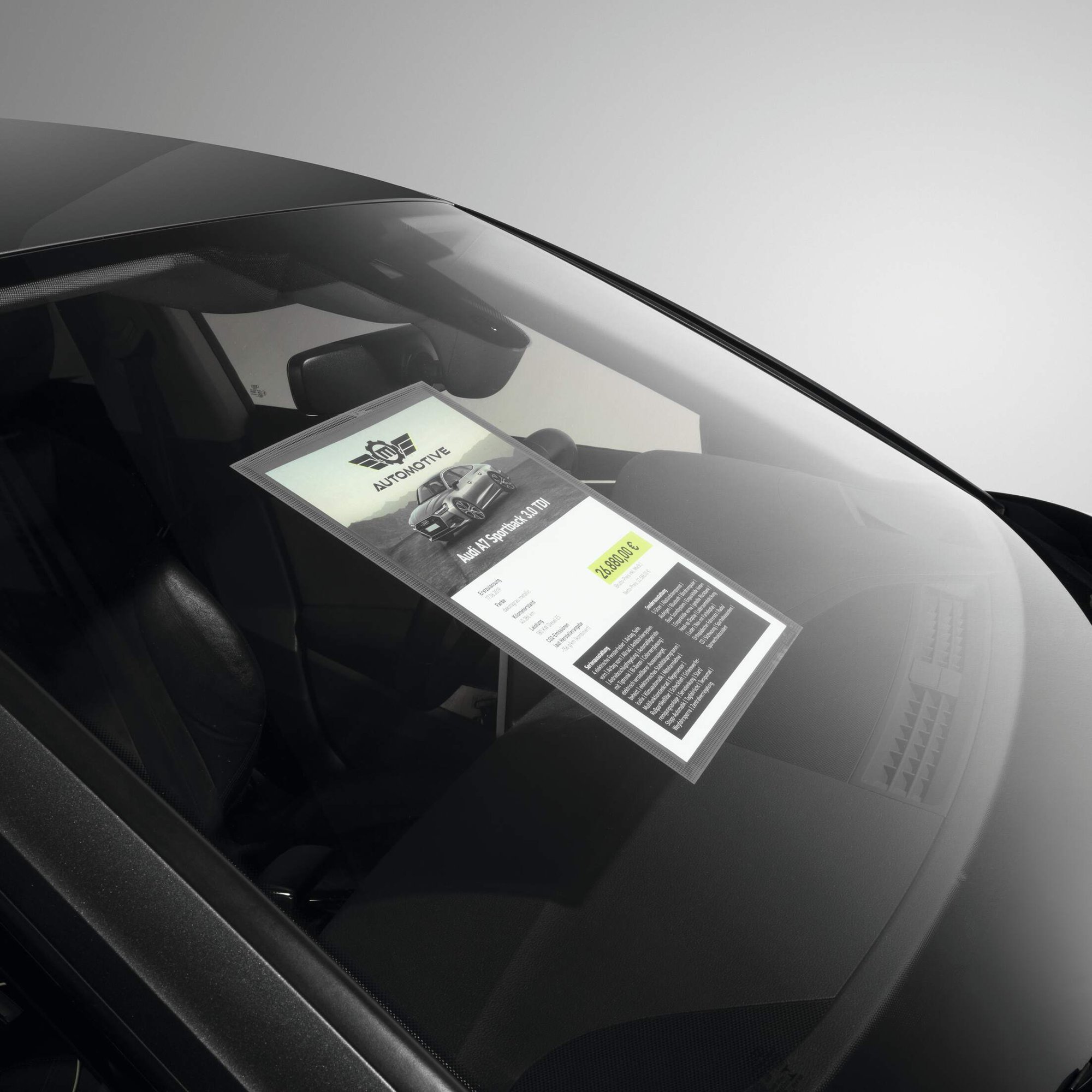 The signage solution specifically designed for interior curved and flat glass. The static cling info pouches are suitable for attaching offers to car windows, shop windows and sales counters. The A4 frames are adhesive-free meaning it can be repositioned time and time again without leaving any residue.<br><br>The pocket is heat-stable up to 70°C, UV resistant and anti-glare. Documents can be quickly exchanged thanks to the insertion aid on the reverse of the frame. Can be used in both portrait and landscape orientations.