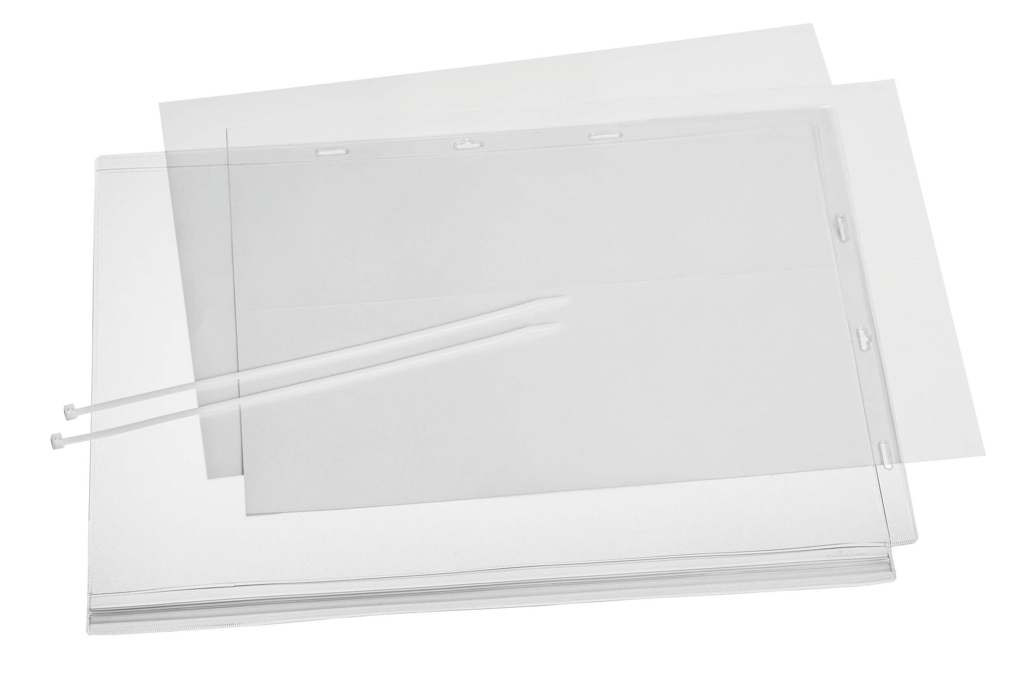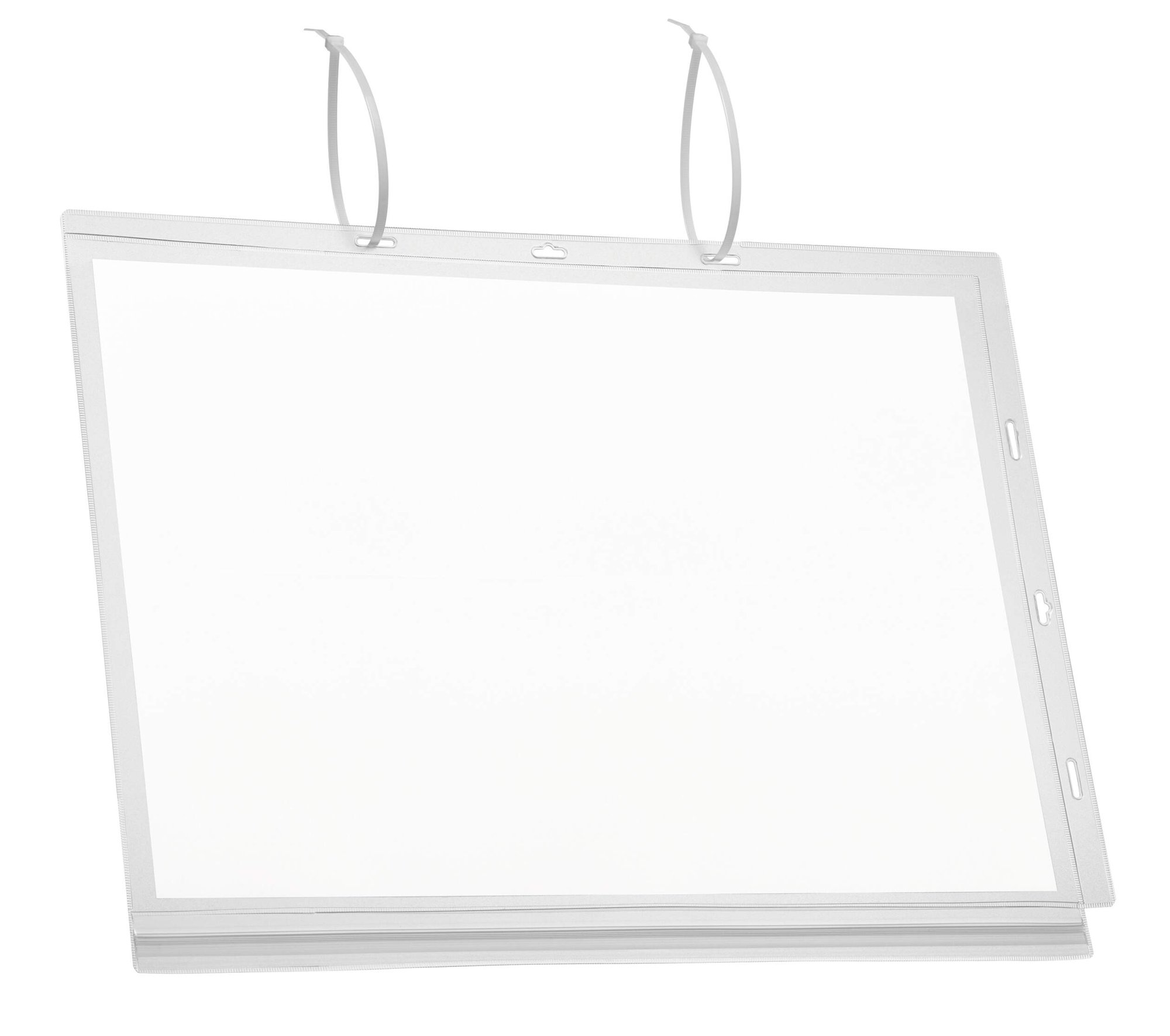 Water-resistant cable tie pockets tested up to IPX5 standards (protection against water jets from all directions). The pockets are UV-stabilized to prevent fading and peeling and feature a scratch-resistant anti-reflective coating for excellent long term legibility.<br><br>Ideal for displaying information outdoors such as garden centres, saunas, swimming pools, gates and notice boards. The waterproof pressure closure protects the contents from rain, humidity, dirt, and debris.<br><br>Quick and easy to attach thanks to the 2 enclosed cable ties provided in long or Euro holes. The pockets can be used in both portrait and landscape orientations.<br><br>Signage templates are free to download from DURAPRINT<br><br>Capacity: 2 Sheets<br>Includes: 2X 160gsm A3 inserts<br>Applications: Indoors, outdoors and High humidity applications<br>Heat stability: Tested to 60°C<br><br>Designed in Germany and built to last