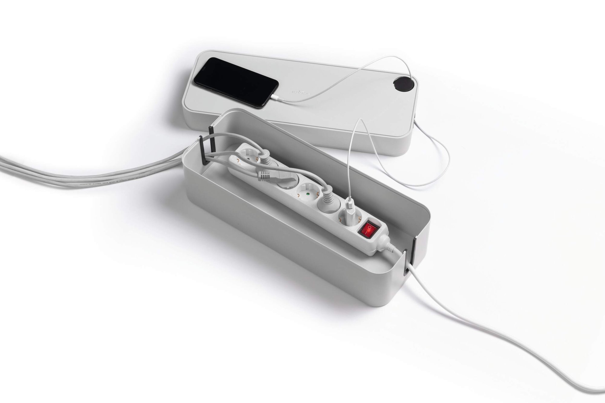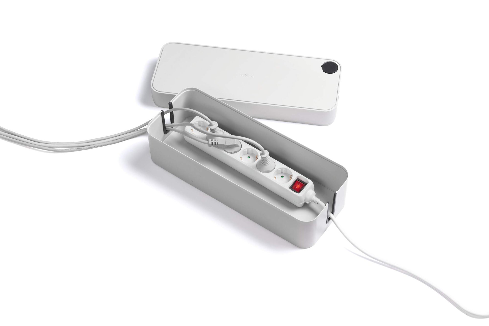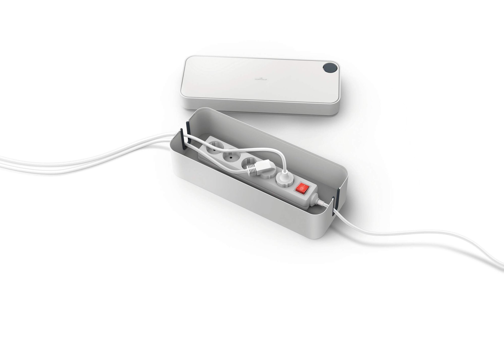 Tame cable chaos and effortlessly declutter your space with CAVOLINE our award winning cable management tool. This sleek Compatibleact box conceals power strips and messy wires, for a safe and tidy setup. They are ventilated and built with flame retardant plastics ensuring an extra layer of safety and protection against electrical hazards.<br><br>The box features 2 cable outlets, they are opposed for air circulation and rubberised to protect your leads. The lid includes a covered slot perfect for USB cables making it quick and easy to charge mobile devices. Rubberised pads on the base add stability and protect your floor and desk from scratches.<br><br>Create a safe and tidy working environment<br><br>Awards:<br><br>If Design Award 2020<br>Red Dot Design Award 2020<br>ICONIC Innovative Interior Winner 2021<br><br>Specifications:<br><br>Dimensions: 156 x 139 x 406 mm (L x H x W)<br>Fits: 5 Plug extension leads<br>Quantity: 1<br><br>Made in Germany and built to last