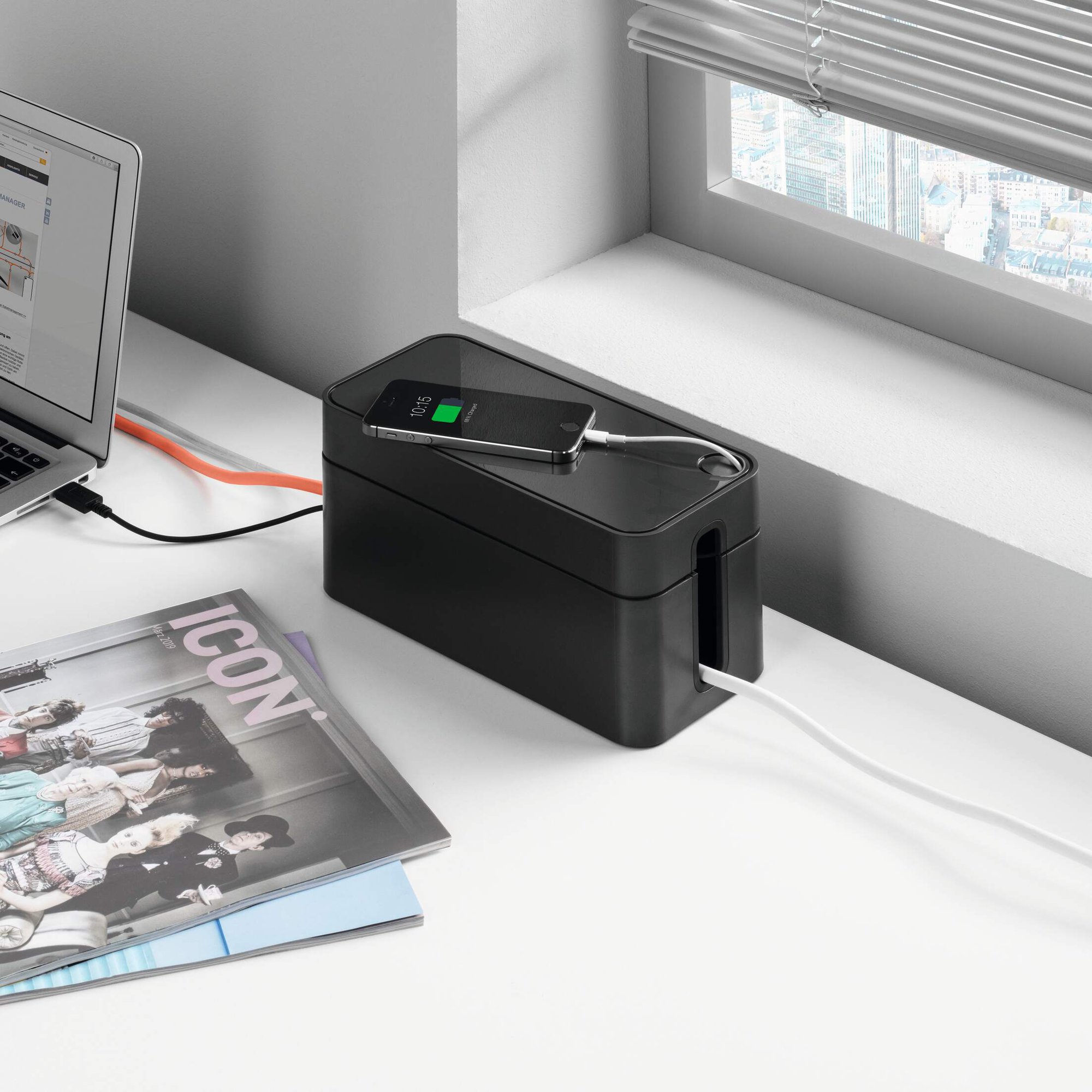 Tame cable chaos and effortlessly declutter your space with CAVOLINE our award winning cable management tool. This sleek Compatibleact box conceals power strips and messy wires, for a safe and tidy setup. They are ventilated and built with flame retardant plastics ensuring an extra layer of safety and protection against electrical hazards.<br><br>The box features 2 cable outlets, they are opposed for air circulation and rubberised to protect your leads. The lid includes a covered slot perfect for USB cables making it quick and easy to charge mobile devices. Rubberised pads on the base add stability and protect your floor and desk from scratches.<br><br>Create a safe and tidy working environment<br><br>Awards:<br><br>If Design Award 2020<br>Red Dot Design Award 2020<br>ICONIC Innovative Interior Winner 2021<br><br>Specifications:<br><br>Dimensions: 128 x 116 x 246 mm (L x H x W)<br>Fits: 3 Plug extension leads<br>Quantity: 1<br><br>Made in Germany and built to last