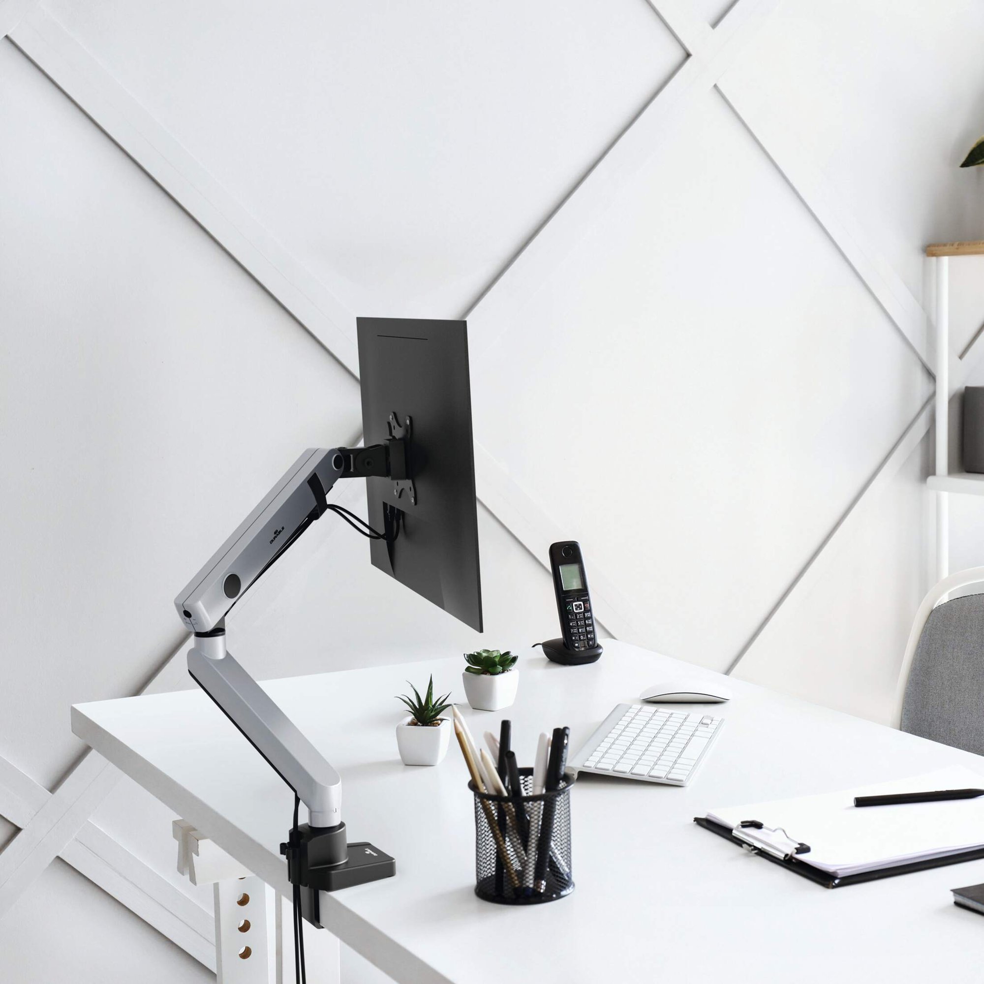 Built and designed in Germany Durable€™s new innovative monitor arms are the solution for efficient and ergonomic mounting. They feature an exceptional range of movement, smart cable management and superior build quality.<br><br>Two mounting options are included out of the box, a traditional table clamp and a through desk (table pin) for mounting flexibility.<br><br>With a design that has been thought through down to the finest detail, our new monitor arms can be easily and quickly installed by just one person with effortless tool free adjustment.<br><br>For screens from: 17 to 32 Inches<br>Max weight: 8 kg<br>Mounting options: Desk clamp and through desk<br>Table thickness: 10 - 50 mm