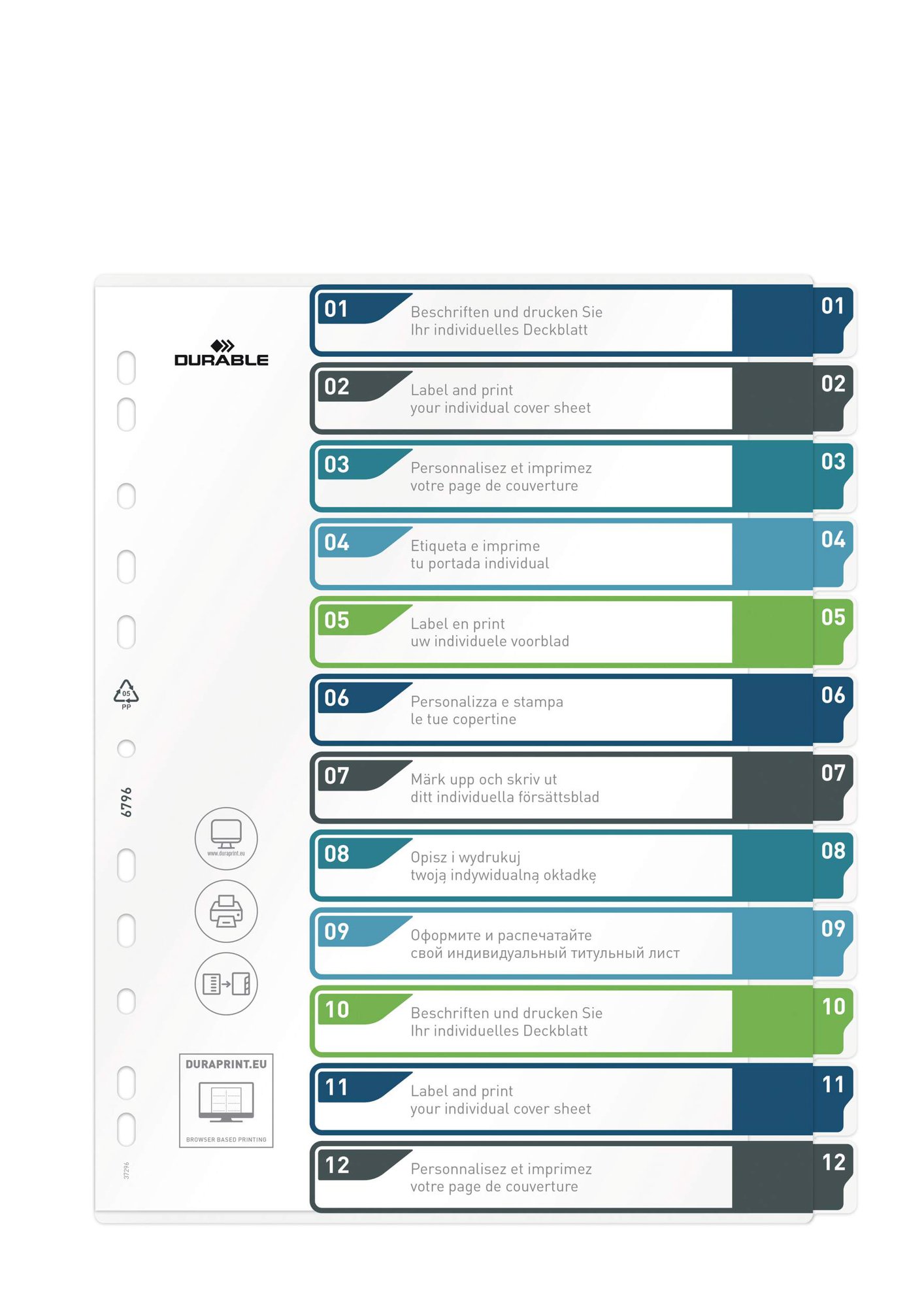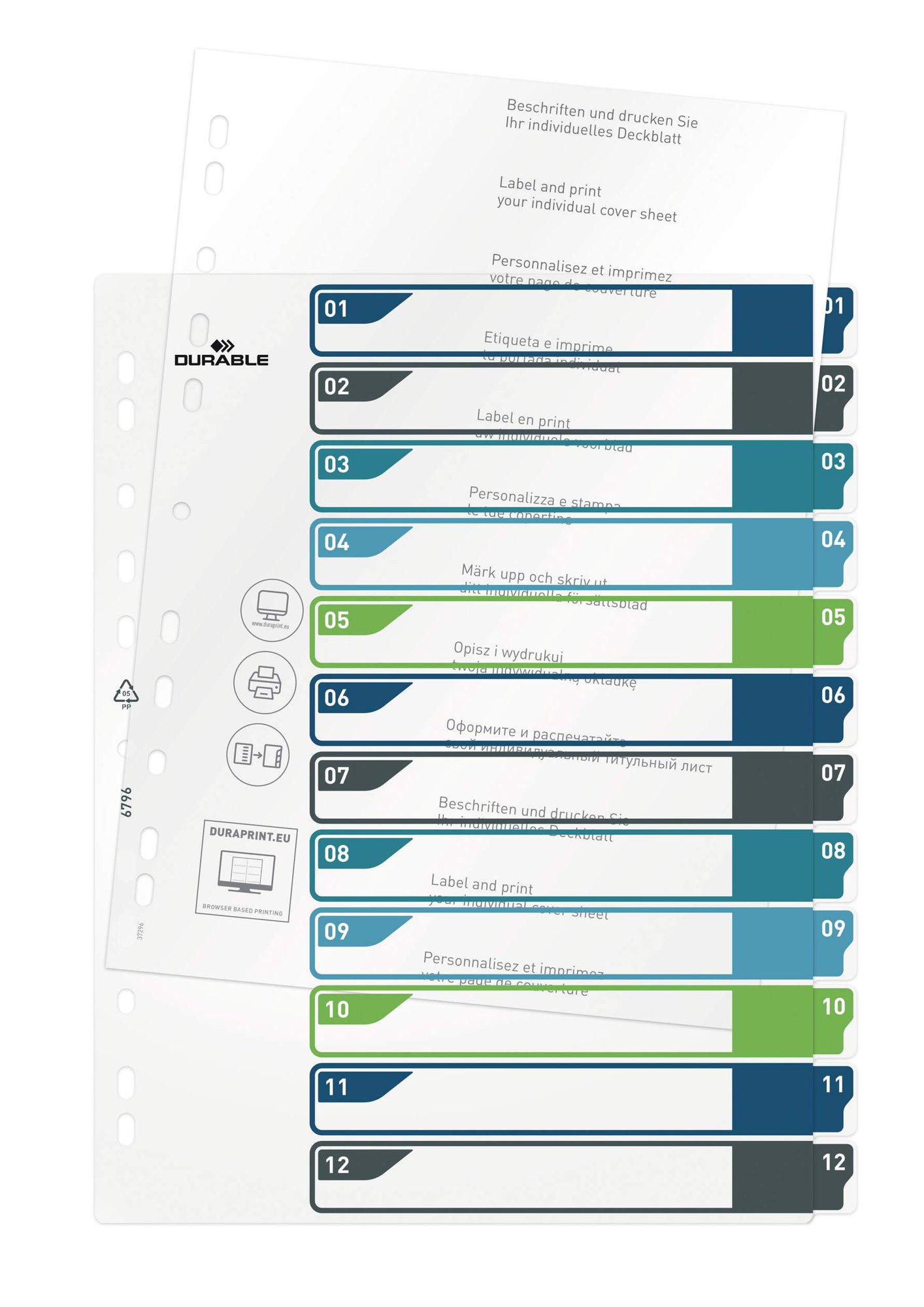 Durable tear-resistant file dividers with 12 numbered tabs for separating your documents numerically. The German designed index dividers use universal punching for maximum Compatibleatibility and includes a cover sheet for labelling.<br><br>The dividers are made from strong copy-safe polypropylene to extend their lifecycle, they are built to be re-used time and time again.<br><br>Dimensions: 245 x 305 (W x H)<br>Punching: Universal<br><br>Made in Germany and built to last