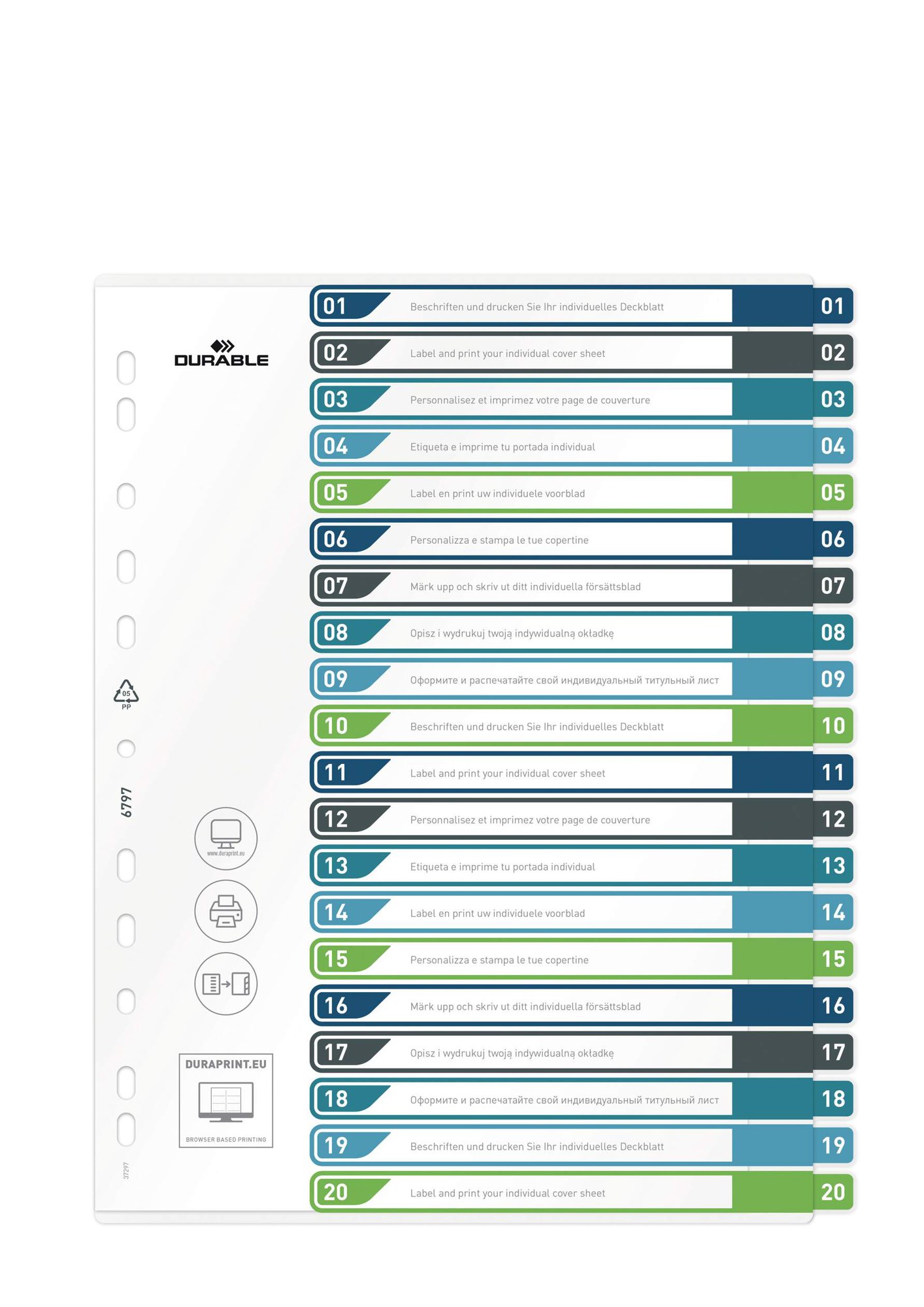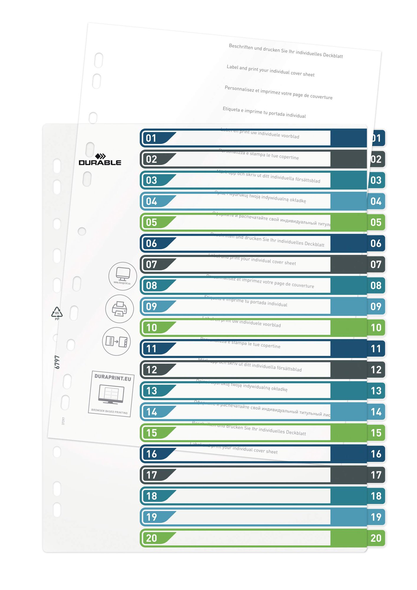 Durable tear-resistant file dividers with 20 numbered tabs for separating your documents numerically. The German designed index dividers use universal punching for maximum Compatibleatibility and includes a cover sheet for labelling.<br><br>The dividers are made from strong copy-safe polypropylene to extend their lifecycle, they are built to be re-used time and time again.<br><br>Dimensions: 245 x 305 (W x H)<br>Punching: Universal<br><br>Made in Germany and built to last