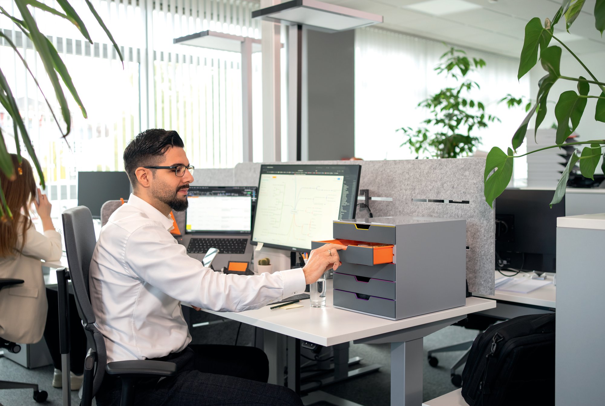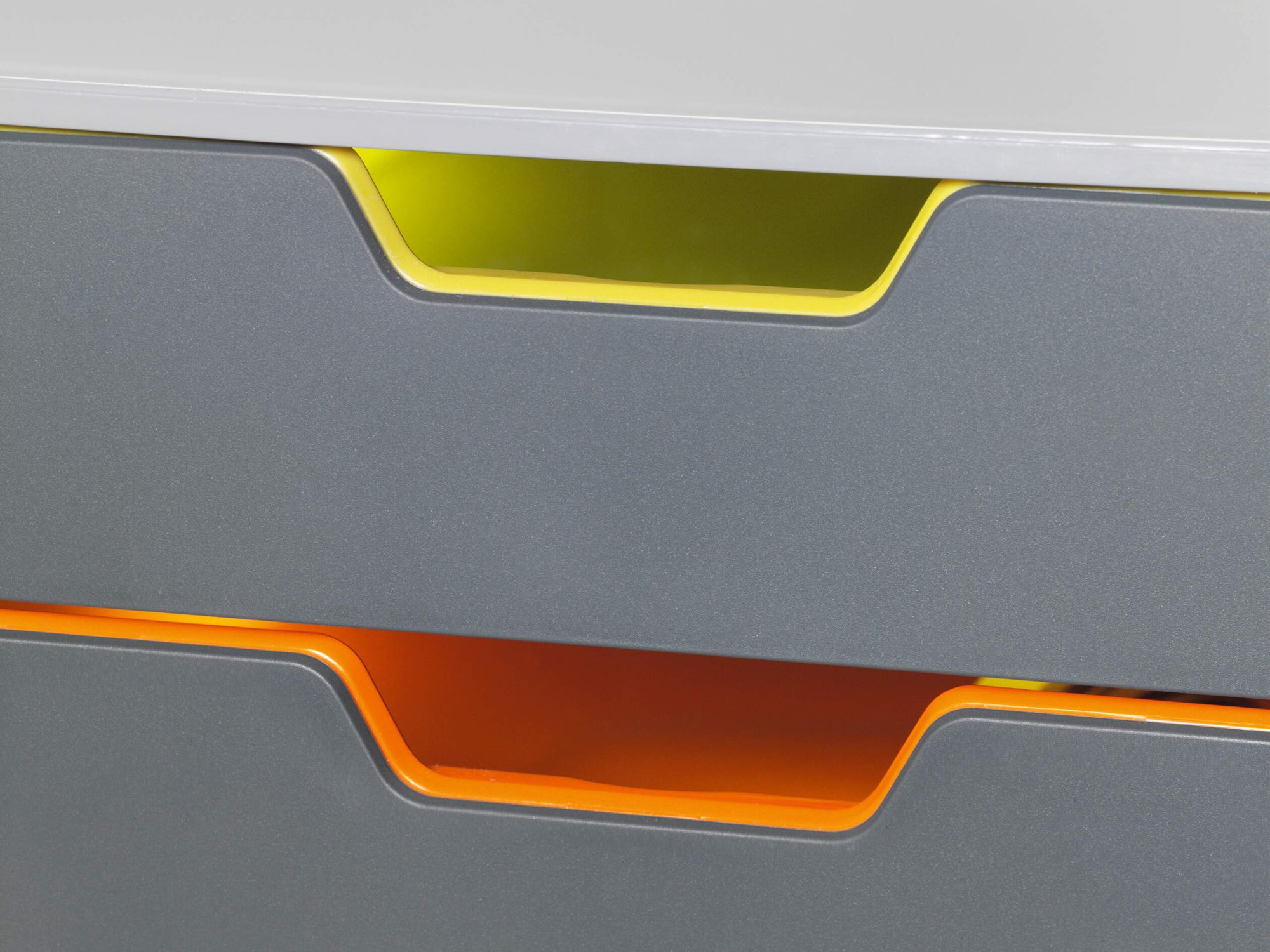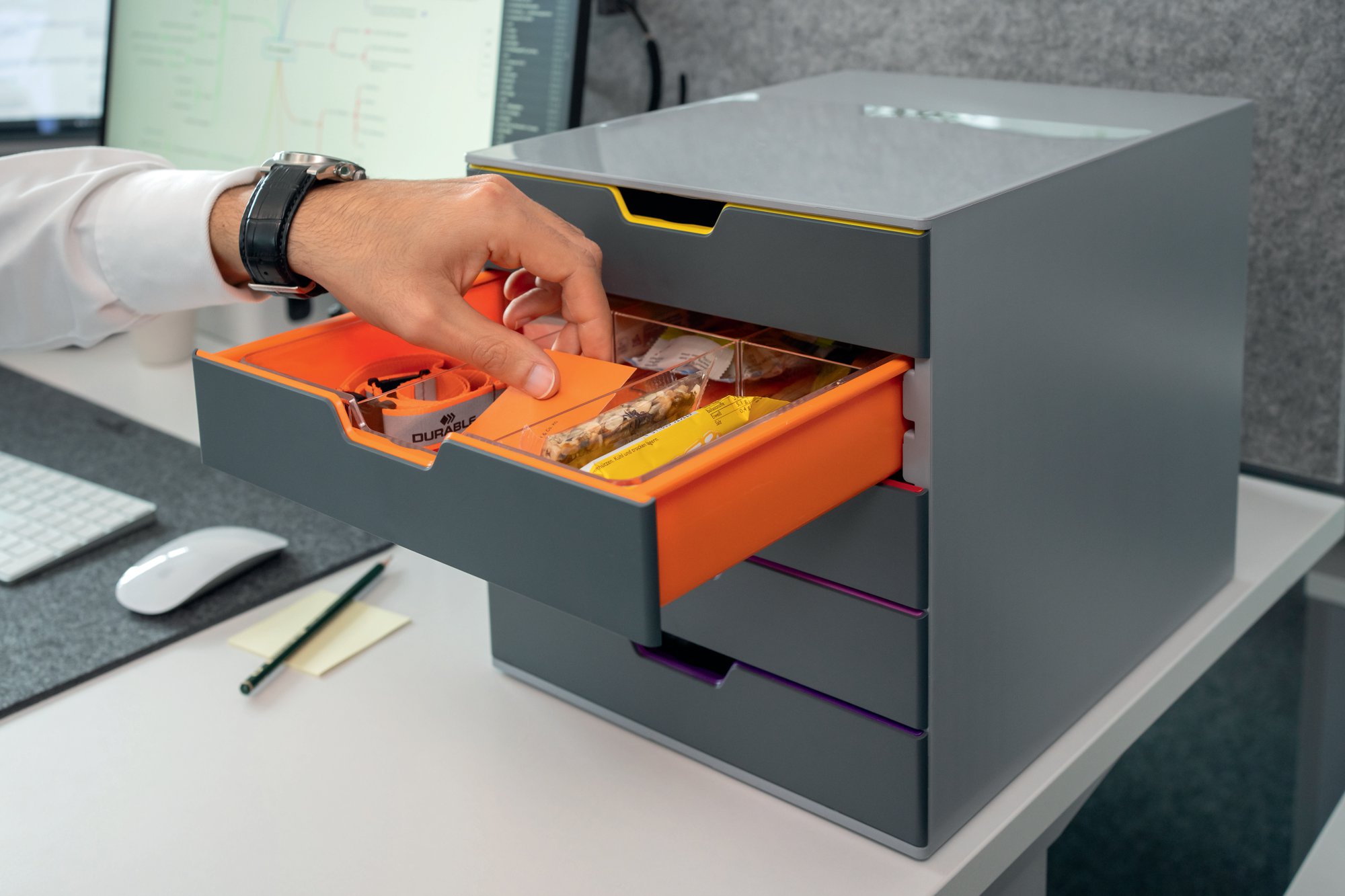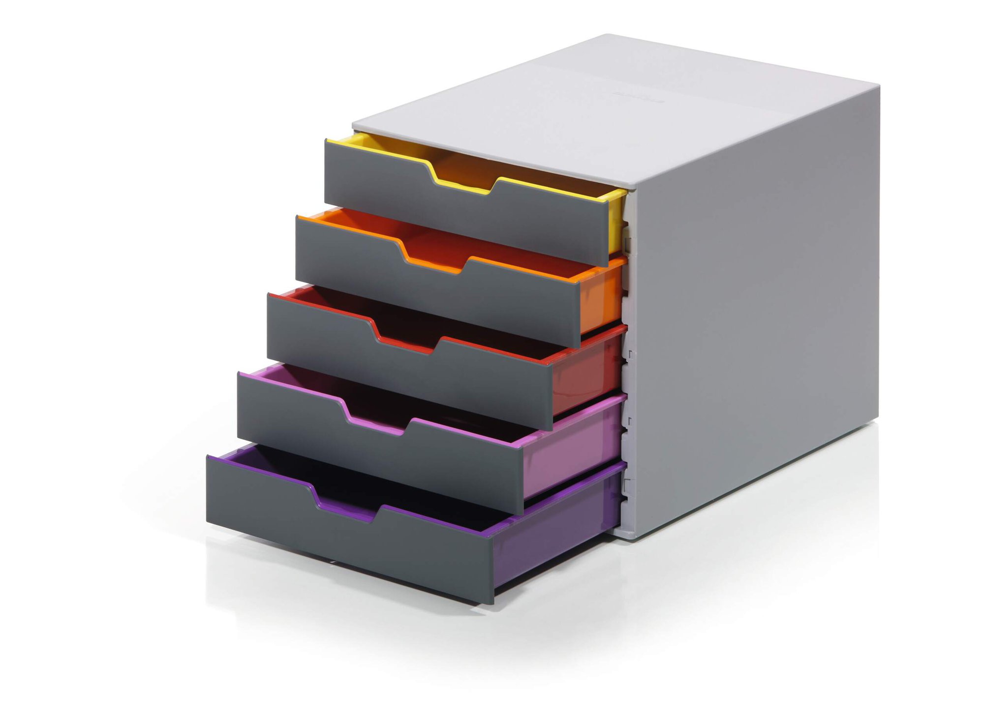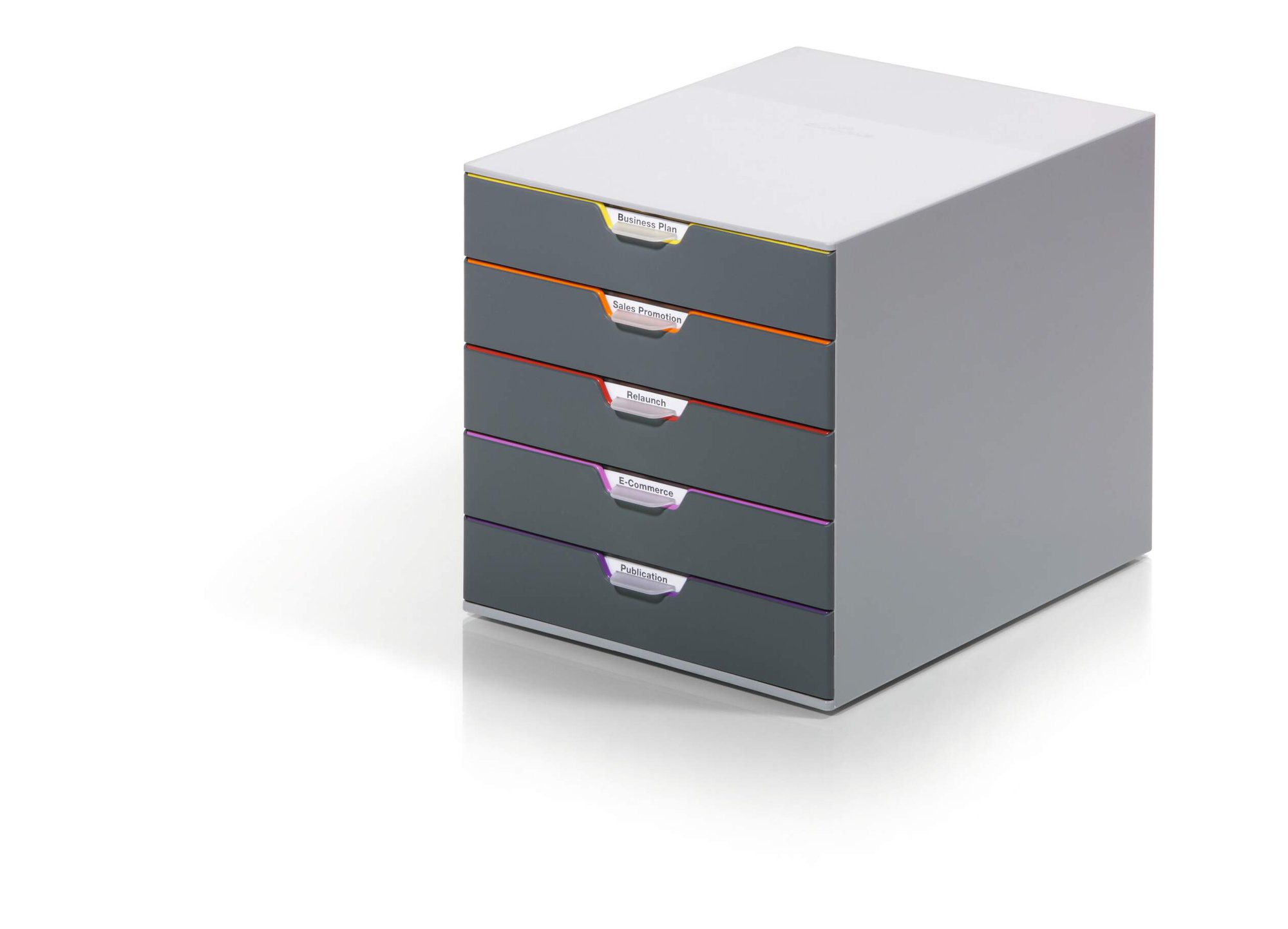 Durable€™s contemporary VARICOLOR drawer box is made of premium-quality plastics with 5 silent smooth-operating drawers. Say goodbye to large filing cabinets and enhance your organisation with colour coloured draws giving you more space for the things you love.<br><br>The unit includes transparent labelling windows and easily exchangeable printable inserts with digital templates for easy organisation.<br><br>All VARICOLOR draws are stackable and feature anti-slip plastic feet for stability and the protection of your desk.<br><br>Includes:<br><br>1 x VARICOLOR draw box<br>5 x Clear labelling windows<br>5 x Printable labelling inserts<br><br>Size: 280 x 292 x 356 mm (W x H x L)<br>Paper sizes: A4, C4, folio and letter size formats<br><br>Made in Germany and built to last