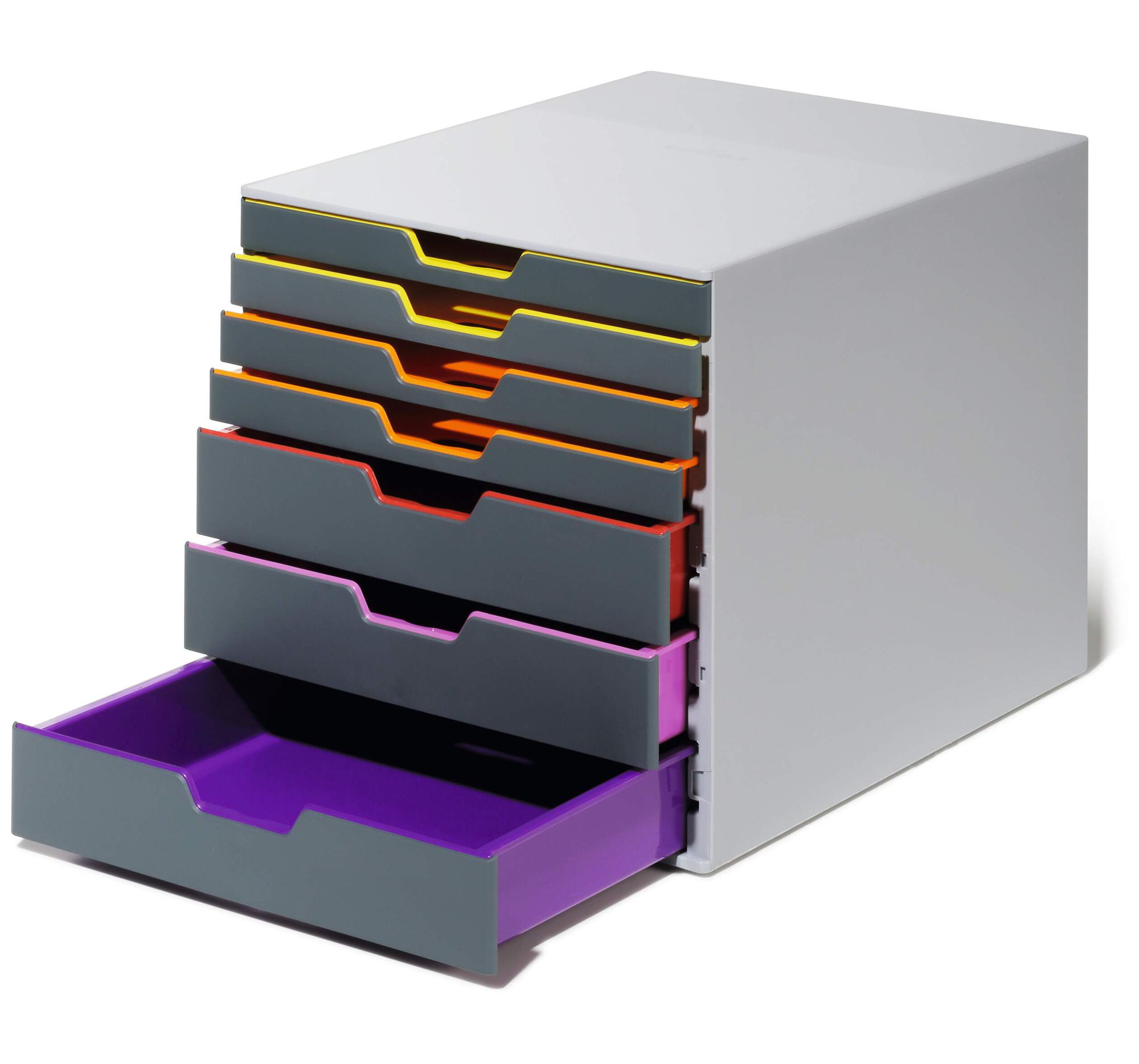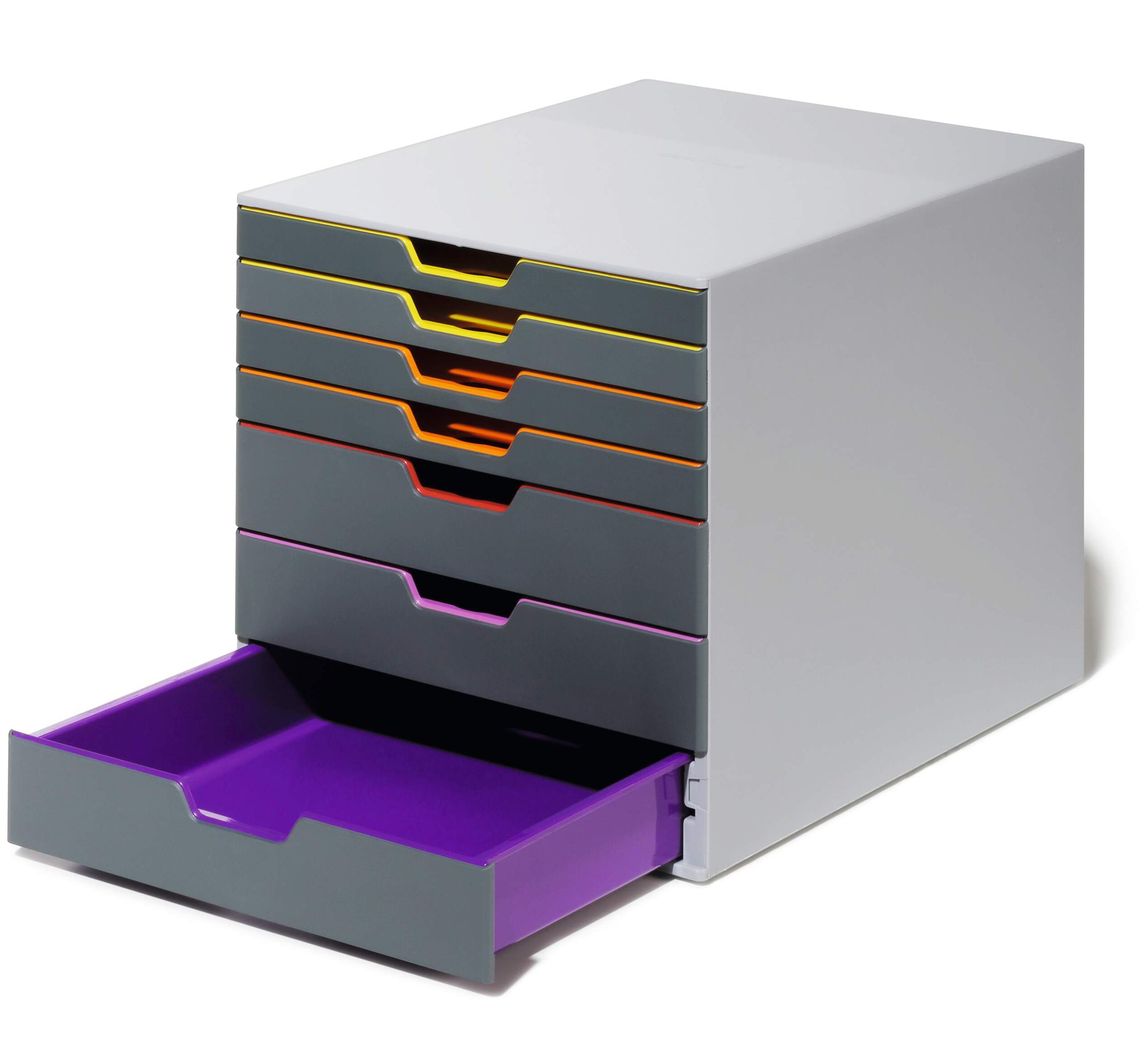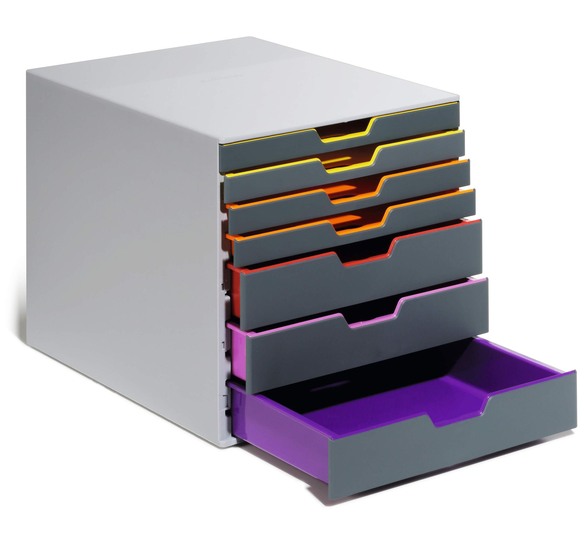 Durable€™s contemporary VARICOLOR drawer box is made of premium-quality plastics with 7 silent smooth-operating drawers. Say goodbye to large filing cabinets and enhance your organisation with colour coloured draws giving you more space for the things you love.<br><br>The unit includes transparent labelling windows and easily exchangeable printable inserts with digital templates for easy organisation.<br><br>All VARICOLOR draws are stackable and feature anti-slip plastic feet for stability and the protection of your desk.<br><br>Includes:<br><br>1 x VARICOLOR draw box<br>7 x Clear labelling windows<br>7 x Printable labelling inserts<br><br>Size: 280 x 292 x 356 mm (W x H x L)<br>Paper sizes: A4, C4, folio and letter size formats<br><br>Made in Germany and built to last