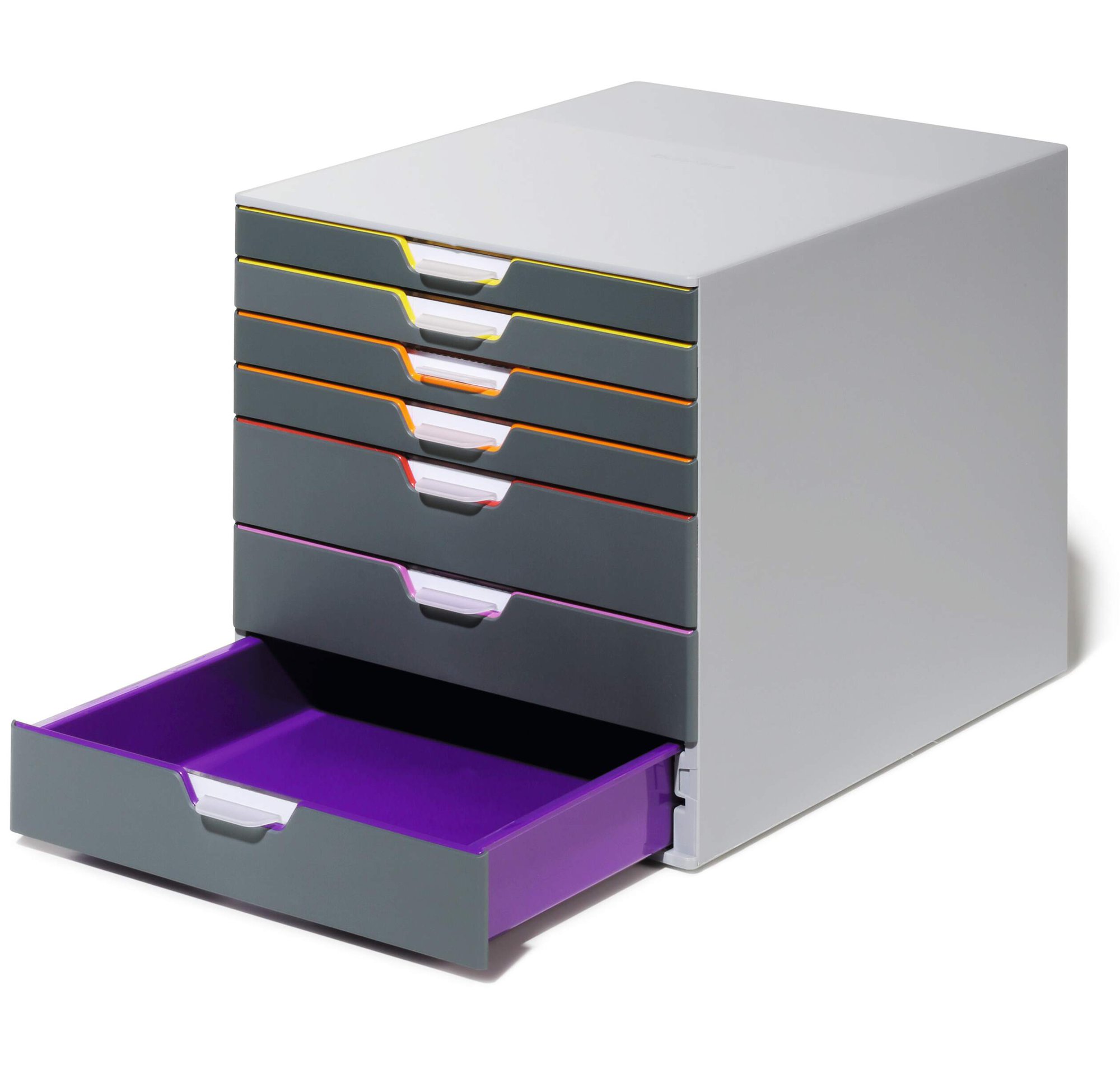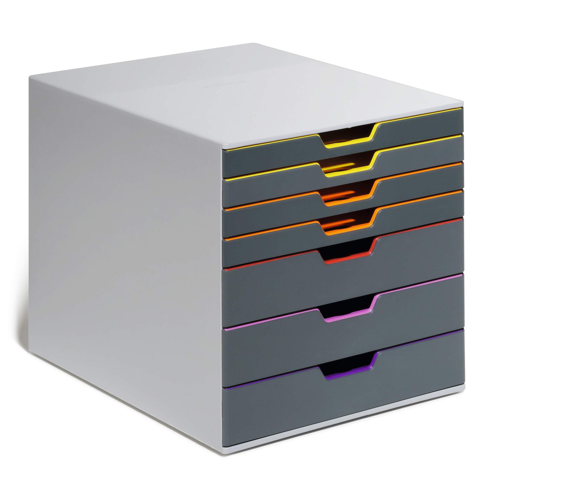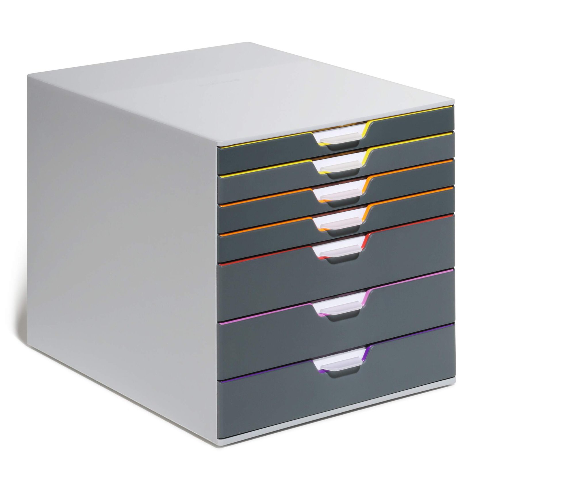 Durable€™s contemporary VARICOLOR drawer box is made of premium-quality plastics with 7 silent smooth-operating drawers. Say goodbye to large filing cabinets and enhance your organisation with colour coloured draws giving you more space for the things you love.<br><br>The unit includes transparent labelling windows and easily exchangeable printable inserts with digital templates for easy organisation.<br><br>All VARICOLOR draws are stackable and feature anti-slip plastic feet for stability and the protection of your desk.<br><br>Includes:<br><br>1 x VARICOLOR draw box<br>7 x Clear labelling windows<br>7 x Printable labelling inserts<br><br>Size: 280 x 292 x 356 mm (W x H x L)<br>Paper sizes: A4, C4, folio and letter size formats<br><br>Made in Germany and built to last