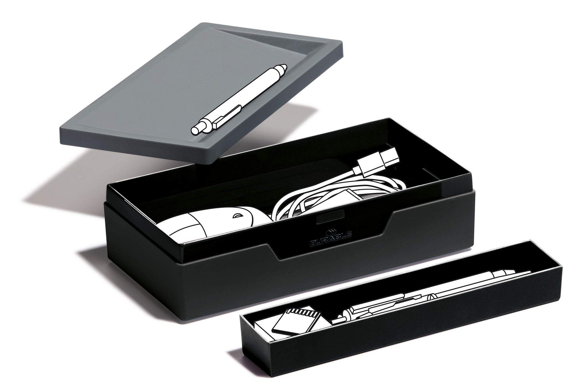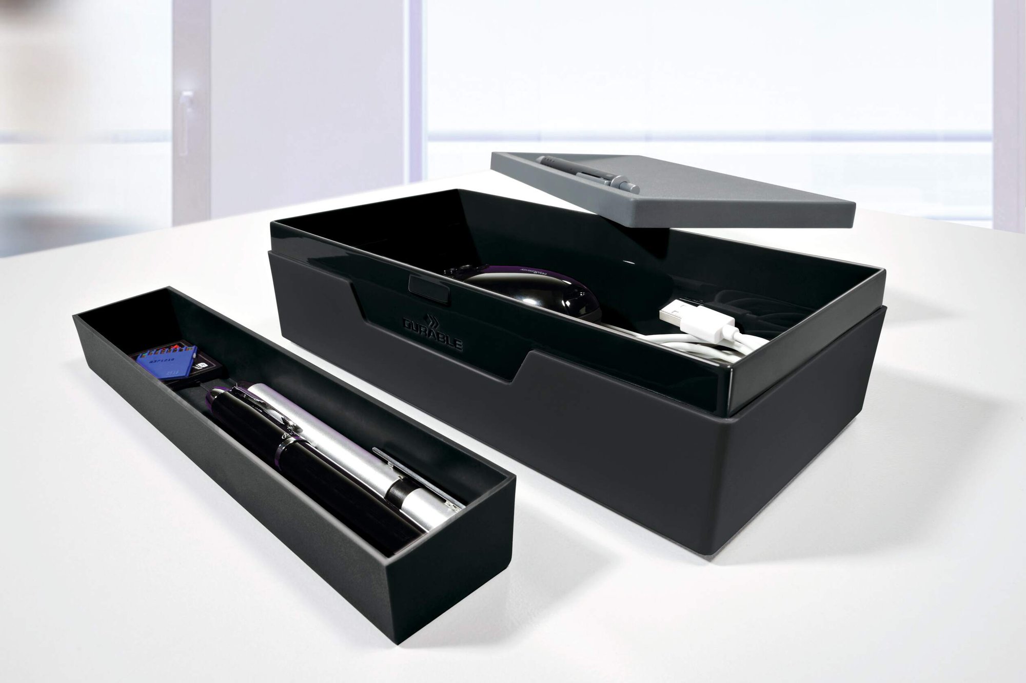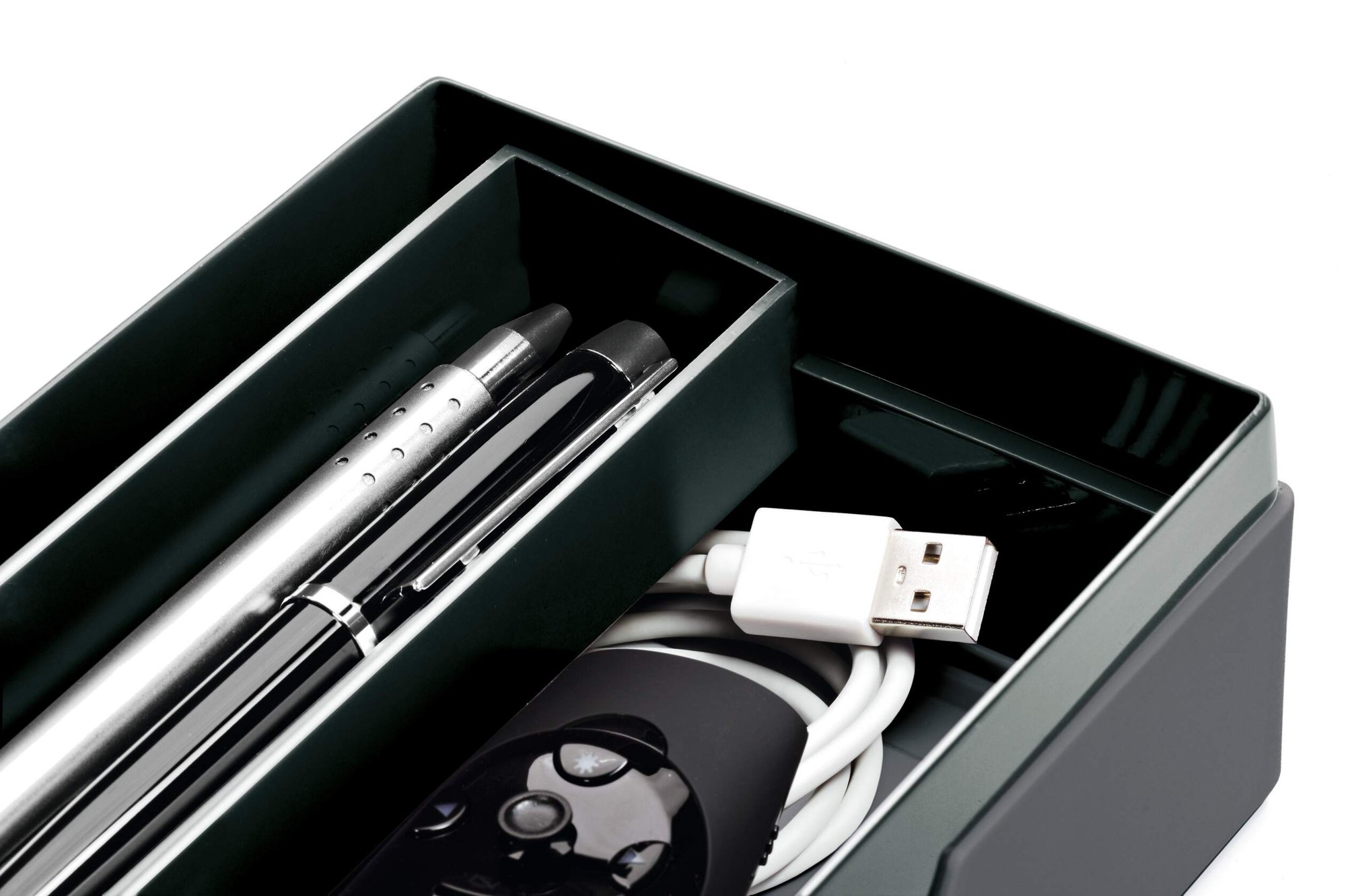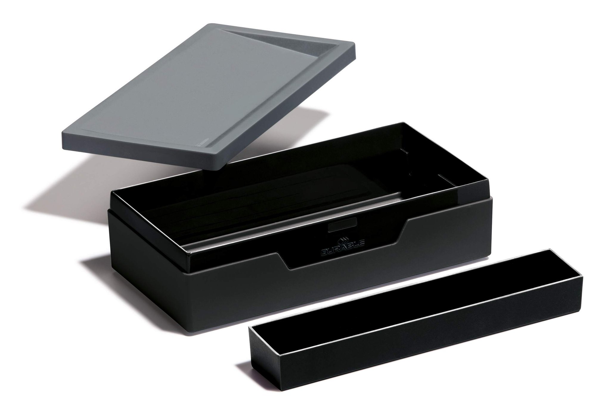The VARICOLOR Job Case is a Compatibleact modern design that features a sleek matt exterior with piano black gloss accents. The patented modular design contains a removable stationary tray, a lid that doubles as a pen tray and a versatile main Compatibleartment with an anti-slip ribbed texture.<br><br>The contemporary tech case is perfect for storing chargers, mice, earphones, pens, passports and more. The perfect Compatibleanion for those who work remotely, hot desk and travel.<br><br>The case includes integrated anti-slip rubber feet to ensure a stable base and protect your table from scratches.<br><br>Dimensions: 235 x 122 x 62 mm (L x W x H)<br>Quantity: 1<br><br>Made in Germany and built to last