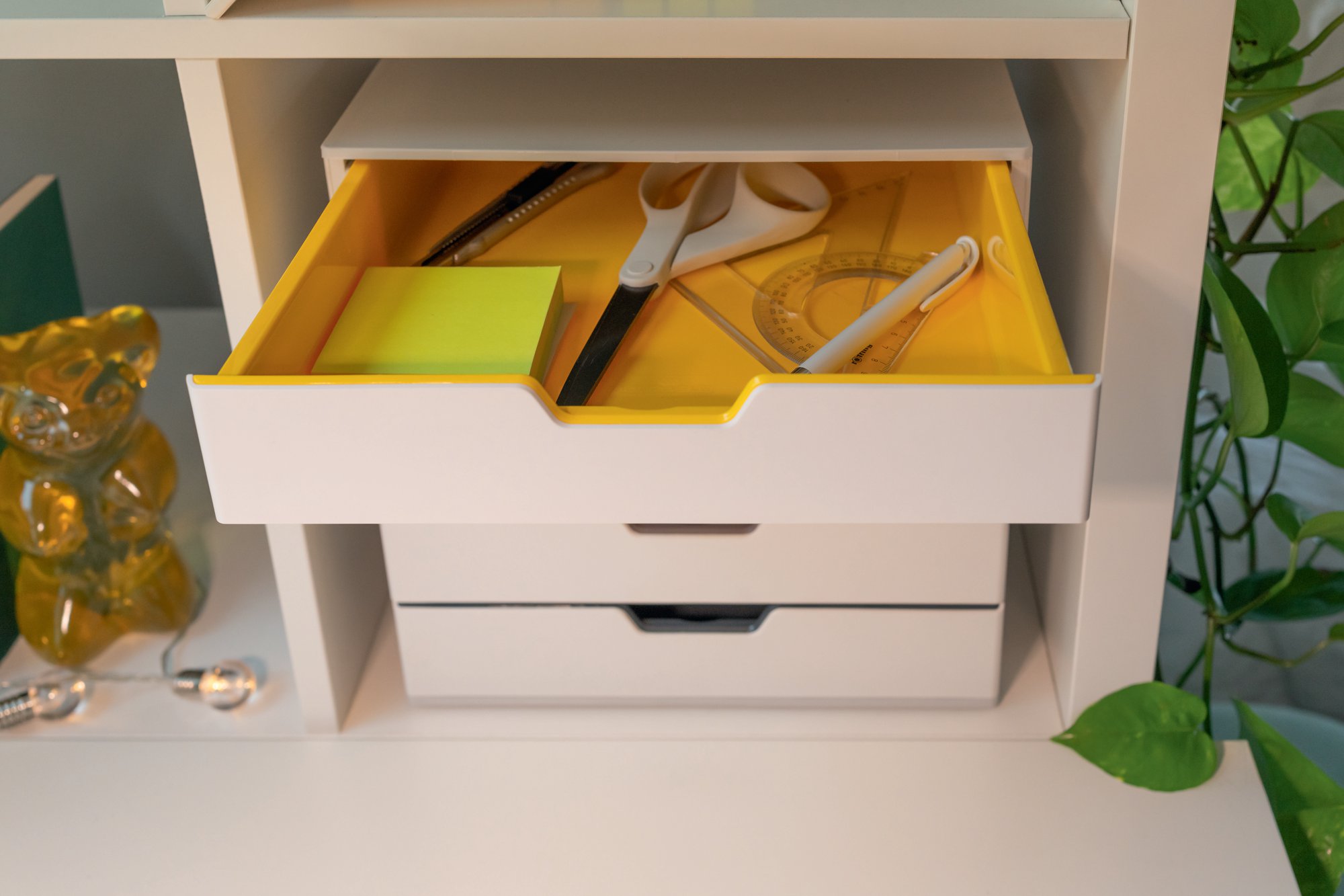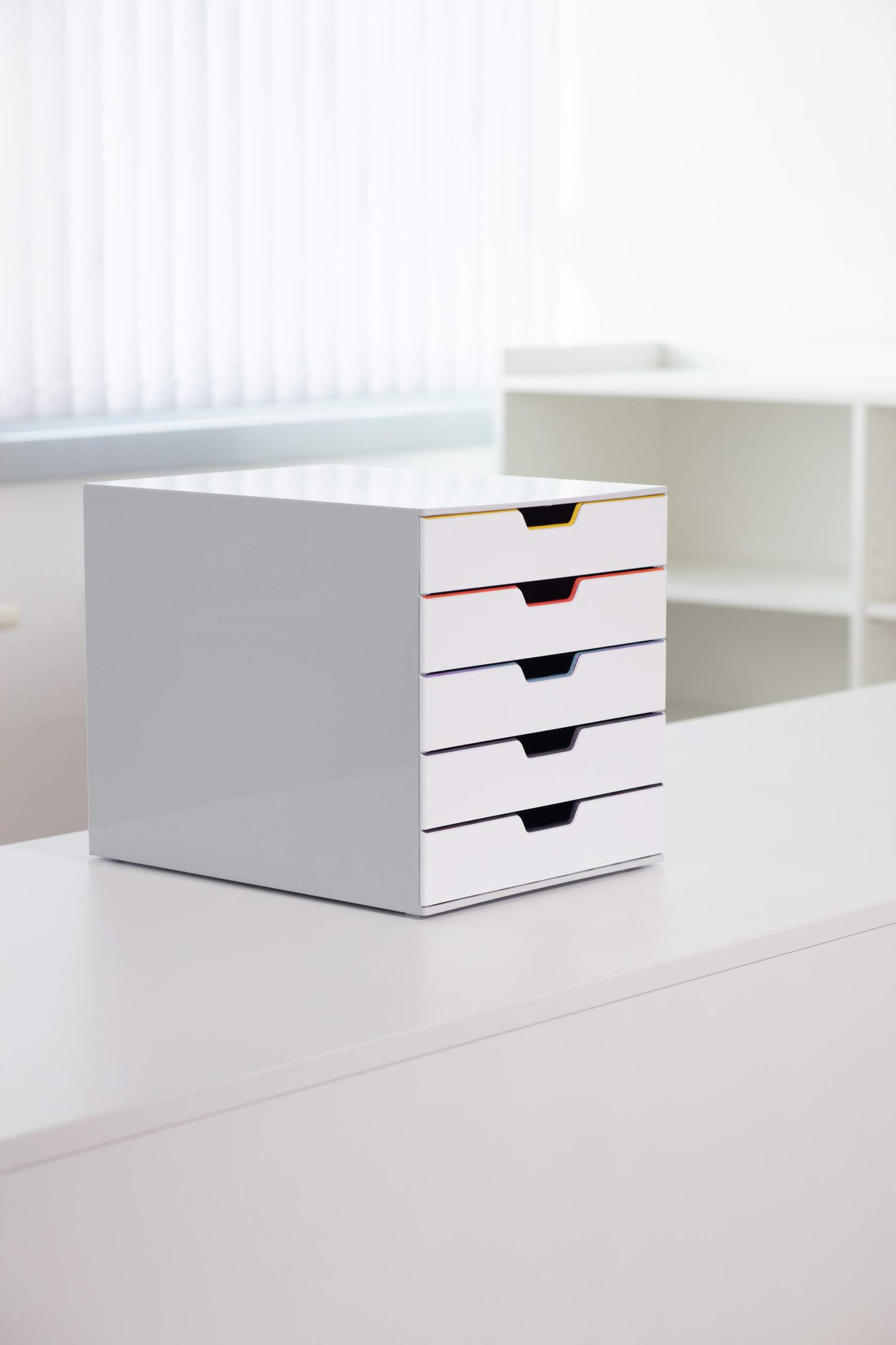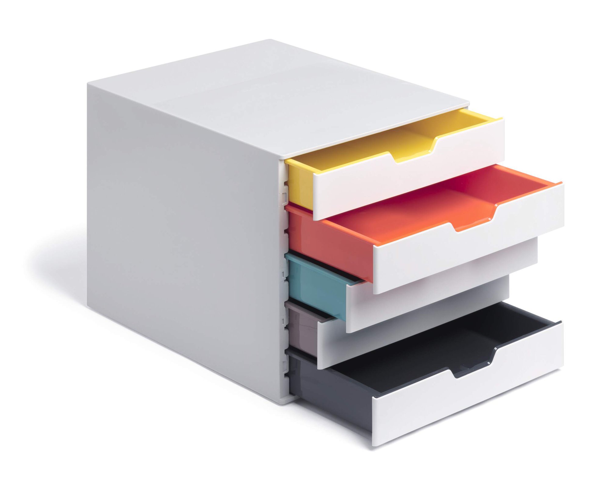 Durable€™s contemporary VARICOLOR MIX drawer box is made of premium-quality plastics with 5 silent smooth-operating drawers. Say goodbye to large filing cabinets and enhance your organisation with colour coloured draws giving you more space for the things you love.<br><br>The unit includes transparent labelling windows and easily exchangeable printable inserts with digital templates for easy organisation.<br><br>All VARICOLOR draws are stackable and feature anti-slip plastic feet for stability and the protection of your desk.<br><br>Includes:<br><br>1 x VARICOLOR draw box<br>5 x Clear labelling windows<br>5 x Printable labelling inserts<br><br>Size: 280 x 292 x 356 mm (W x H x L)<br>Paper sizes: A4, C4, folio and letter size formats<br><br>Made in Germany and built to last