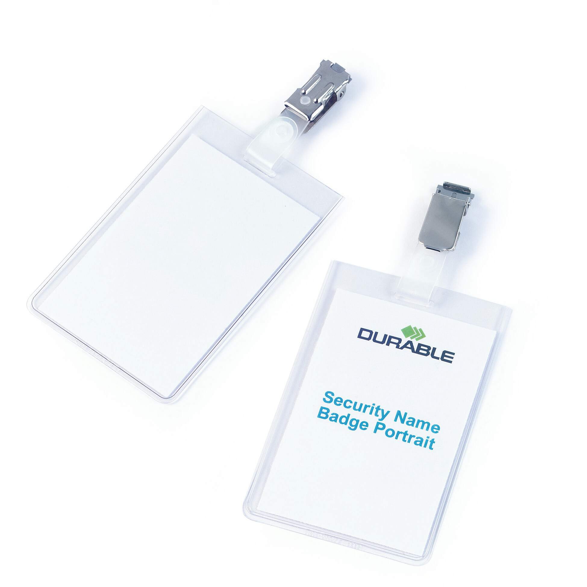 A transparent portrait hard PVC plastic name badge featuring rotating metal fastener to keep the badge sitting vertically. The clip cut-out allows combination with chain, badge reel or lanyards.<br><br>Environmentally friendly in accordance with ISO 14021: includes recycled material and is 100% recyclable.<br><br>Provided with 25 pre-cut blank insert cards<br>Compatible with printable inserts (product # 145702)<br><br>Made in Germany<br>Insert size: 90 x 60 mm<br>Pack size: 25