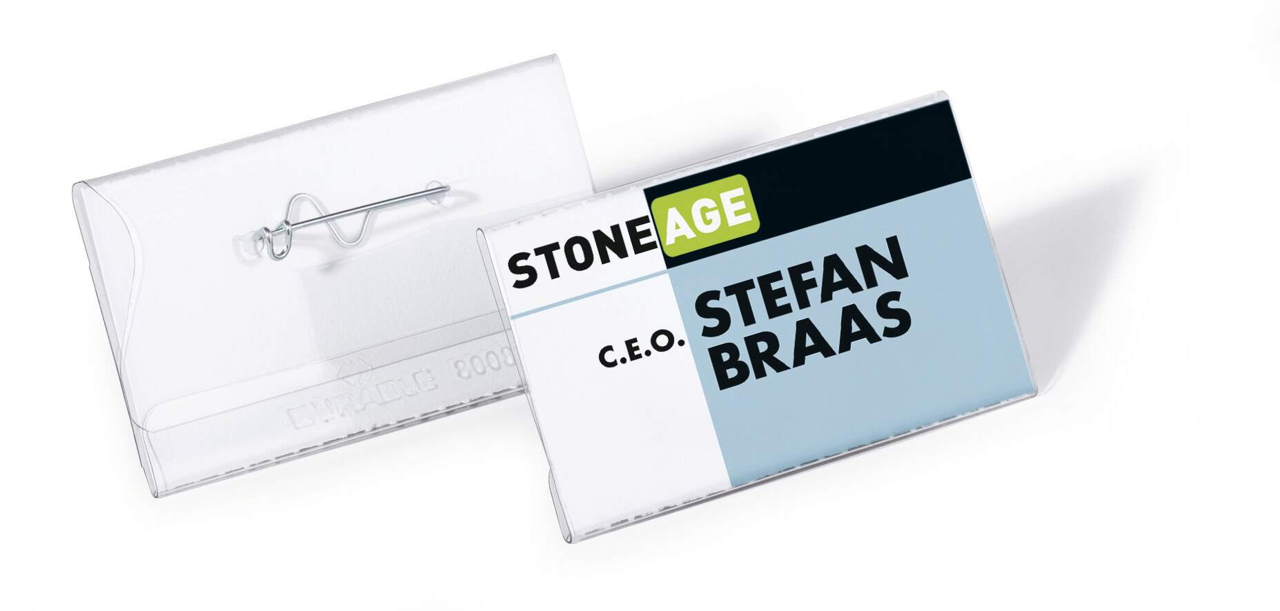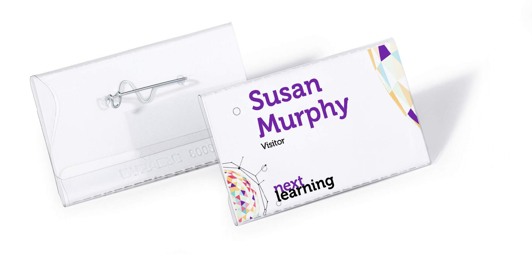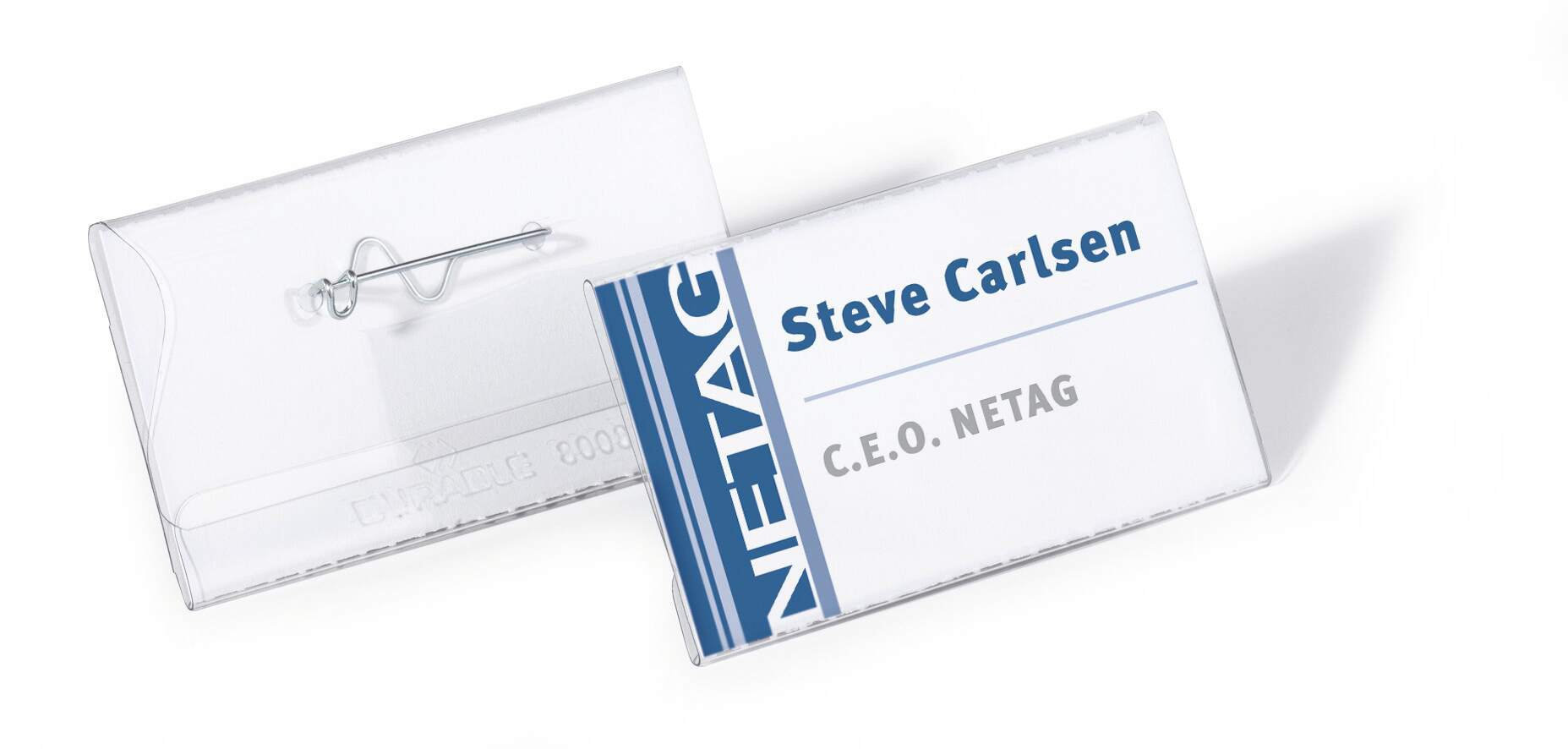 Crystal clear transparent name badges made of premium anti-tear plastics for increased durability. Our name badges feature a curved metal pin with shielded tip to avoid injury and ensure a secure hold on clothing.<br><br>Environmentally friendly in accordance with ISO 14021: includes recycled material and is 100% recyclable.<br><br>Provided with 100 pre-cut blank insert cards<br><br>Insert size: 40 x 75 mm<br>Pack size: 100
