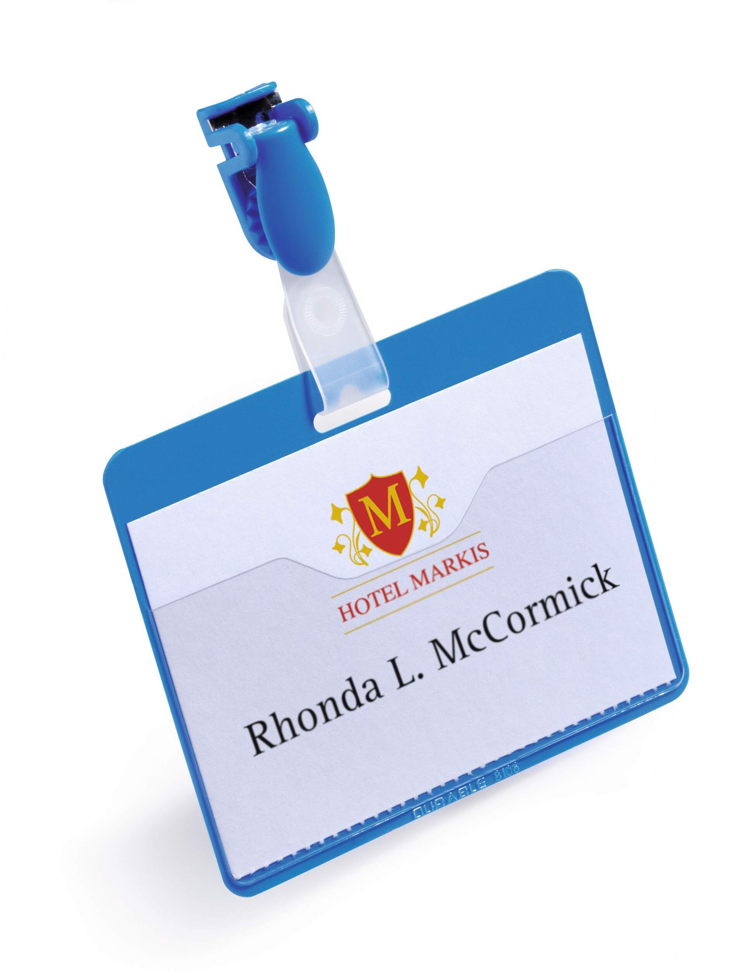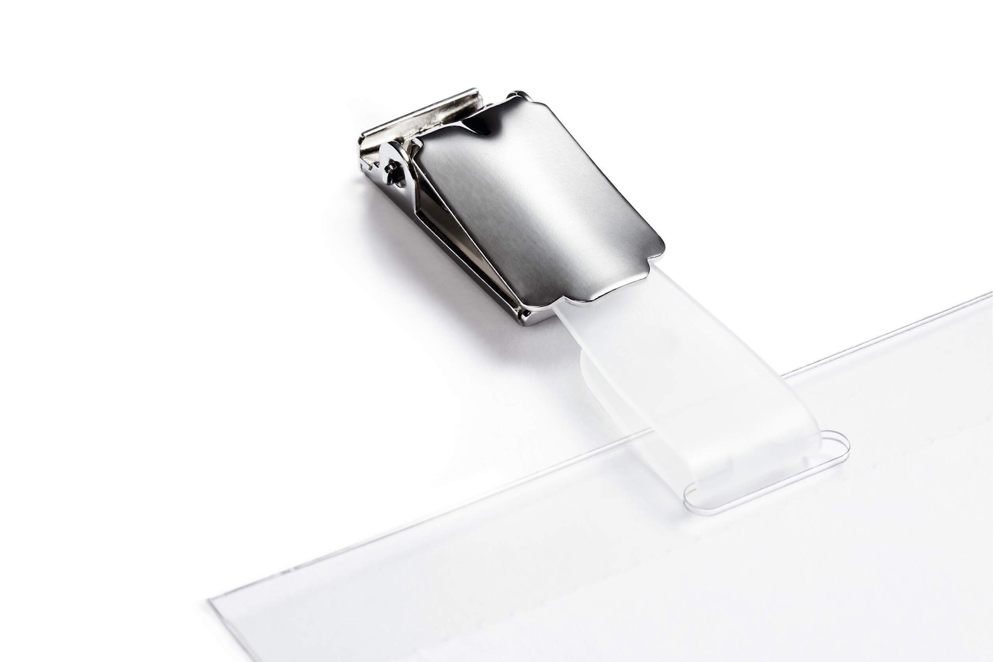 Transparent landscape hard PVC plastic name badges with an open cover for quickly changing inserts. They feature a rotating clip fastener to keep the badge sitting vertically and a clip cut-out for combination with chains, badge reels or lanyards.<br><br>Environmentally friendly in accordance with ISO 14021: includes recycled material and is 100% recyclable.<br><br>Provided with 25 pre-cut blank insert cards<br>Compatible with printable inserts (product # 145602)<br><br>Made in Germany<br>Insert size: 60 x 90 mm<br>Pack size: 25