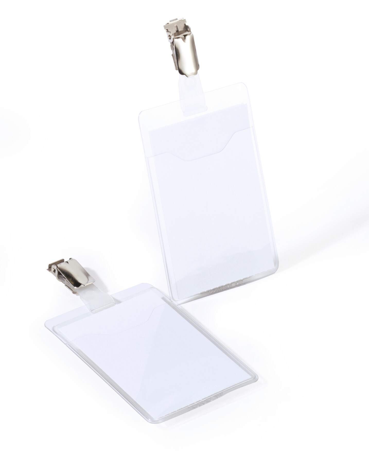 Transparent portrait hard PVC plastic name badges with a partial cover for quickly changing inserts. They feature a rotating clip fastener to keep the badge sitting vertically and a clip cut-out for combination with chains, badge reels and lanyards.<br><br>Environmentally friendly in accordance with ISO 14021: includes recycled material and is 100% recyclable.<br><br>Provided with 25 pre-cut blank insert cards<br>Compatible with printable insert sheets (product # 145702)<br><br>Made in Germany<br>Insert size: 90 x 60 mm<br>Pack size: 25
