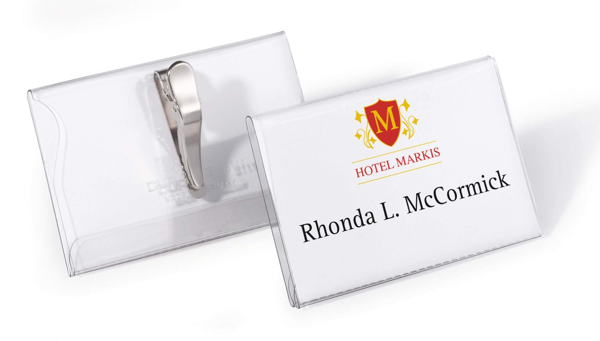 Crystal clear transparent name badges made of premium anti-tear plastics for increased durability. Say goodbye to fiddling with labels with our ergonomic thumb slot that makes insertion and removal of inserts a breeze.<br><br>Environmentally friendly in accordance with ISO 14021: contains recycled material and is 100% recyclable.<br><br>Provided with 25 pre-cut blank insert cards<br><br>Made in Germany<br>Insert size: 54 x 90 mm<br>Pack size: 25