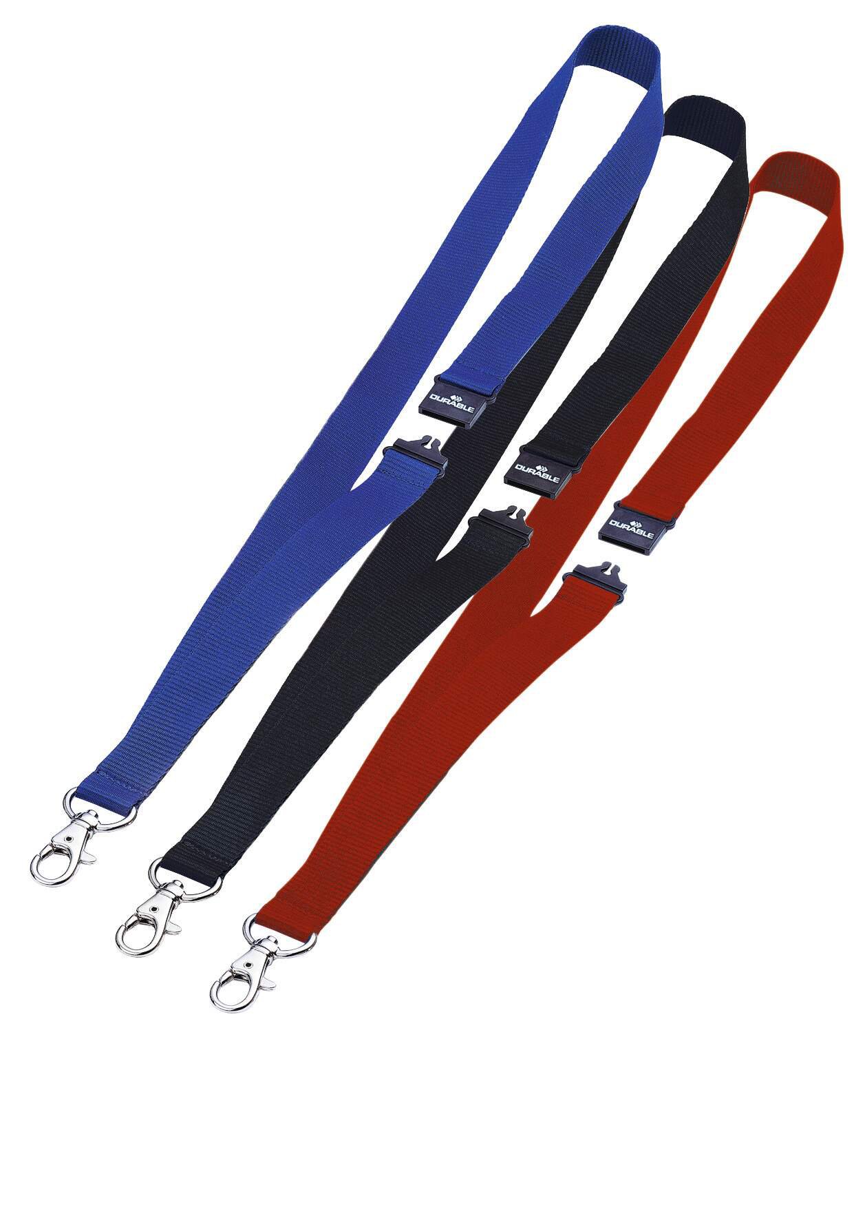 Our German-designed carabiner lanyards are made of soft comfortable fabric and include a built-in safety release protecting the user if the strap becomes caught or trapped. The easy clip attachment can be used with all Durable name badges with pins or punched holes.<br><br>Made in Germany and environmentally friendly in accordance with ISO 14021: includes 50% recycled materials and is 100% recyclable.<br><br>Kind to the planet and built to last.<br><br>Width: 2 cm<br>Length: 44 cm<br>Quantity: 10