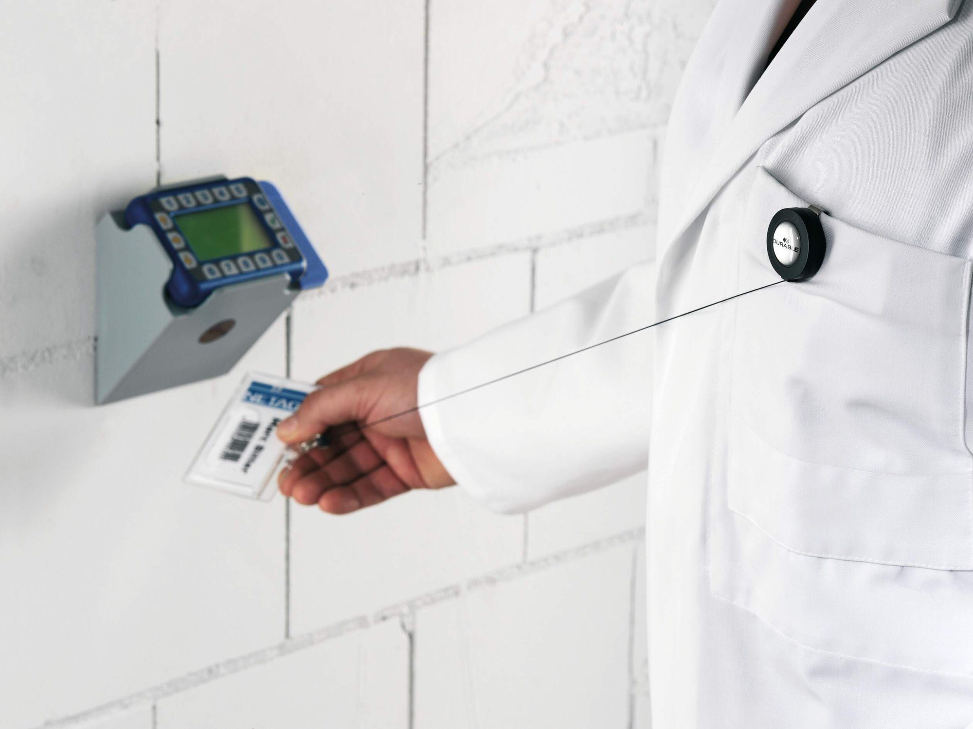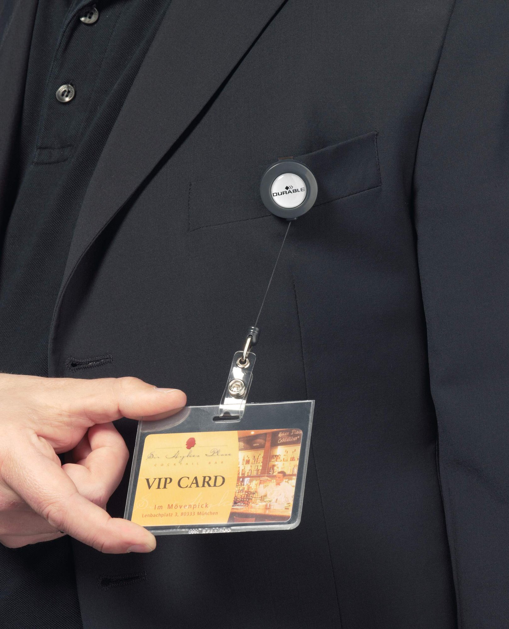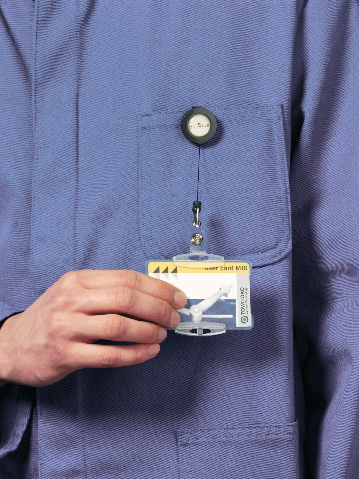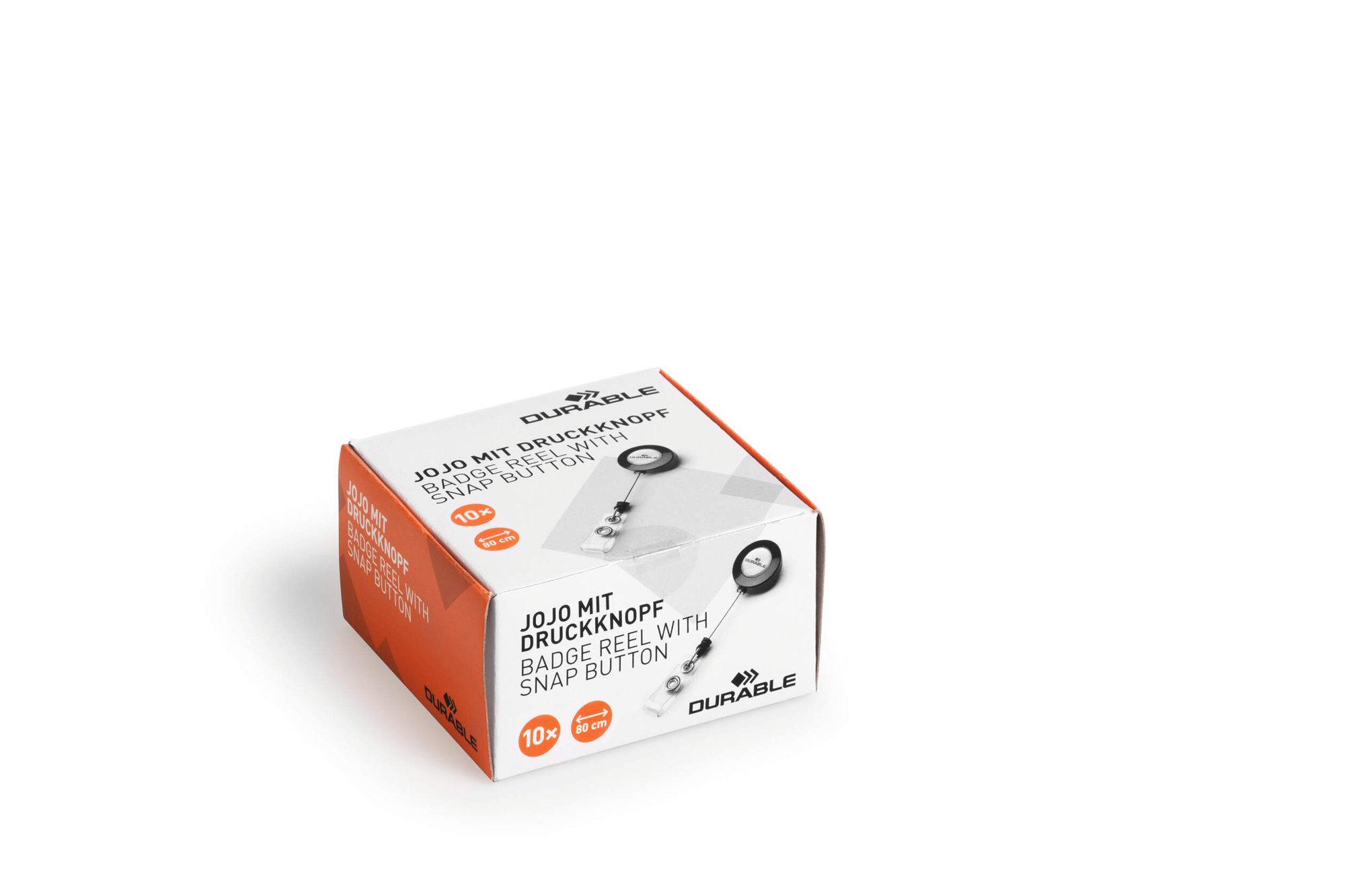 Stylish German-designed badge reel with stud loop fastener Compatible with all punched hole Durable name badges. The reel features a secure metal clip on the reverse for attaching to pockets or belts. Perfect for workplaces with high levels of security.<br><br>Made in Germany and environmentally friendly in accordance with ISO 14021: includes 20% recycled materials and is 100% recyclable.<br><br>Kind to the planet and built to last.<br><br>Attachment: Press stud loop<br>Reel length: 80 cm<br>Supported weight: 20 g<br>Quantity: 10