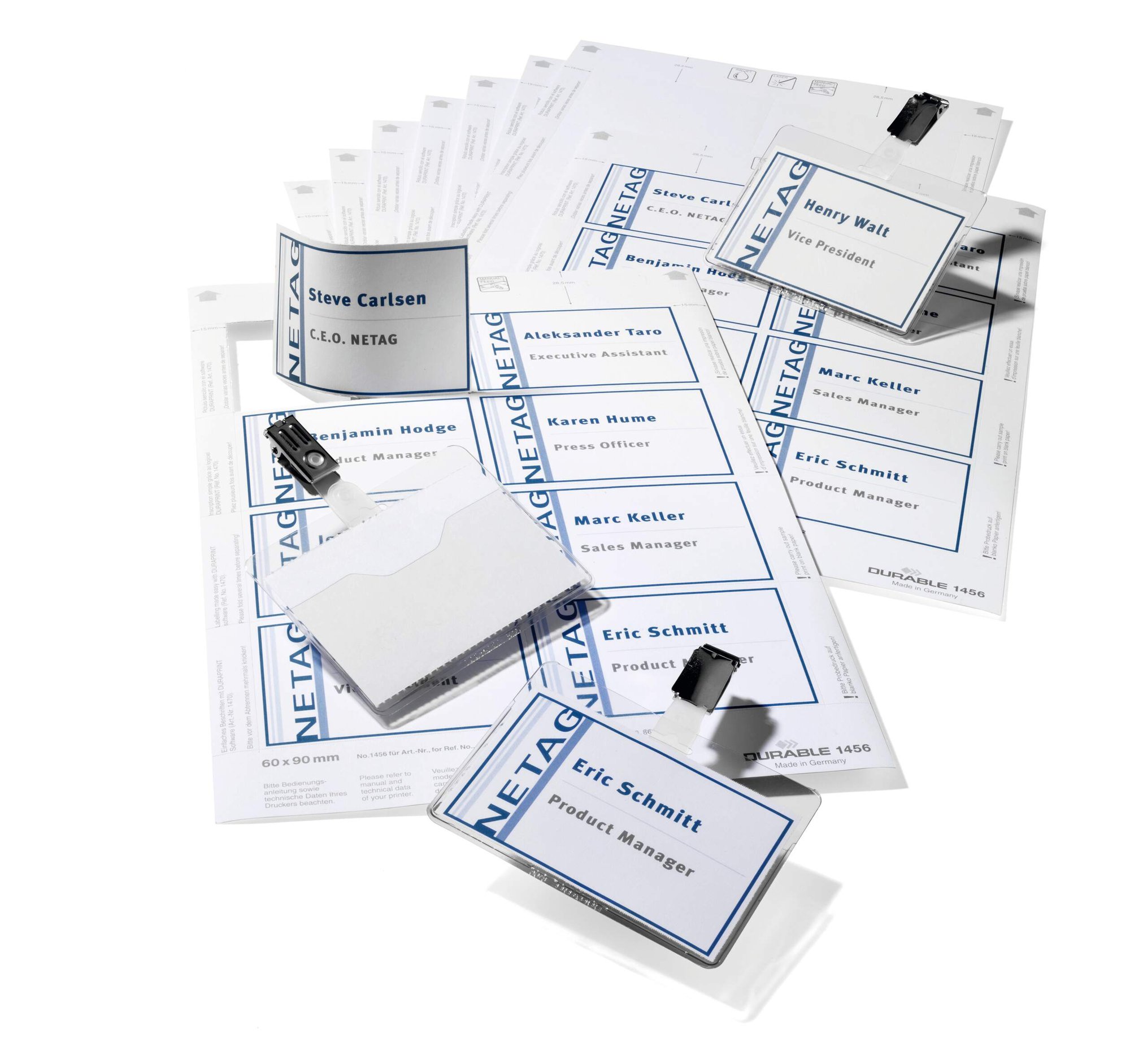 A crystal clear anti-tear hard PVC plastic name badge featuring a rotating clip fastener to keep the badge sitting vertically. They include partial covers for quickly exchanging inserts and a clip cut-out for chains, badge reels and lanyards.<br> <br>Environmentally friendly in accordance with ISO 14021: includes recycled material and is 100% recyclable.<br> <br>Provided with 20 pre-cut blank insert cards <br>Compatible with printable inserts (product # 145702)<br> <br>Made in Germany <br>Insert size: 60 x 90 mm <br>Pack size: 20