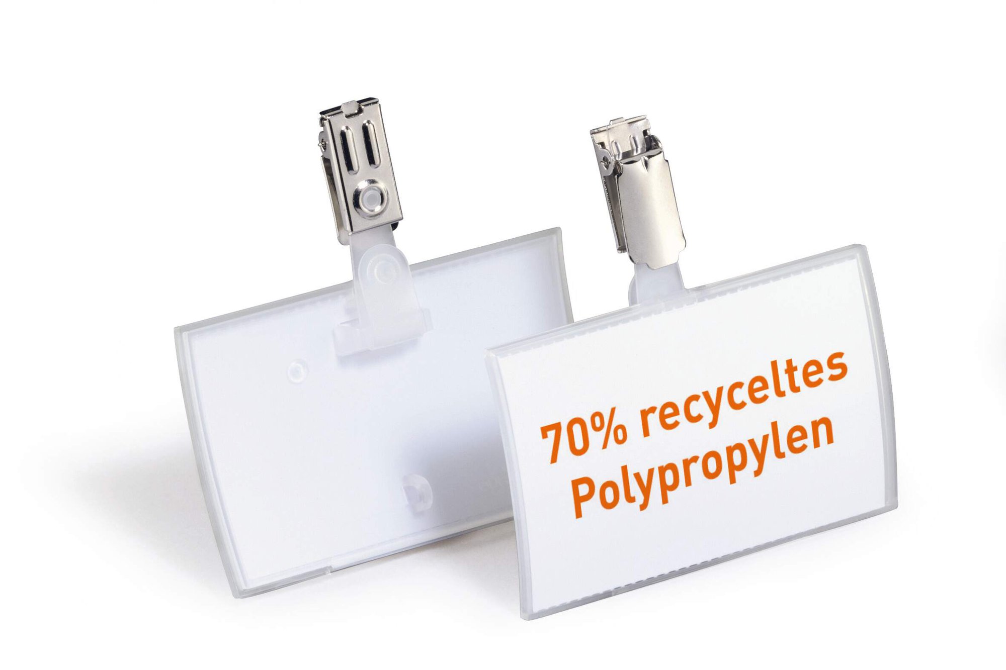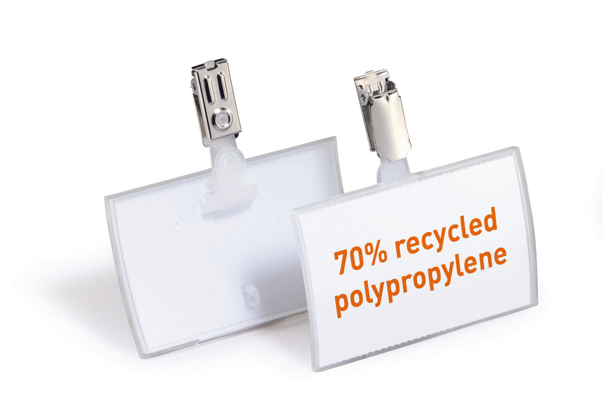 Modern frameless name badges made with recycled plastic, perfect for use in conferences, trade fairs or seminars. Our unique rotating clip fastener keeps the badge sitting vertically and features a clip cut-out for chains, badge reels and lanyards.<br><br>Say goodbye to fiddling with inserts thanks to our unique convex CLICK FOLD design.<br><br>Made with over 70% recycled polypropylene, 100% recyclable and environmentally friendly in accordance with ISO 14021.<br><br>Provided with 25 pre-cut blank insert cards<br>Compatible with printable inserts (product # 145502)<br><br>Insert size: 54 x 90 mm<br>Pack size: 25<br><br>Made in Germany and built to last